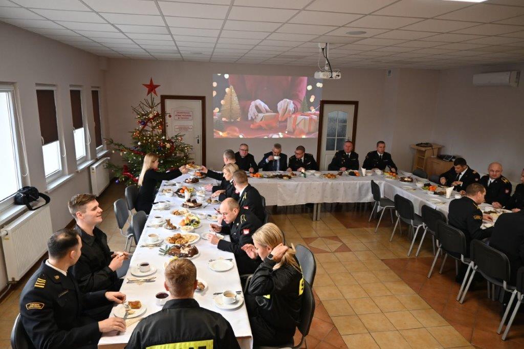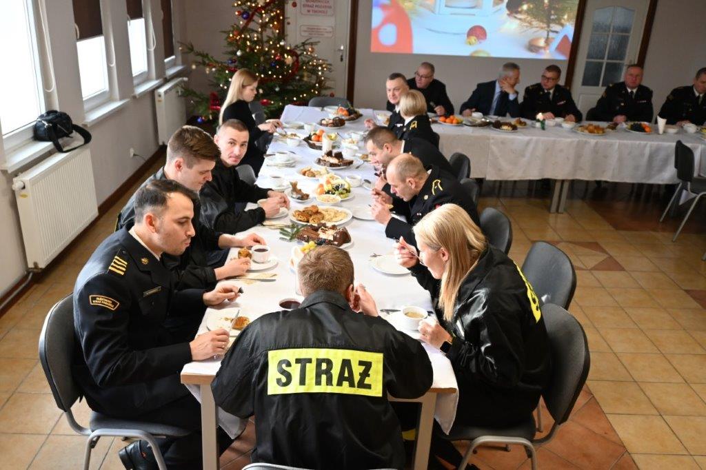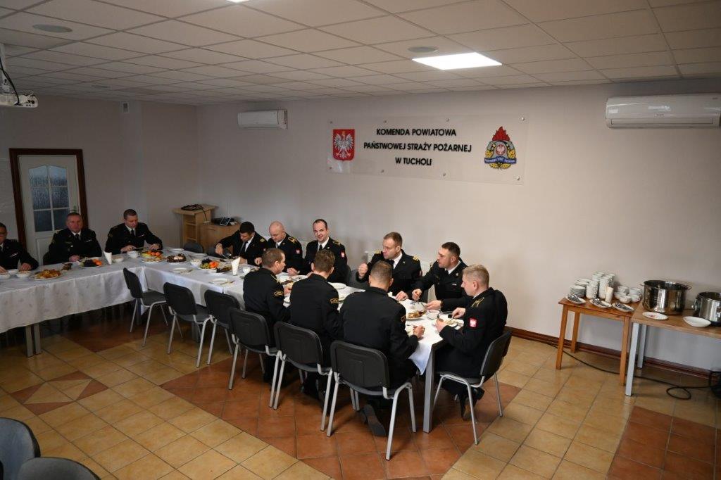 W środę 20 grudnia 2023 roku w Komendzie Powiatowej PSP w Tucholi odbyło się spotkanie wigilijne dla funkcjonariuszy i pracowników cywilnych. Na spotkanie przybyli Pan Tadeusz Kowalski Burmistrz Tucholi, druh Waldemar Kierzkowski Prezes Zarządu Oddziału Powiatowego ZOSP RP w Tucholi oraz ksiądz Jan Pałubicki Kapelan Powiatowy Strażaków. Po złożeniu życzeń uczestnicy odśpiewali kolędy oraz zasiedli do wspólnego posiłku.