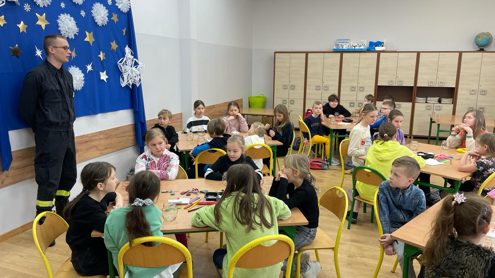 Strażacy podczas pogadanki z uczniami przedstawili niebezpieczne sytuacje, które mogą zdarzyć się zimą w pobliżu zbiorników wodnych, podczas przemieszczania się i przebywania w domu. Pogadanka poparta była różnego rodzaju wydarzeniami, w których funkcjonariusze uczestniczyli. Uczniowie dowiedzieli się w jaki sposób trzeba się zachować, gdy pod człowiekiem załamie się lód i jak postępować w wypadku pożaru, który może zdarzyć się w domu. Łącznie zostało przeprowadzonych 8 pogadanek, w których udział wzięło 188 uczniów i 26 opiekunów