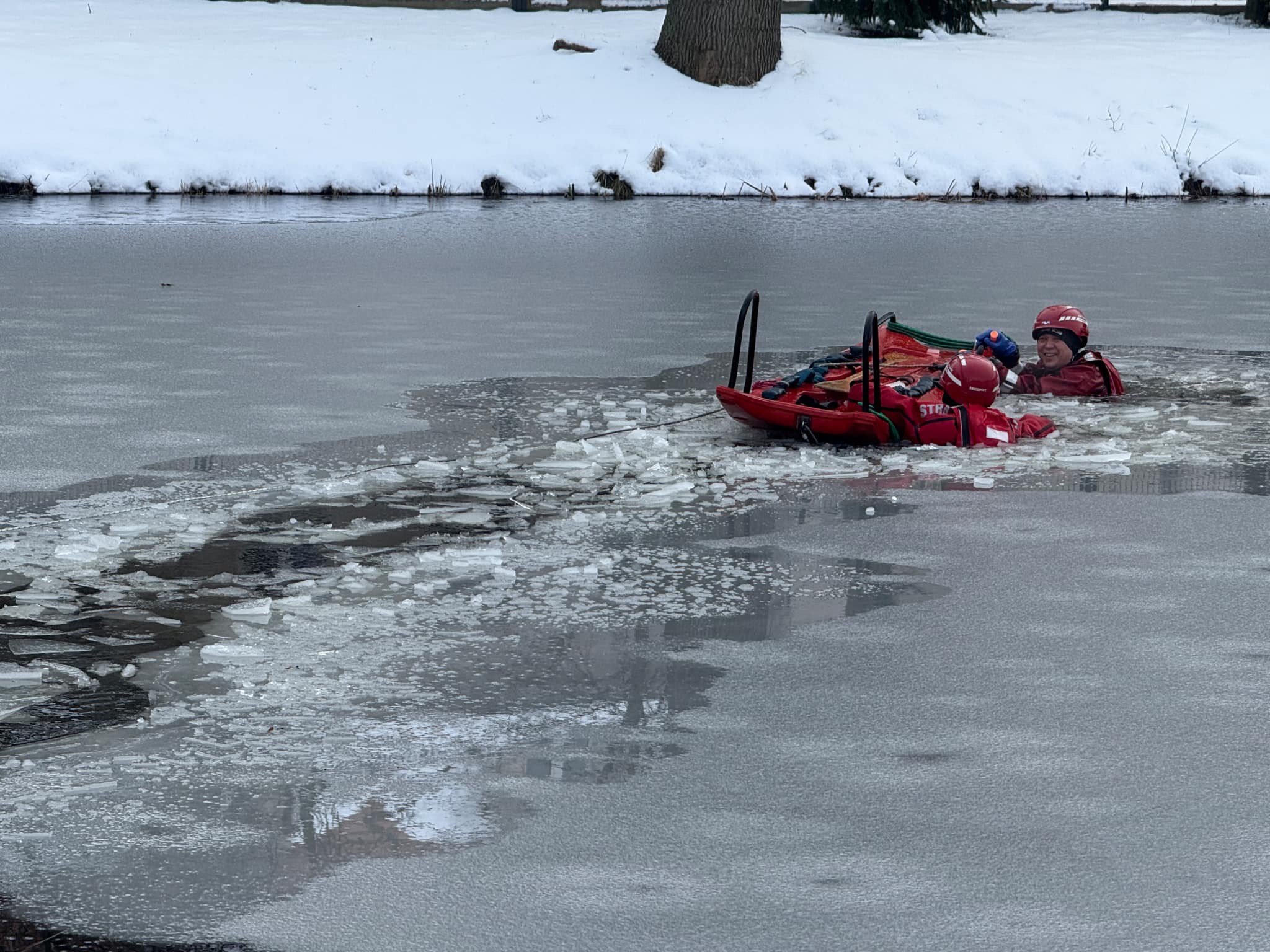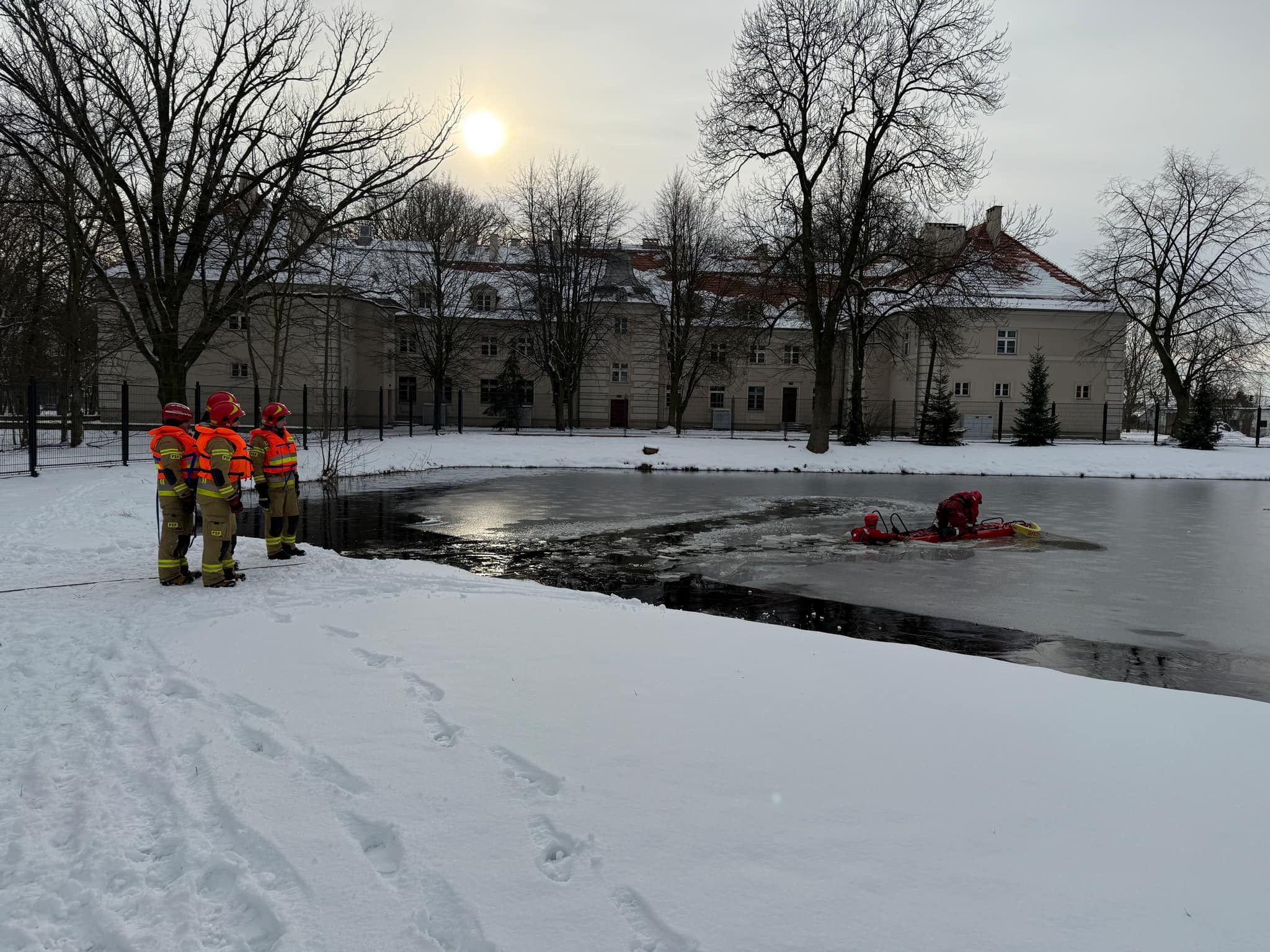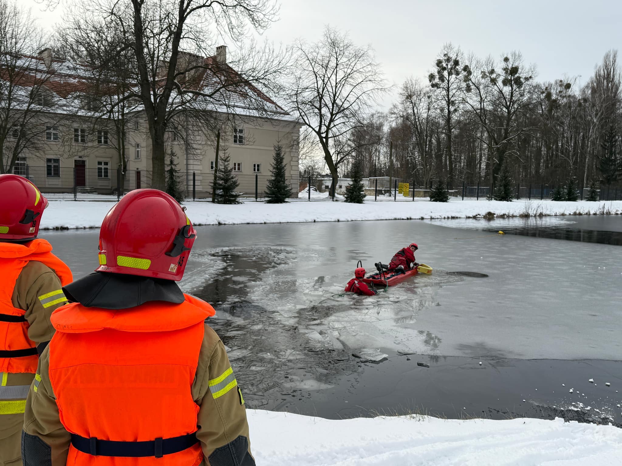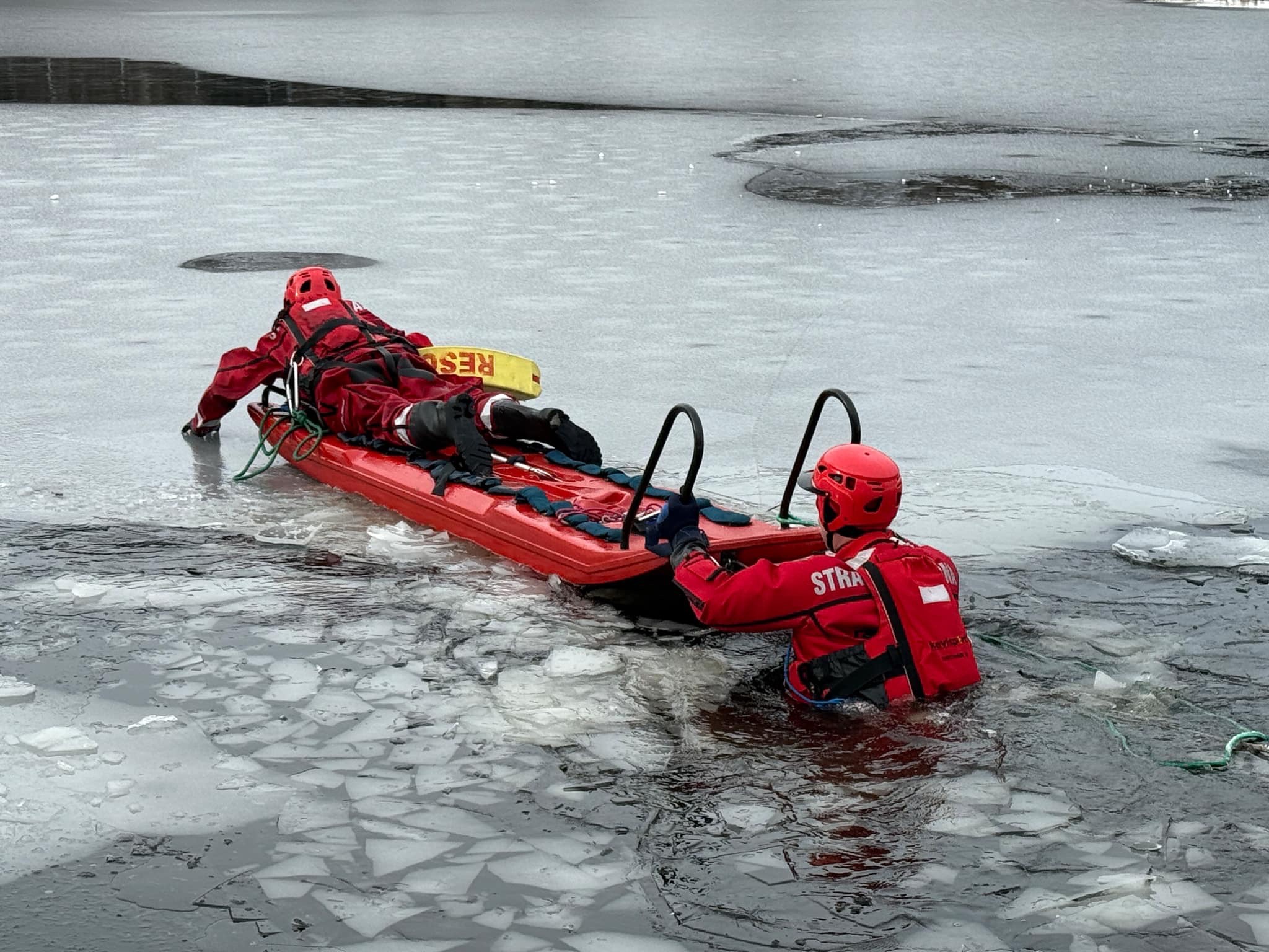 Podczas przeprowadzonych ćwiczeń strażacy doskonalili umiejętności podejmowania osób poszkodowanych z zamarzniętych akwenów wodnych, przy użyciu dedykowanych środków ochrony indywidualnej oraz sprzętu przeznaczonego do działań z zakresu ratownictwa lodowego.