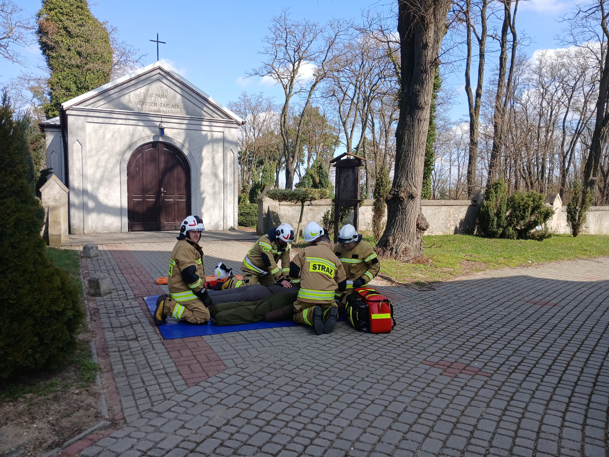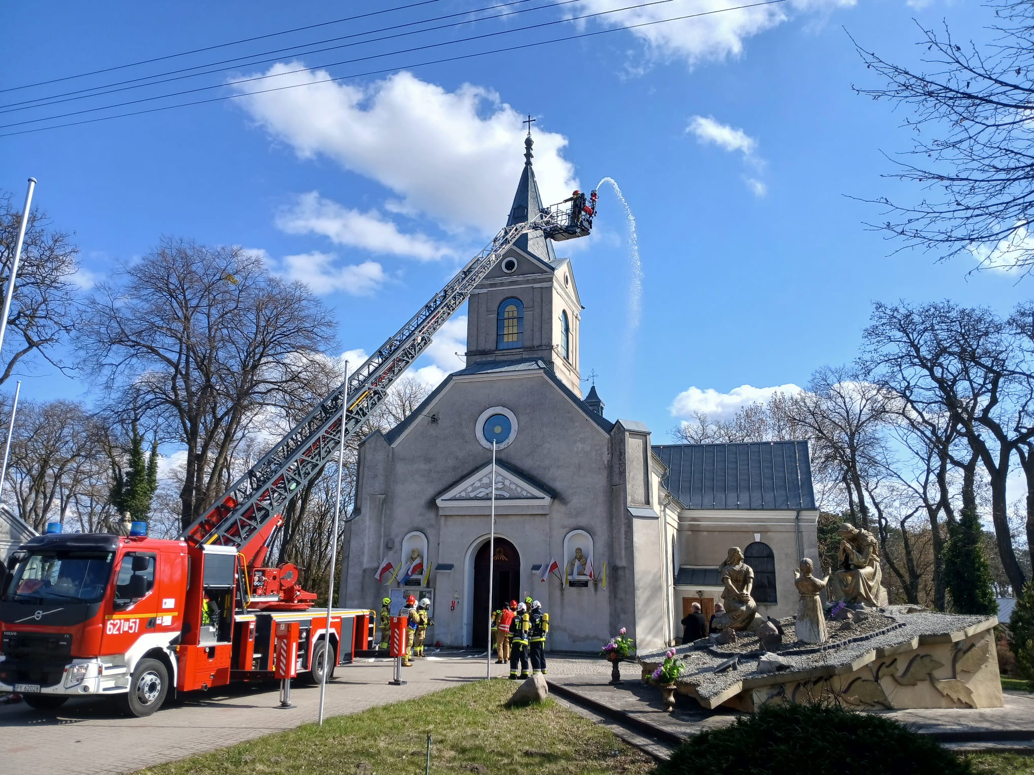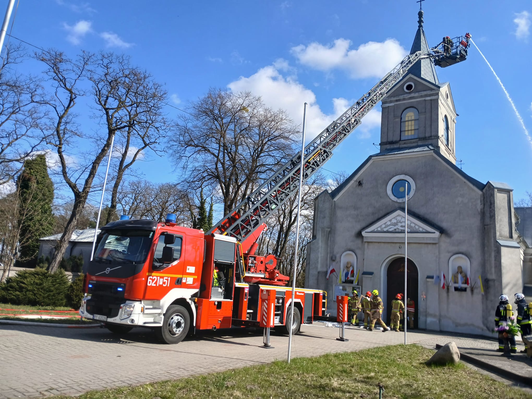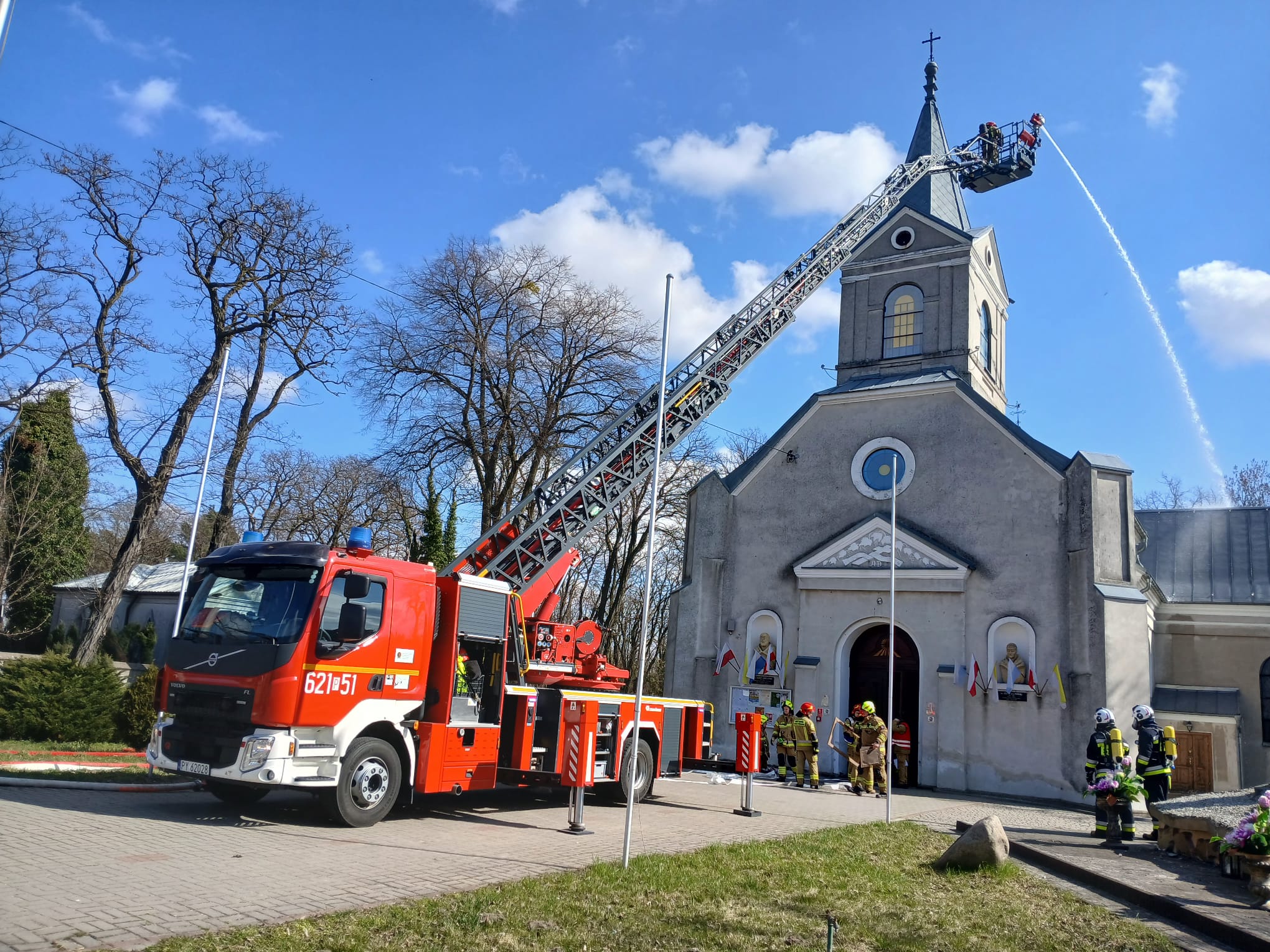Ćwiczenia Kościół - Sanktuarium Przemienienia Pańskiego w Galewie W poniedziałek, 30 marca, w miejscowości Galew przeprowadzono kompleksowe ćwiczenia ratowniczo-gaśnicze. Scenariusz zakładał pożar pod poszyciem dachu zabytkowego kościoła, w którym przebywały dwie osoby poszkodowane. W działaniach wzięło udział łącznie 6 zastępów straży pożarnej. Kluczowym elementem akcji było sprawienie drabiny mechanicznej SD 30 z JRG Turek oraz wprowadzenie rot ratowniczych do wnętrza obiektu w celu lokalizacji oraz ewakuacji osób poszkodowanych. Po udanej ewakuacji i udzieleniu KPP, strażacy skupili się na gaszeniu ogniska pożaru oraz – co niezwykle ważne w przypadku obiektów sakralnych – zabezpieczeniu dóbr kultury przed zniszczeniem. Po przeprowadzonych ćwiczeniach, dowódcy przeprowadzili rozpoznanie operacyjne budynku, co pozwoliło strażakom jeszcze lepiej poznać konstrukcję i drogi ewakuacyjne świątyni.