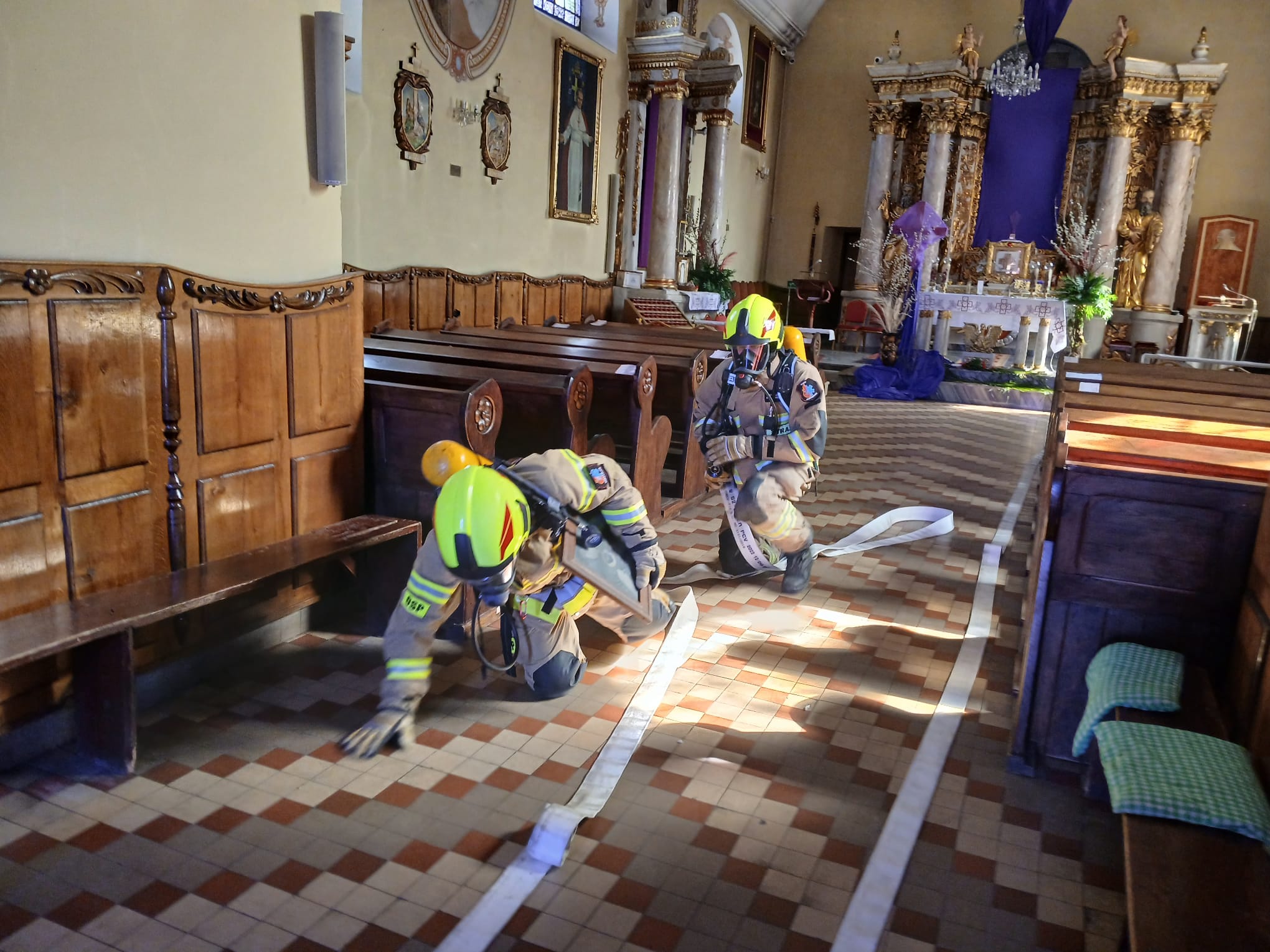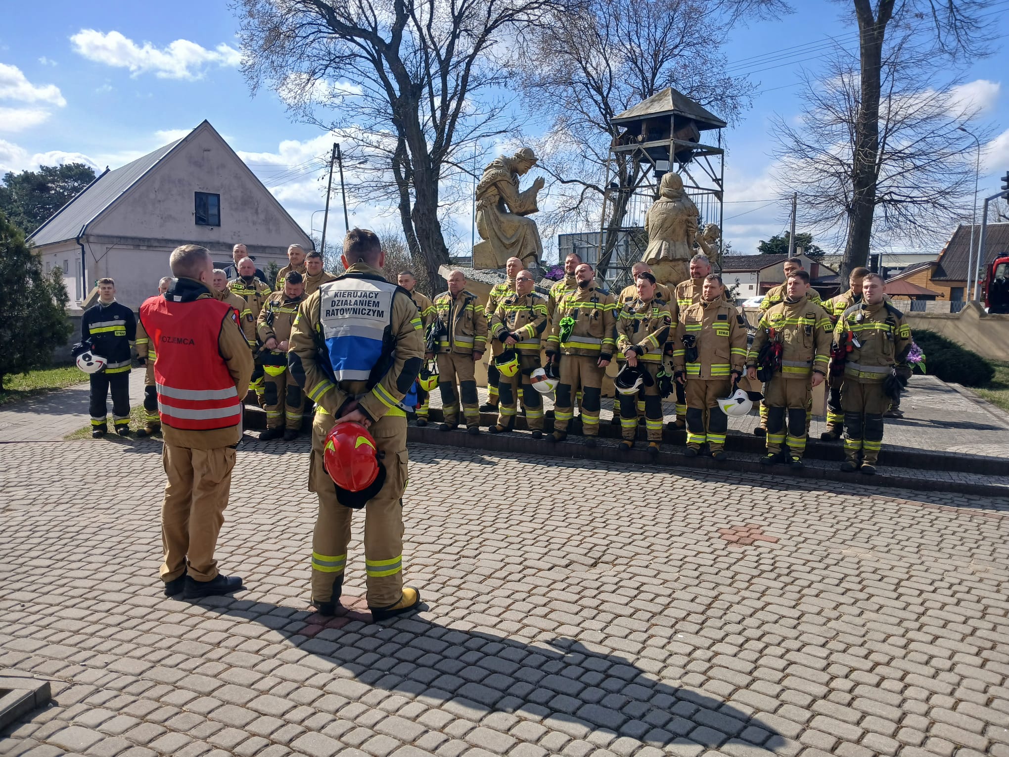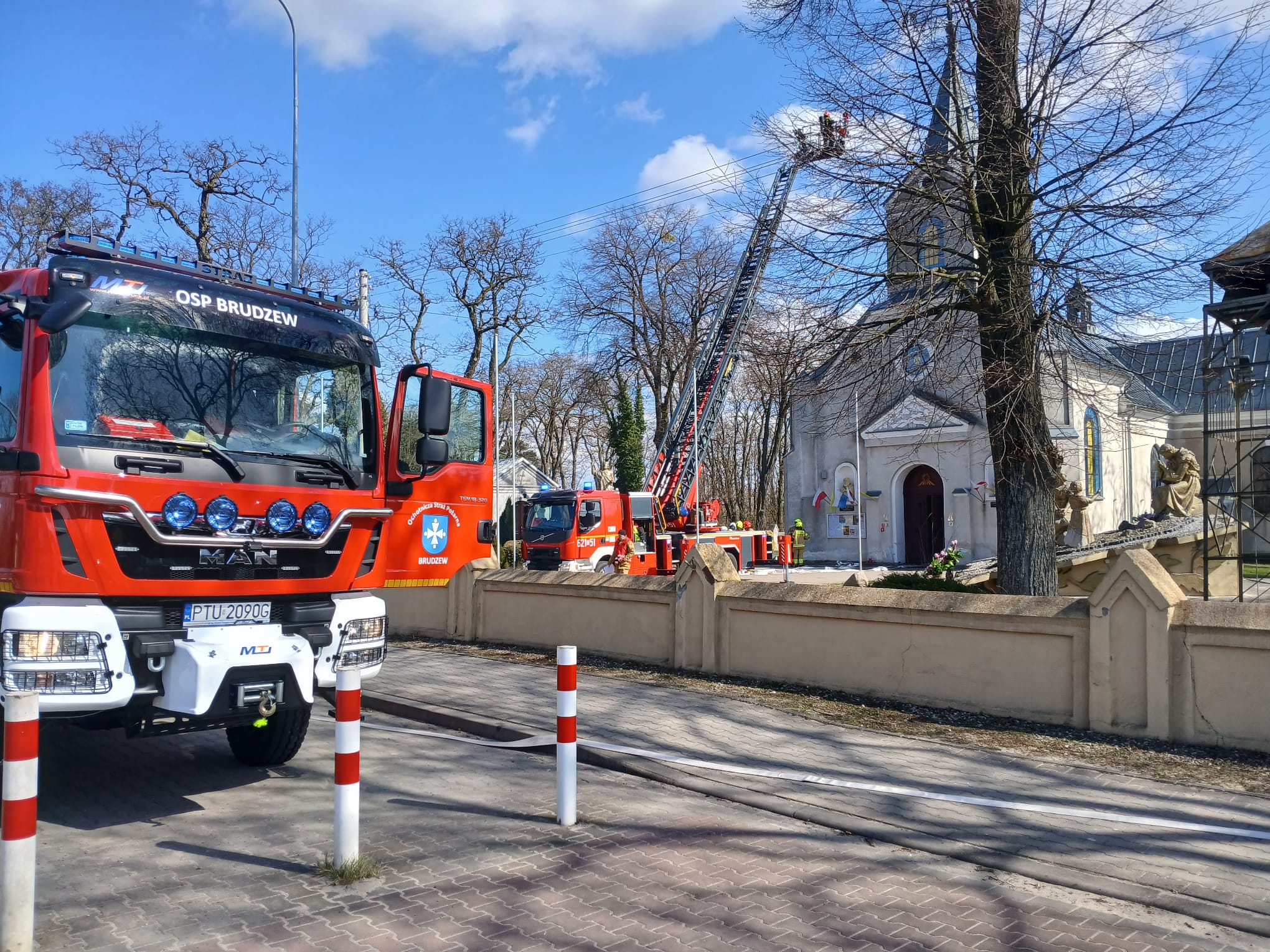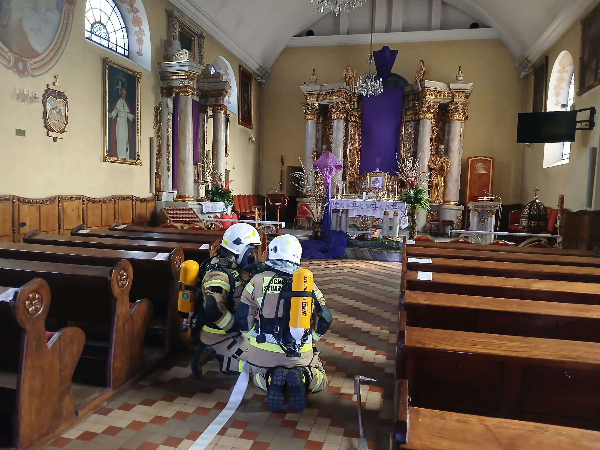 Ćwiczenia Kościół - Sanktuarium Przemienienia Pańskiego w Galewie W poniedziałek, 30 marca, w miejscowości Galew przeprowadzono kompleksowe ćwiczenia ratowniczo-gaśnicze. Scenariusz zakładał pożar pod poszyciem dachu zabytkowego kościoła, w którym przebywały dwie osoby poszkodowane. W działaniach wzięło udział łącznie 6 zastępów straży pożarnej. Kluczowym elementem akcji było sprawienie drabiny mechanicznej SD 30 z JRG Turek oraz wprowadzenie rot ratowniczych do wnętrza obiektu w celu lokalizacji oraz ewakuacji osób poszkodowanych. Po udanej ewakuacji i udzieleniu KPP, strażacy skupili się na gaszeniu ogniska pożaru oraz – co niezwykle ważne w przypadku obiektów sakralnych – zabezpieczeniu dóbr kultury przed zniszczeniem. Po przeprowadzonych ćwiczeniach, dowódcy przeprowadzili rozpoznanie operacyjne budynku, co pozwoliło strażakom jeszcze lepiej poznać konstrukcję i drogi ewakuacyjne świątyni.