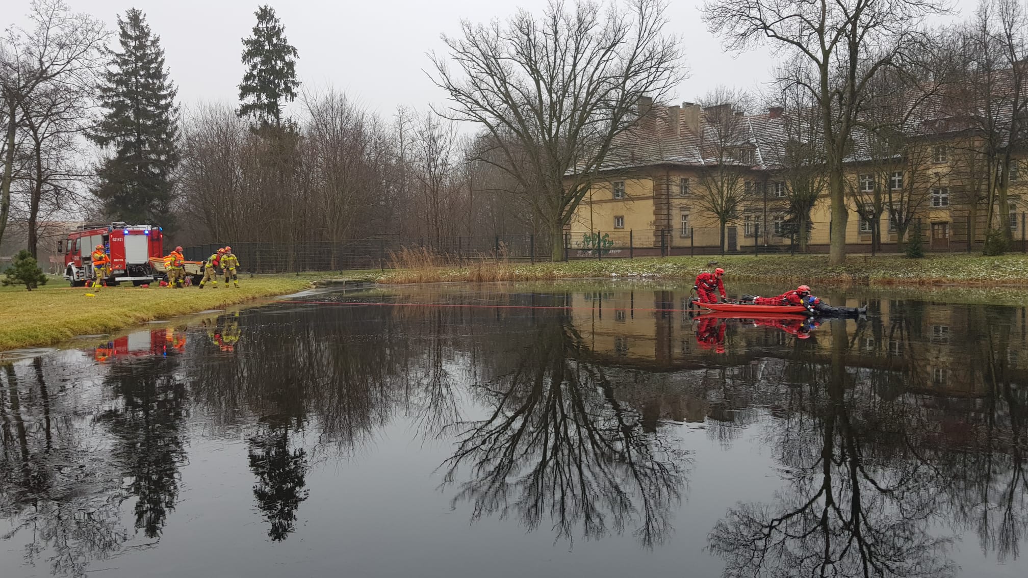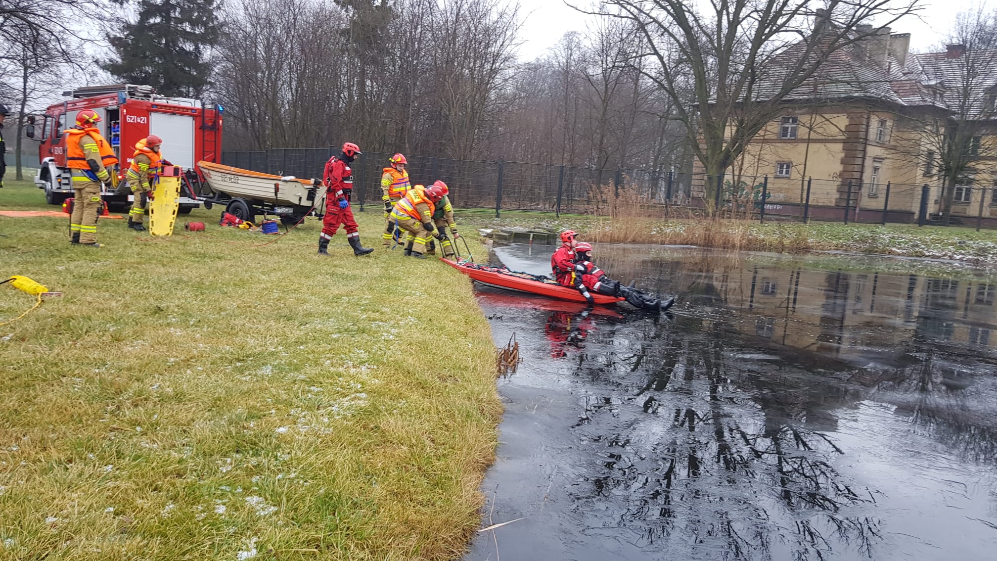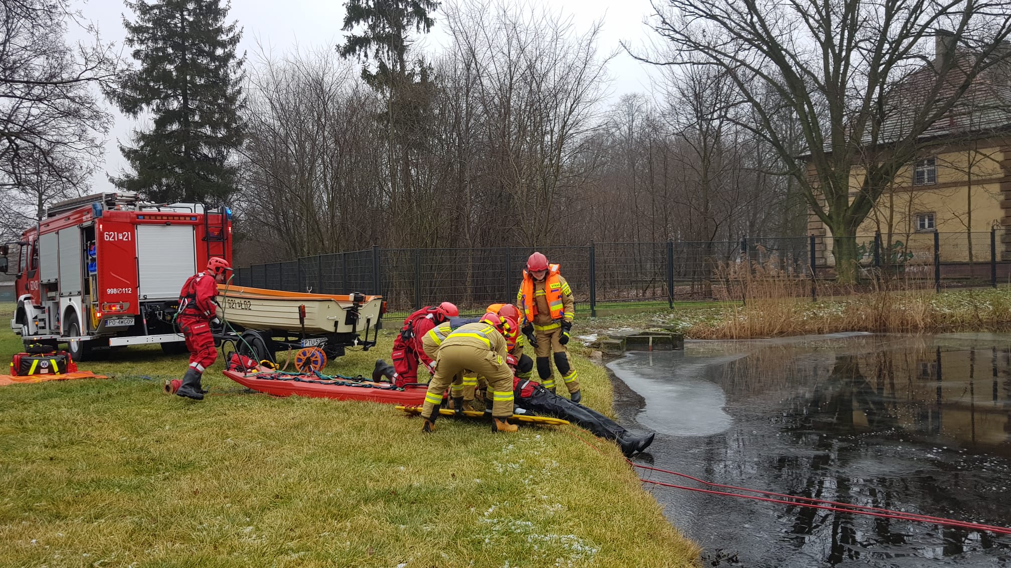 W dniach 12-14 stycznia br. funkcjonariusze Jednostki Ratowniczo-Gaśniczej w Turku w ramach doskonalenia zawodowego przeprowadzili ćwiczenia na osadniku wodnym zlokalizowanym na terenie Komendy Powiatowej PSP w Turku. Ćwiczenia odbyły się z wykorzystaniem specjalistycznego sprzętu. Tonącego podejmowano z wody przy użyciu sań lodowych, drabiny czy rzutki ratowniczej. Szczególną uwagę zwracano na właściwe zabezpieczenie ratowników, którzy byli ubrani w kombinezony służące do pracy w wodzie i wyposażeni w sprzęt asekuracyjny. Jednocześnie przypominamy o możliwości organizowania ślizgawek na terenie szkół, osiedli. Jednostki Państwowej Straży Pożarnej, w ramach akcji „Bezpieczne Lodowiska 2022”, pomogą w wylaniu lodowisk. Organizator ślizgawki powinien wcześniej odpowiednio przygotować teren oraz mieć pozwolenia od właściciela terenu na utworzenie lodowiska i na pobór wody. Zamarznięte stawy, jeziora i rzeki zawsze są niebezpieczne. Niefrasobliwość dorosłych oraz pozostawianie dzieci bez opieki, zbiera co roku śmiertelne żniwo. Mimo ostrzeżeń służb ratunkowych, co roku pod lodem ginie kilkanaście osób.