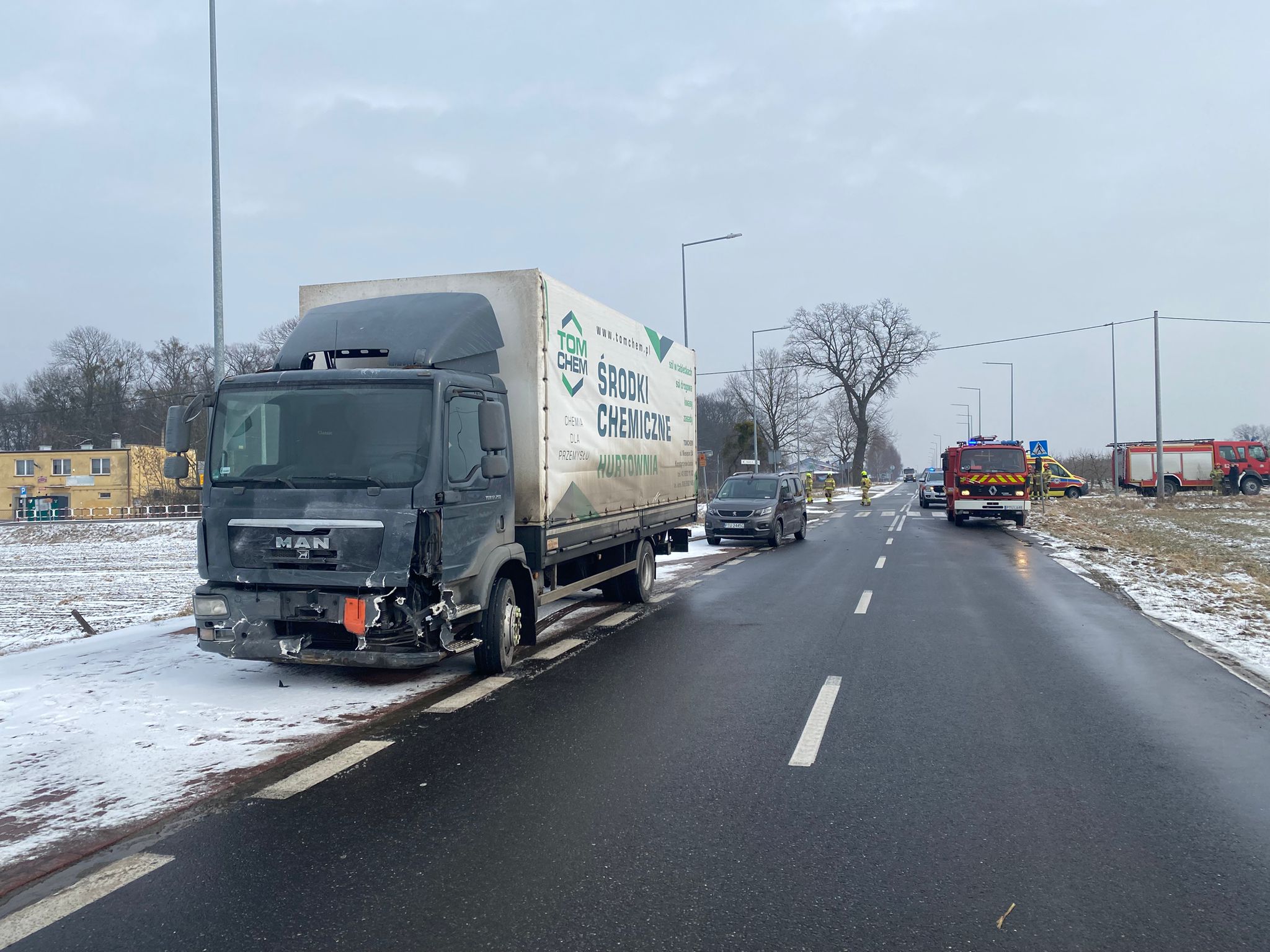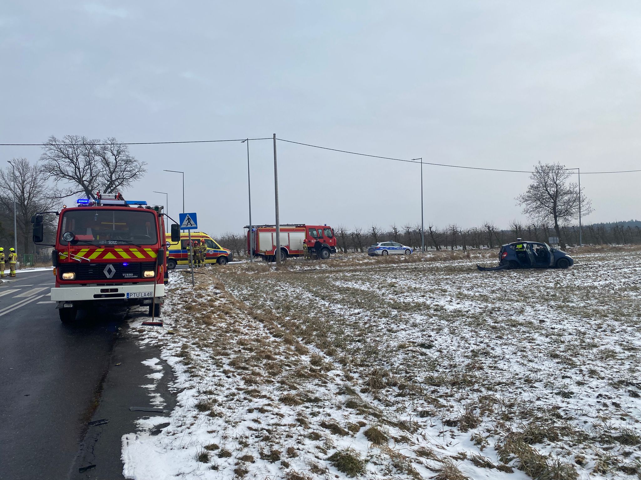 W dniu 17.02.2026r.o godz. 11.46 do Stanowiska Kierowania KP PSP w Turku wpłynęło zgłoszenie o wypadku drogowym w Piętnie gmina Tuliszków. Doszło tam do zderzenia osobowego Mercedesa z ciężarowym Manem. W wyniku uderzenia samochód osobowy wypadł z drogi, natomiast pojazd ciężarowy zatrzymał się w obrębie przystanku autobusowego. Po przybyciu na miejsce strażacy stwierdzili, że jeden z uczestników jest uwięziony w rozbitym aucie. Ratownicy, po zabezpieczeniu i całkowitym zablokowaniu drogi, wykorzystali narzędzia hydrauliczne, aby wykonać dostęp do przytomnego kierowcy.