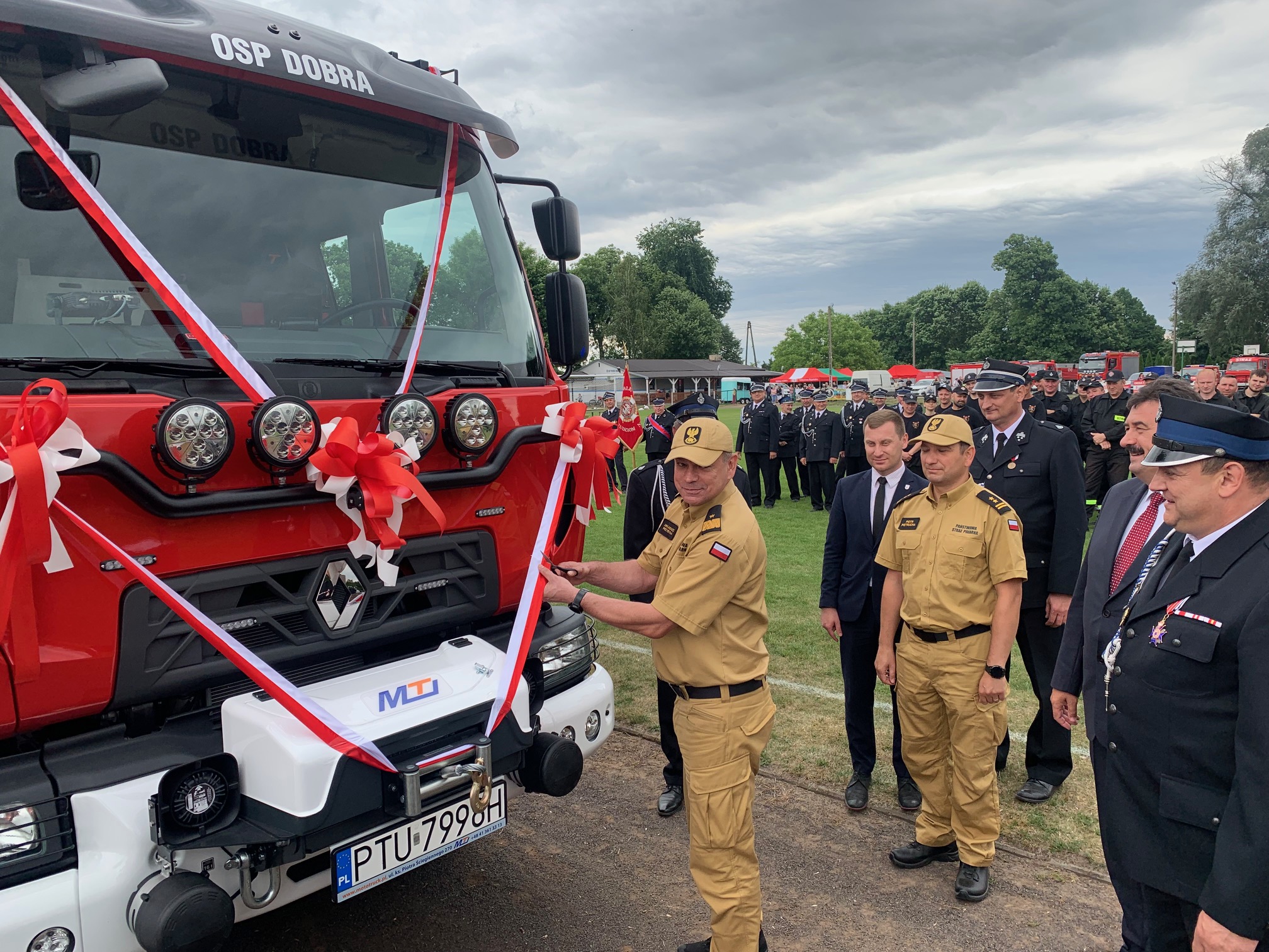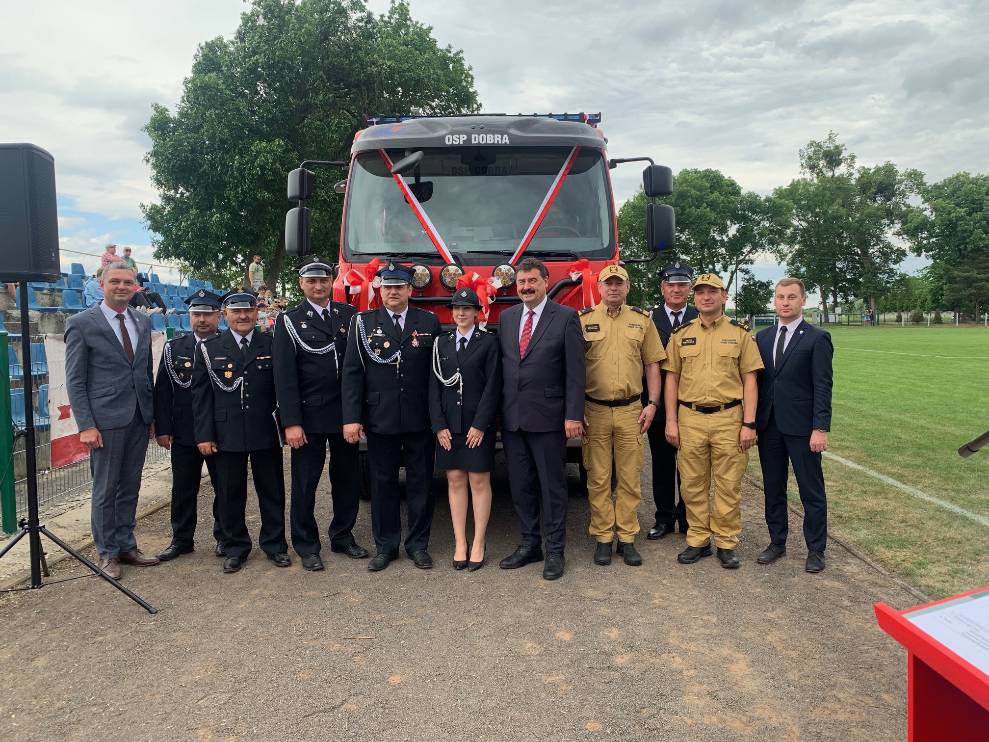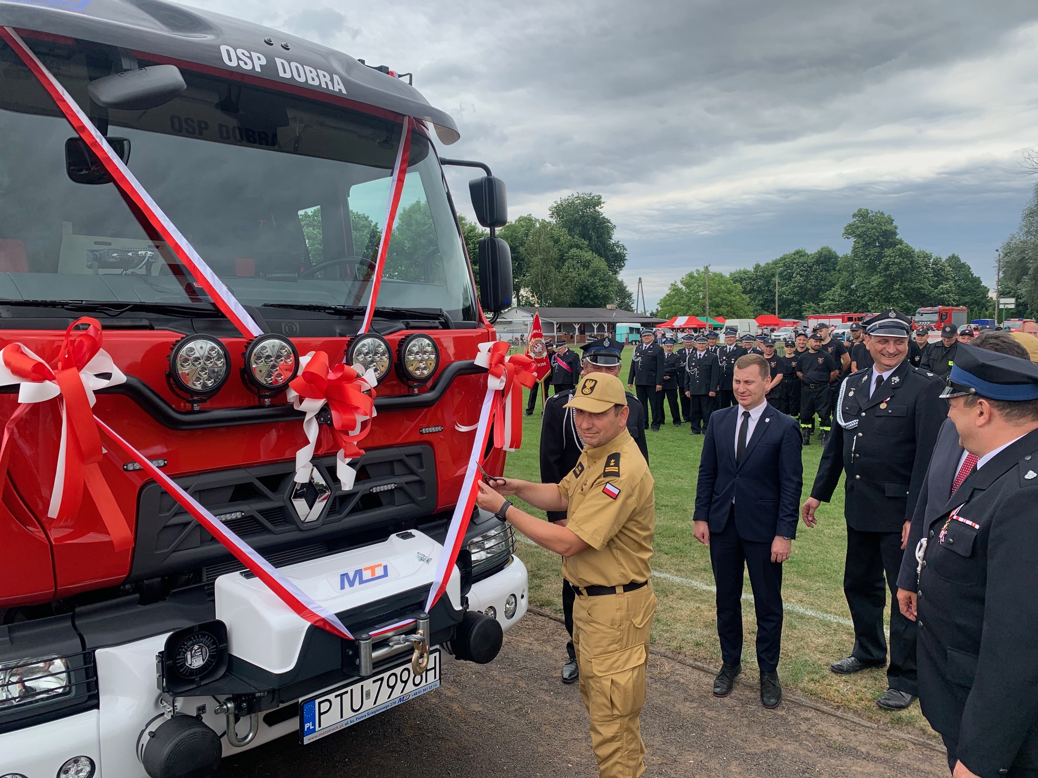 Uroczystego przekazania druhom kluczy i dokumentów do auta dokonali: Sekretarz Stanu w Ministerstwie Rolnictwa i Rozwoju Wsi - Poseł na Sejm RP Ryszard Bartosik, Zastępca Komendanta Głównego PSP nadbryg. Arkadiusz Przybyła, Komendant Powiatowy PSP w Turku bryg. Piotr Pietrucha, Burmistrz Dobrej – Tadeusz Gebler, Przewodniczący Rady Miejskiej w Dobrej Tomasz Gil oraz Prezes Zarządu Oddziału Miejsko-Gminnego ZOSP RP dh Piotr Gebler.