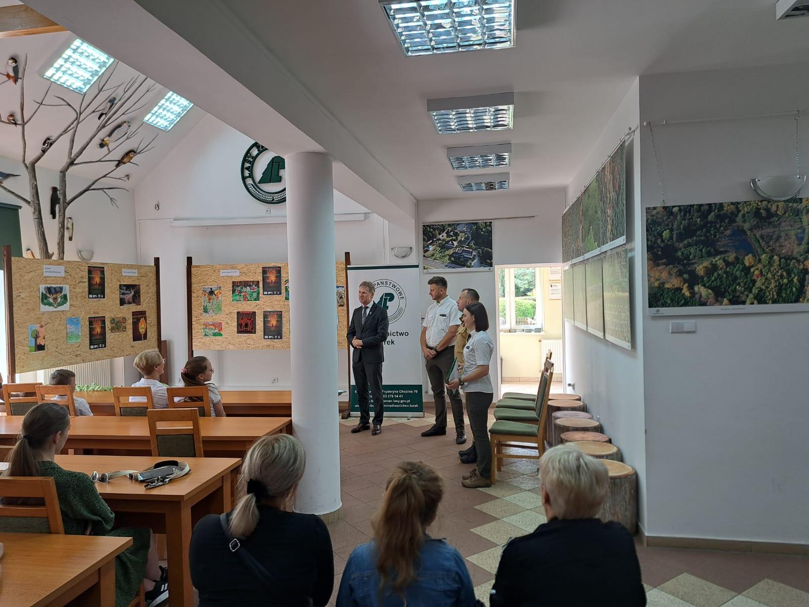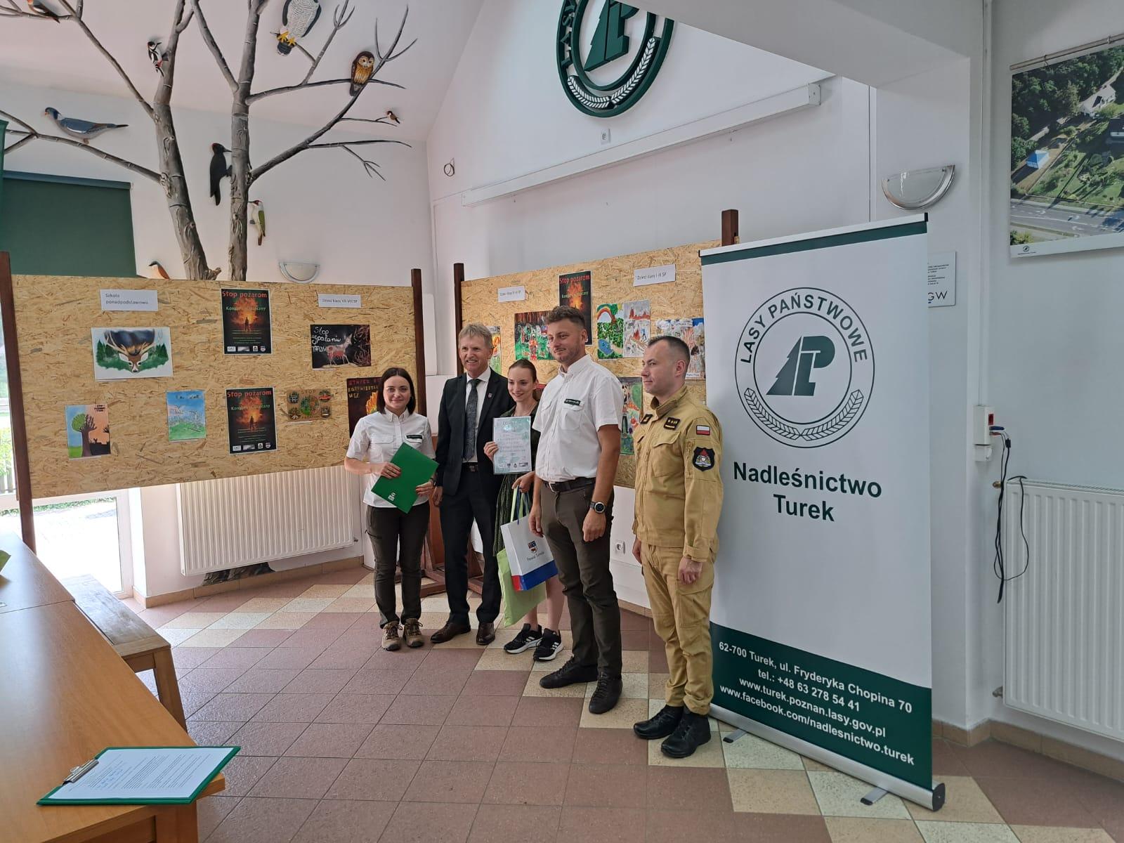 Leśnicy z Nadleśnictwa Turek we współpracy z Komendą Powiatową PSP w Turku po raz kolejny włączyli się w kampanię społeczną „Stop pożarom traw” prowadzoną przez Komendę Główną Państwowej Straży Pożarnej. Patronat nad konkursem objęli Starosta Turecki oraz Komendant Powiatowy Państwowej Straży Pożarnej w Turku. Celem konkursu było zwrócenie uwagi społeczeństwa na szkodliwość wiosennego wypalania pozostałości roślinnych, nieużytków, a także uświadomienie zagrożeń, jakie niesie za sobą proceder „wypalania traw” zarówno dla środowiska przyrodniczego, jak i zdrowia i życia człowieka. Konkurs polegał na wykonaniu pracy plastycznej – technika dowolna (z wyłączeniem prac przestrzennych). Zgodnie z regulaminem konkursu w konkursie wzięli udział uczniowie szkół podstawowych oraz ponadpodstawowych powiatu tureckiego, w 4 kategoriach wiekowych. Po przeprowadzeniu pierwszego etapu konkursu szkoły przekazały do Nadleśnictwa łącznie 93 prace konkursowe. Komisja konkursowa dokonała oceny nadesłanych prac i wyłoniła laureatów konkursu w poszczególnych kategoriach wiekowych. Po wręczeniu nagród i dyplomów uczestnicy spotkania mogli zobaczyć jak działa Punkt Alarmowo-Dyspozycyjny w Nadleśnictwie Turek, a także wziąć udział w pokazie wozu strażackiego oraz przypomnieć sobie jak prawidłowo udzielić pierwszej pomocy osobie poszkodowanej. Uczestnikom konkursu jaki opiekunom pokaz sprzętu do działań gaśniczych w obszarach leśnych oraz udzielenia pierwszej pomocy zaprezentowali funkcjonariusze Jednostki Ratowniczo-Gaśniczej w Turku.
