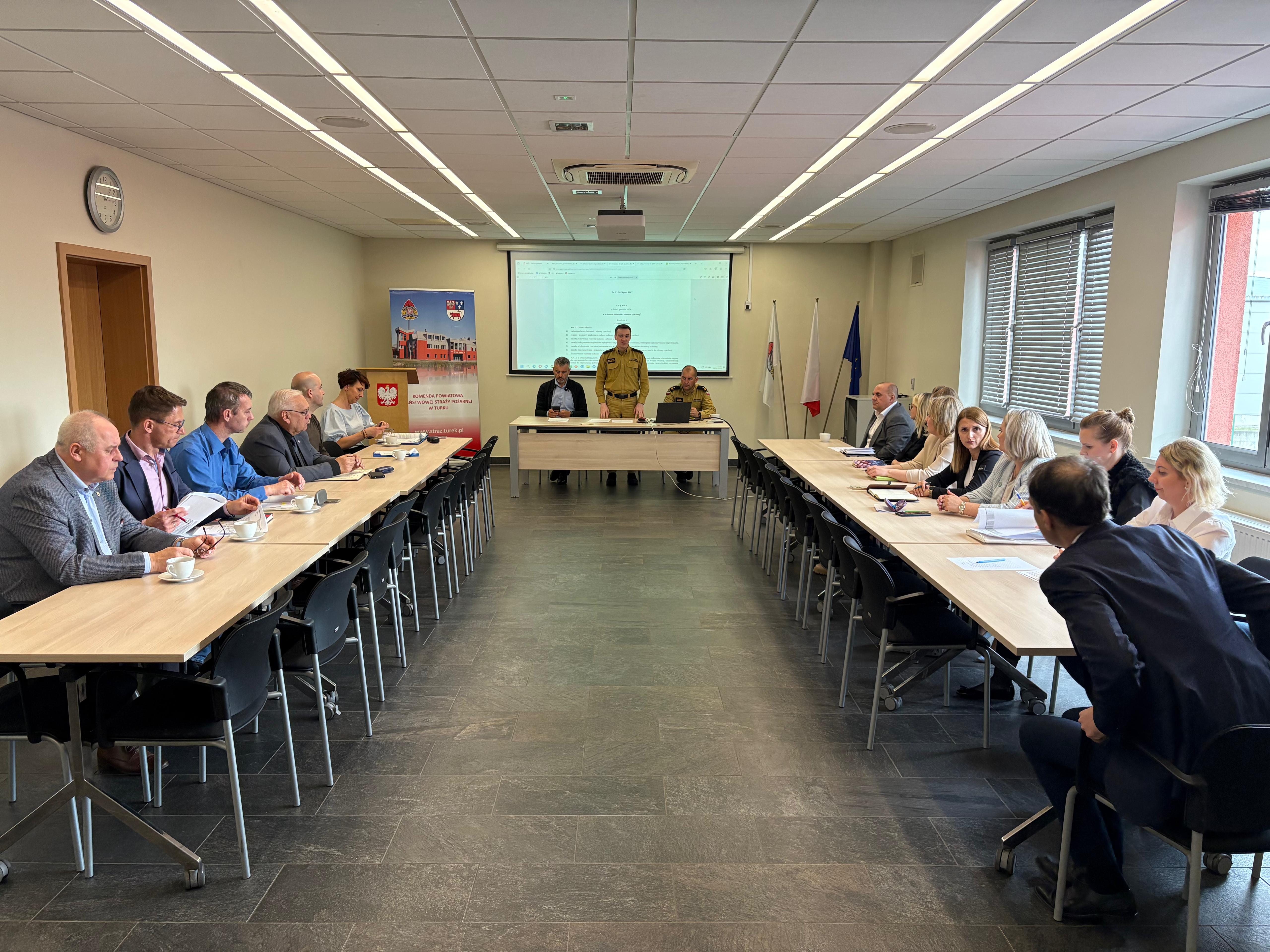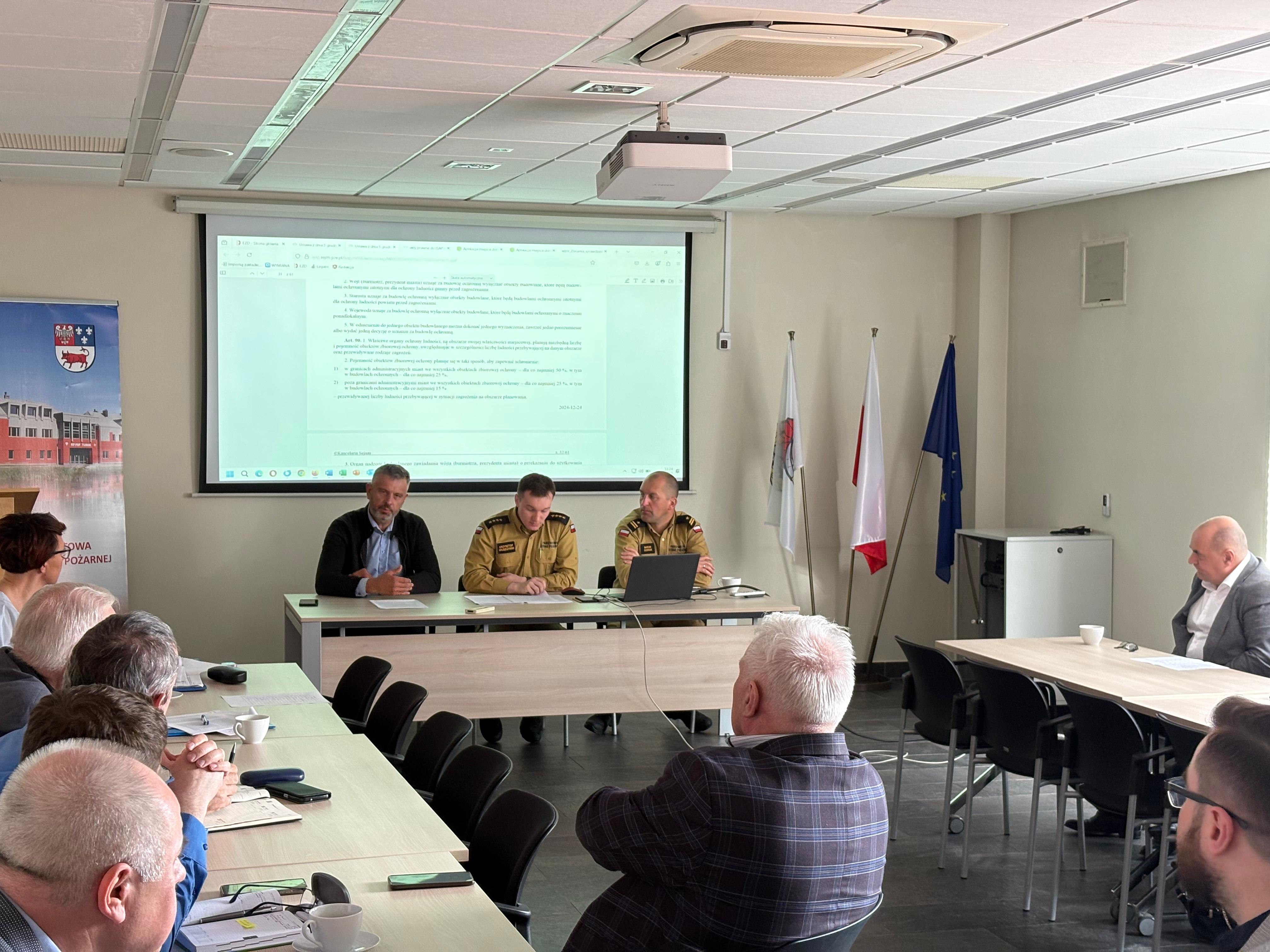Spotkanie miało na celu omówienie zadań spoczywających na Państwowej Straży Pożarnej, Powiatowym Inspektorze Nadzoru Budowlanego oraz samorządach terytorialnych, w związku z koniecznością zapewnienia obiektów zbiorowej ochrony dla mieszkańców powiatu tureckiego. Zadanie to zostało ujęte w ustawie o ochronie ludności i obronie cywilnej z dnia 5 grudnia 2024 roku. Podczas spotkania omówiono również szereg innych aspektów zawartych w ww. ustawie oraz określono zasady współpracy pomiędzy podmiotami a samorządami w przedmiotowej sprawie.