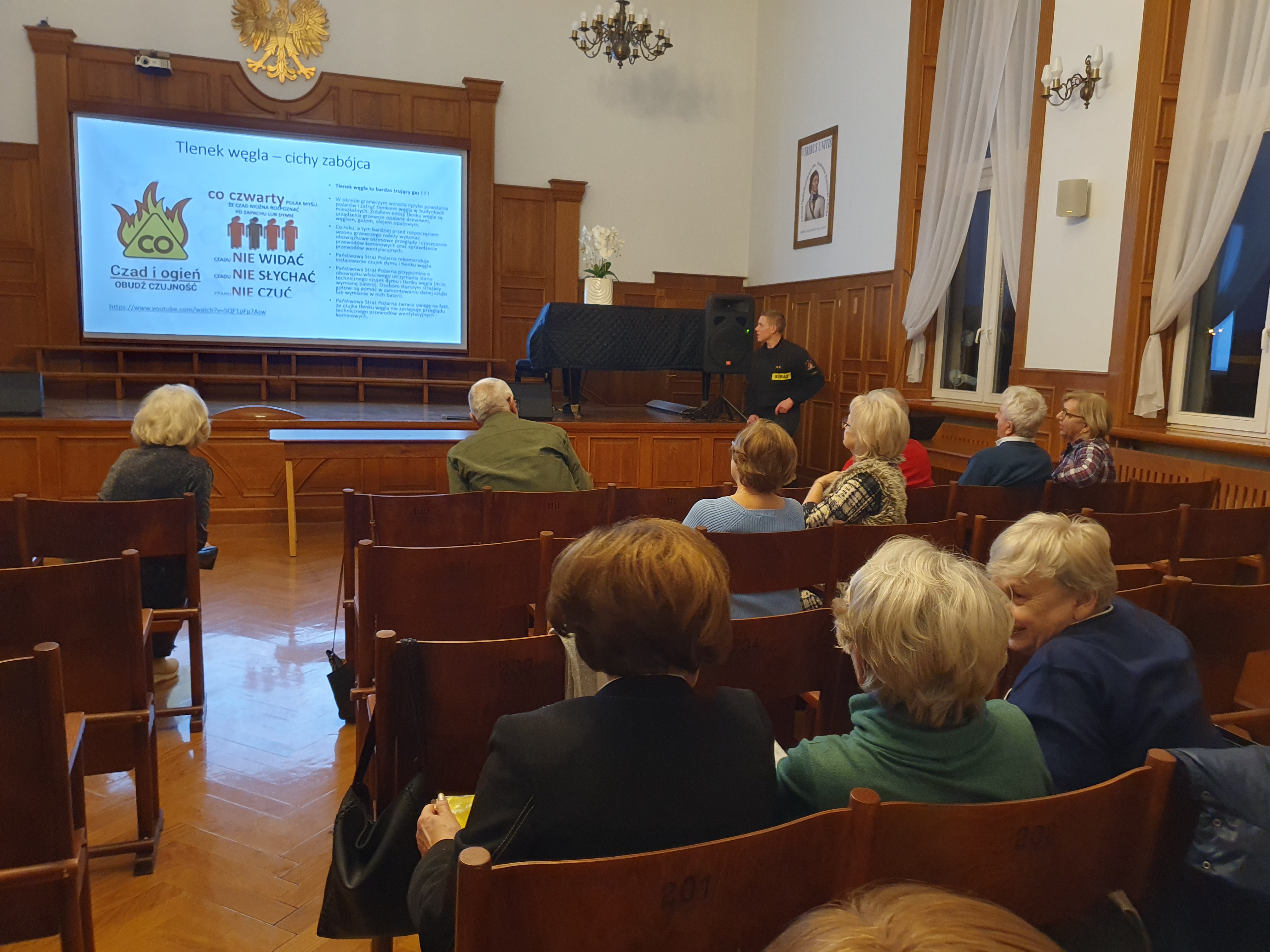 Podczas spotkania przedstawiono zagrożenia, które mogą spotkać seniorów w życiu codziennym: tlenek węgla, eksploatacji urządzeń elektrycznych, eksploatacja urządzeń gazowych. Zaprezentowano działanie czujki tlenku węgla oraz dymu. Przypomniano również o obowiązku dokonywania przeglądów wynikających z prawa budowlanego.