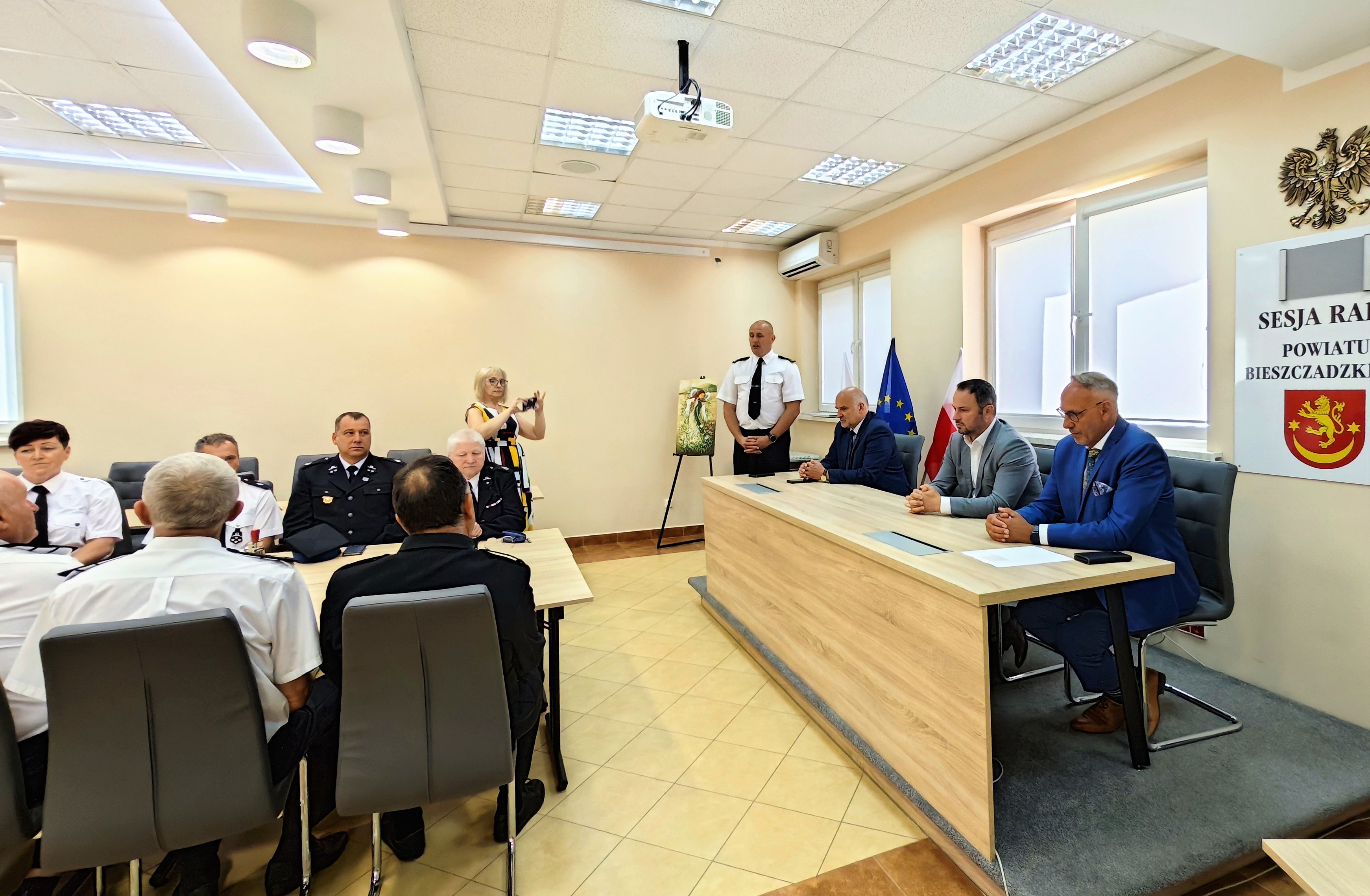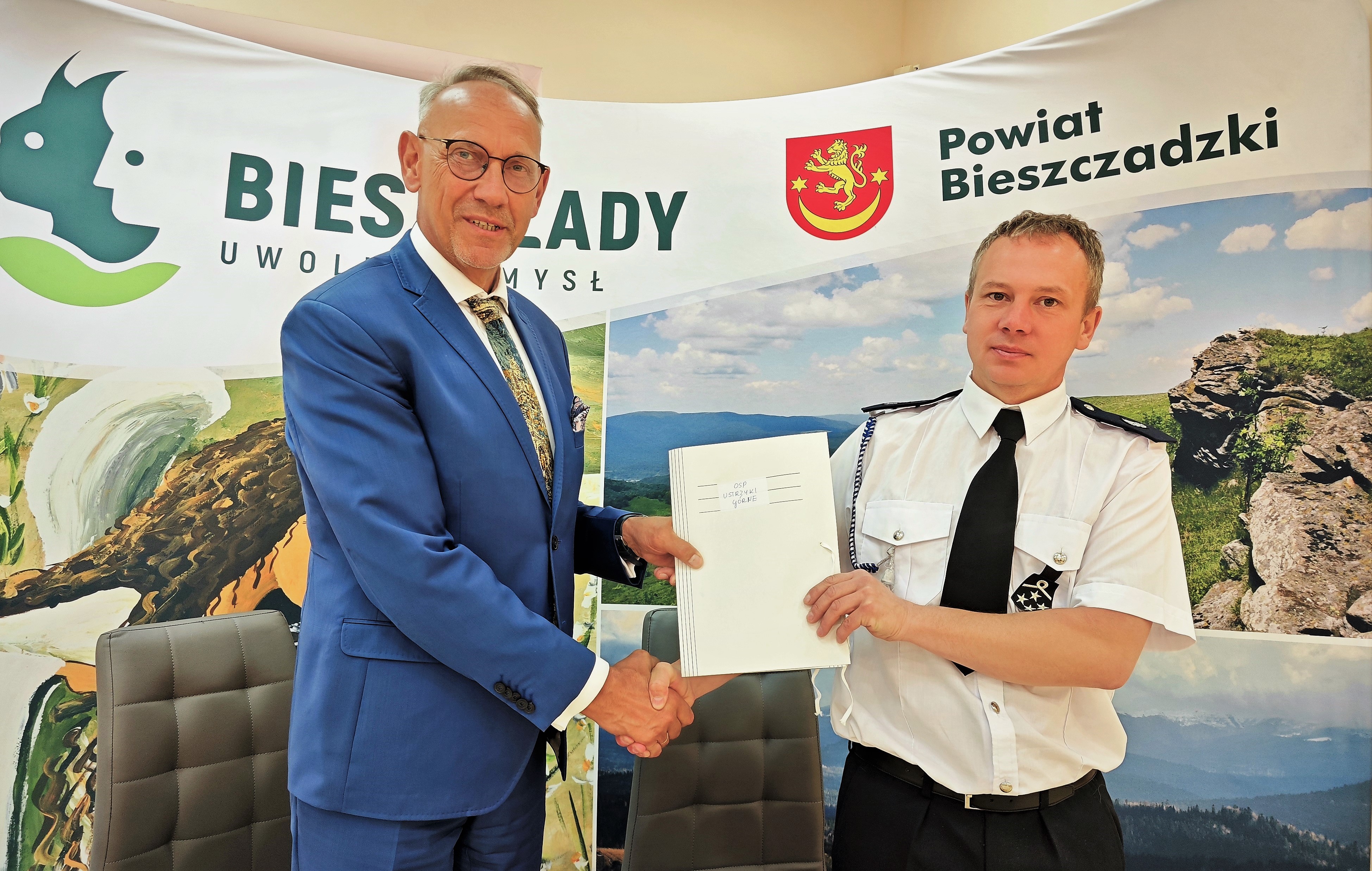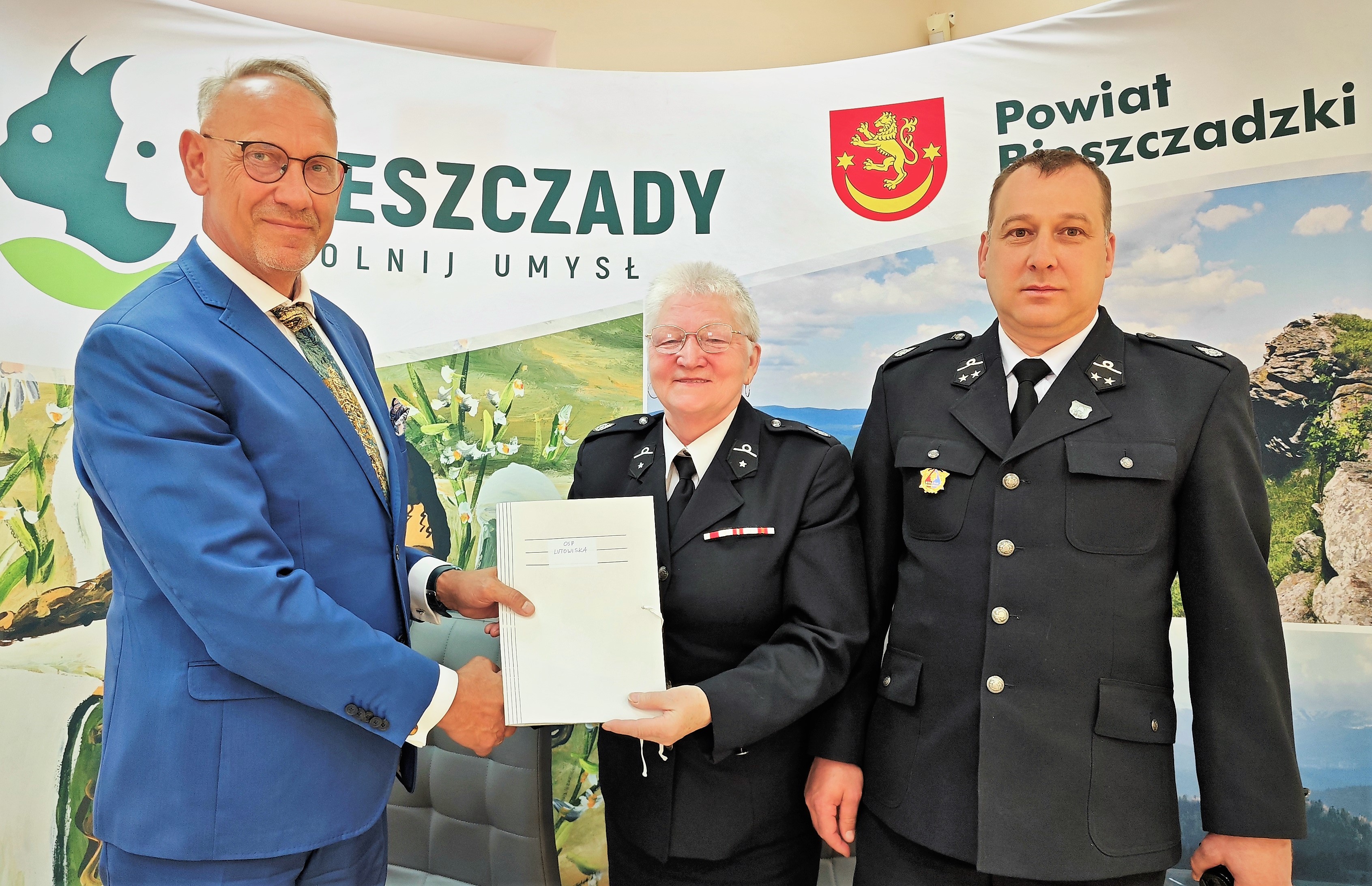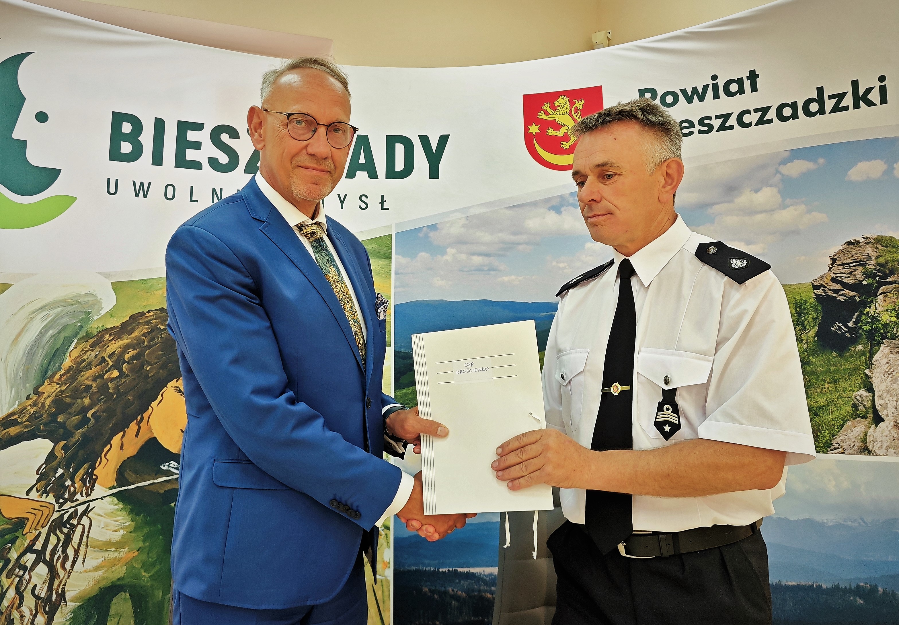1 czerwca w siedzibie starostwa powiatowego w Ustrzykach Dolnych miało miejsce wręczenie decyzji dotyczących przyznania środków finansowych w ramach programu Wojewódzkiego Funduszu Ochrony Środowiska i Gospodarki Wodnej pn. Dofinansowanie zakupu sprzętu i wyposażenia jednostek Ochotniczych Straży Pożarnych – 2023 r. Decyzje wręczał Prezes Zarządu WOŚiGW Pan Adam Skiba.