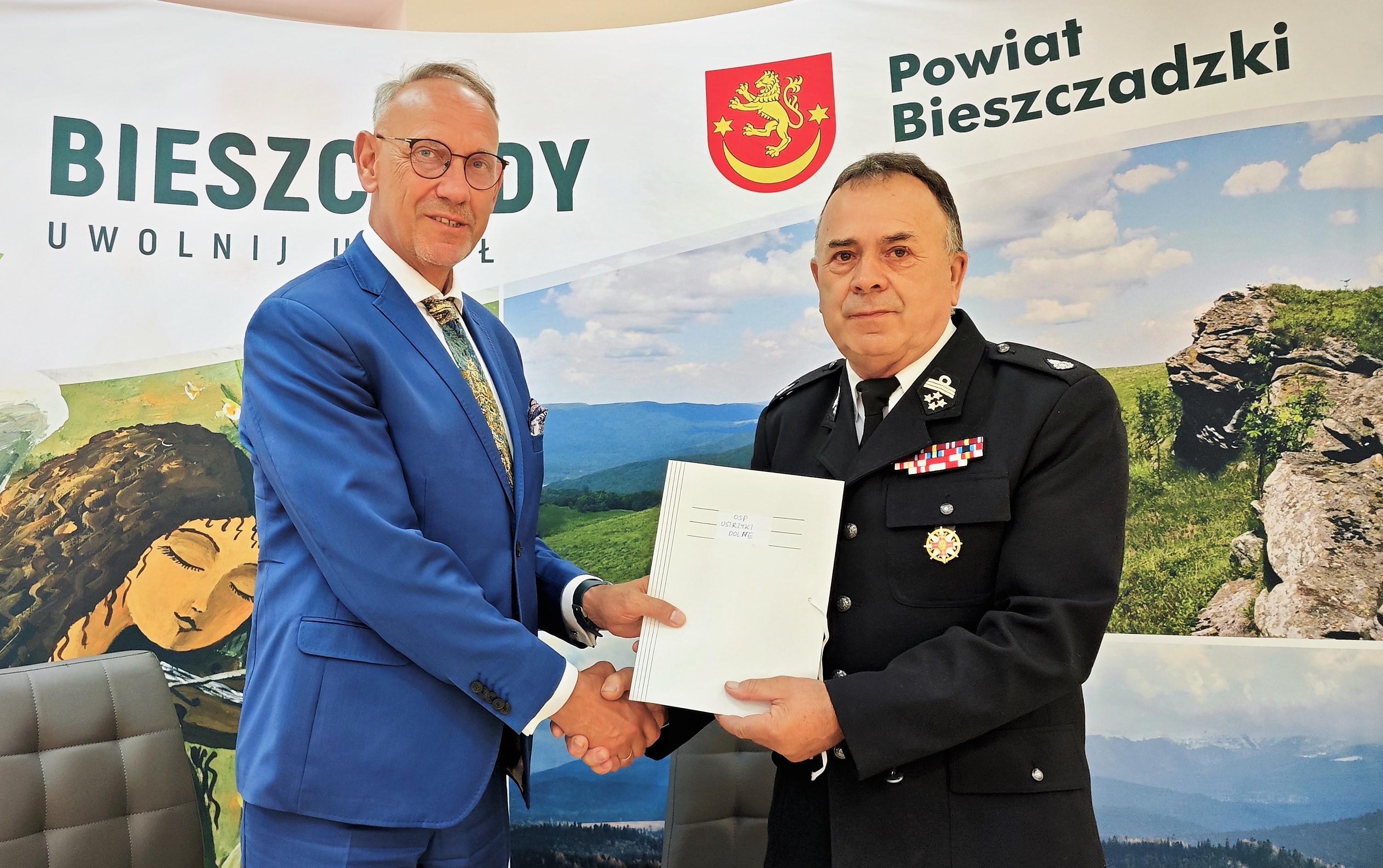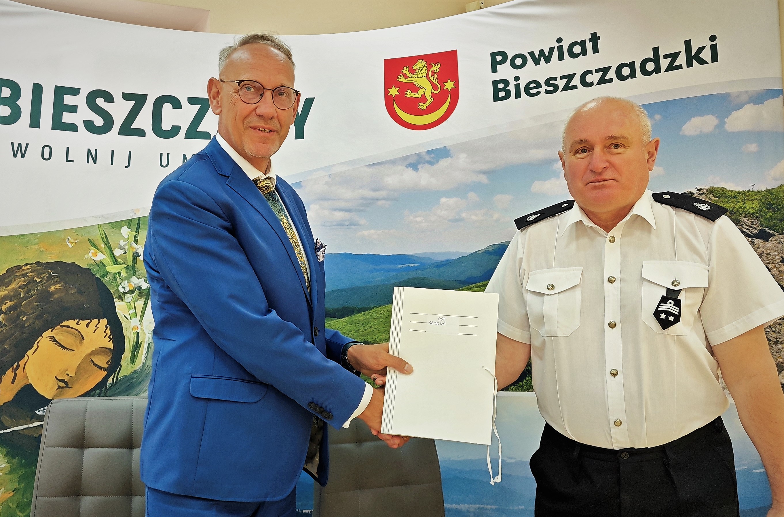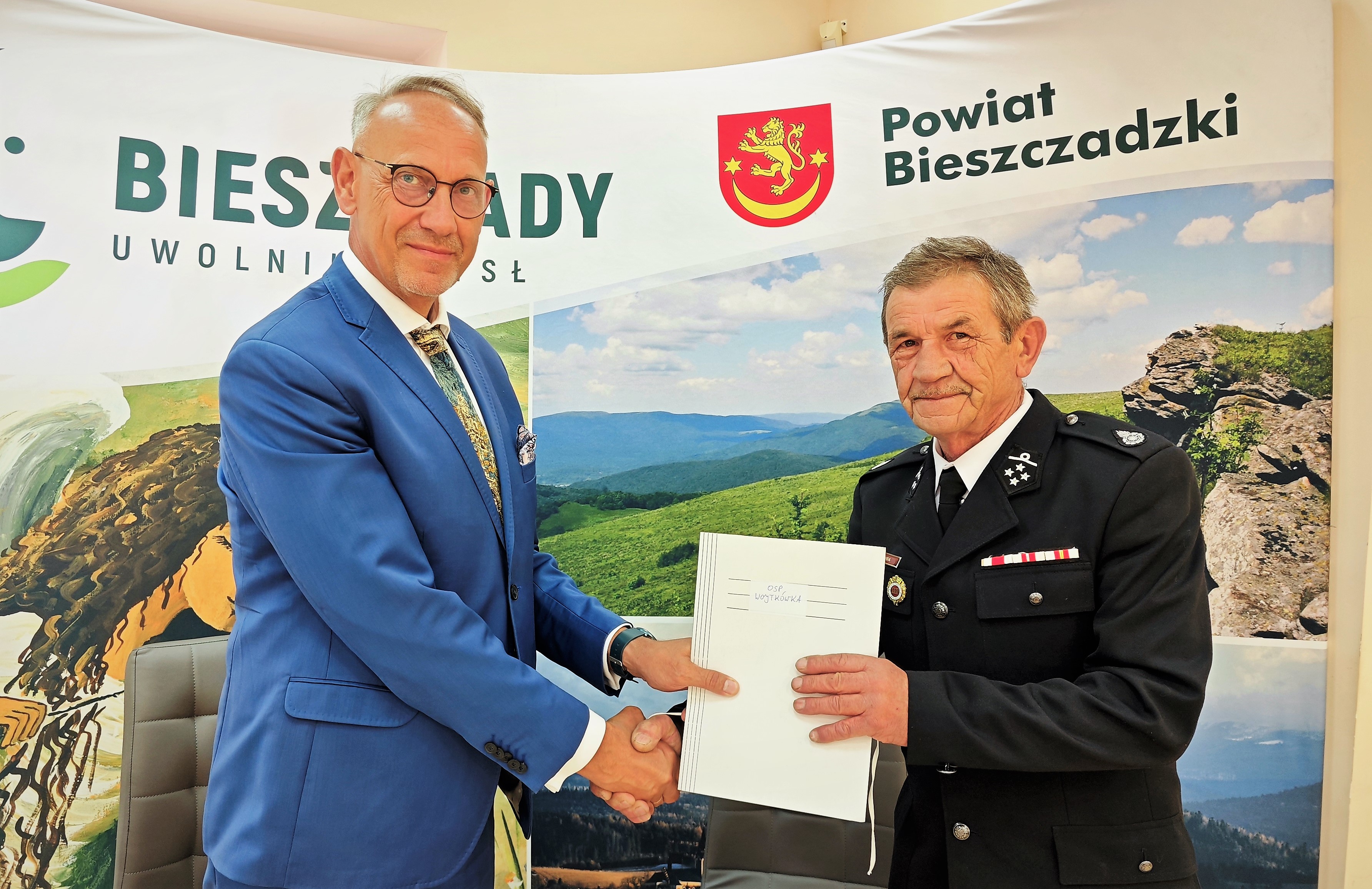 1 czerwca w siedzibie starostwa powiatowego w Ustrzykach Dolnych miało miejsce wręczenie decyzji dotyczących przyznania środków finansowych w ramach programu Wojewódzkiego Funduszu Ochrony Środowiska i Gospodarki Wodnej pn. Dofinansowanie zakupu sprzętu i wyposażenia jednostek Ochotniczych Straży Pożarnych – 2023 r. Decyzje wręczał Prezes Zarządu WOŚiGW Pan Adam Skiba.