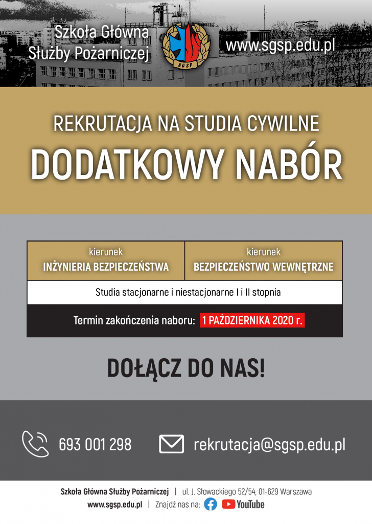 Szkoła Główna Służby Pożarniczej ogłosiła drugi nabór w postępowaniu rekrutacyjnym na prowadzone studia w roku akademickim 2020/2021. Informacja o rodzajach studiów oraz terminy rozpoczęcia i zakończenia poszczególnych etapów rekrutacji zawarte są w załączonej poniżej decyzji.