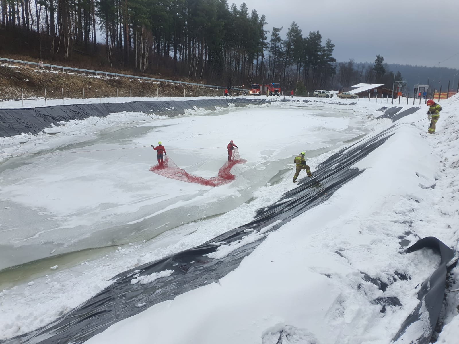 Strażacy ubrani w suche skafandry do ratownictwa wodnego, asekurowani za pomocą lin oraz wyposażeni w odpowiedni sprzęt udali się na tafle lodu zbiornika. Wykorzystując siatkę złapano zwierzęta i ewakuowano w bezpieczne miejsce, w którym lekarz weterynarii ocenił ich stan fizyczny. Zwierzęta wypuszczone zostały do pobliskiego lasu, ze względu na stan nie zagrażający ich zdrowiu.