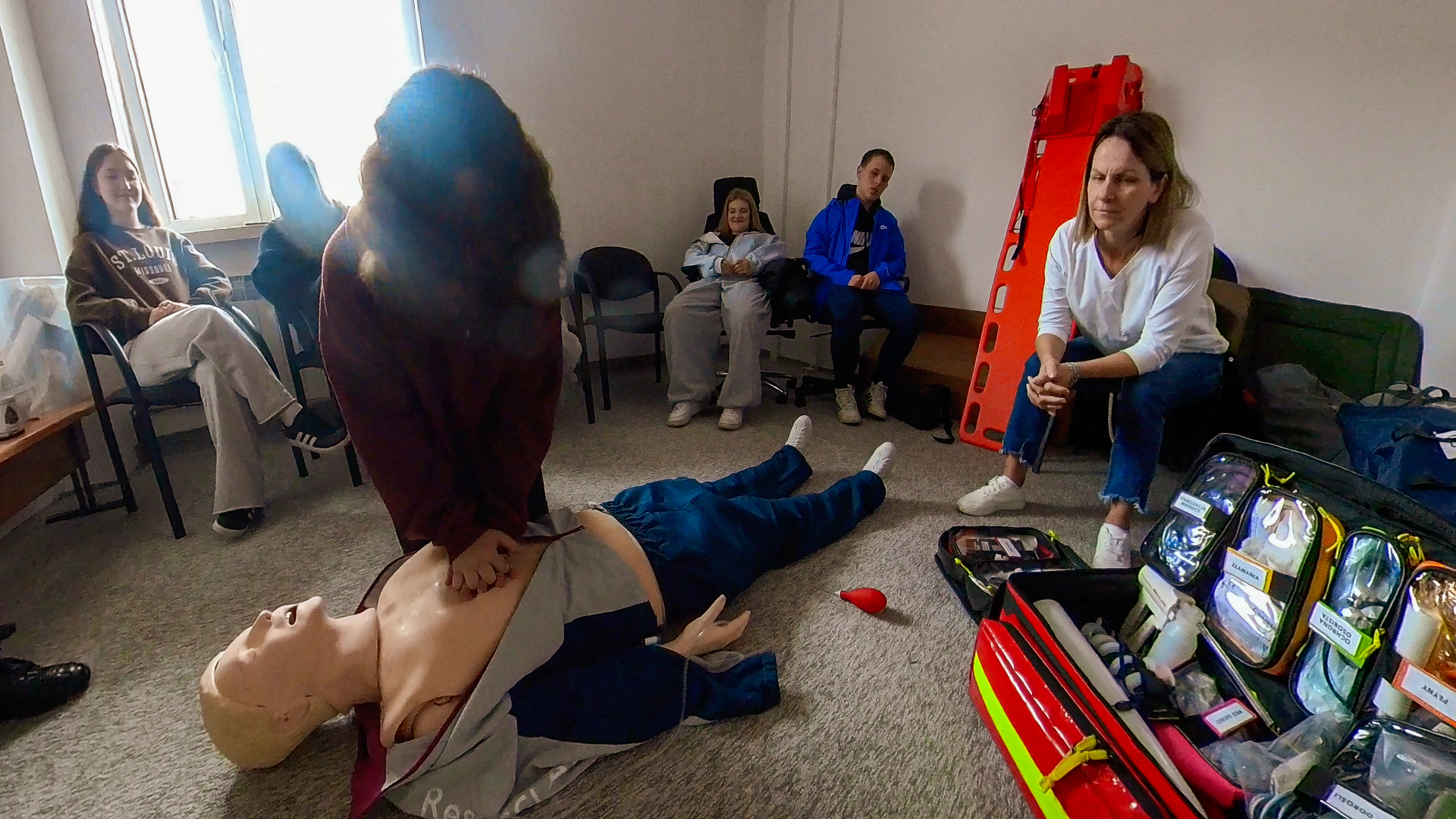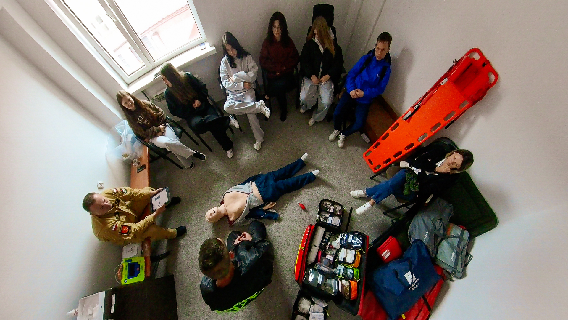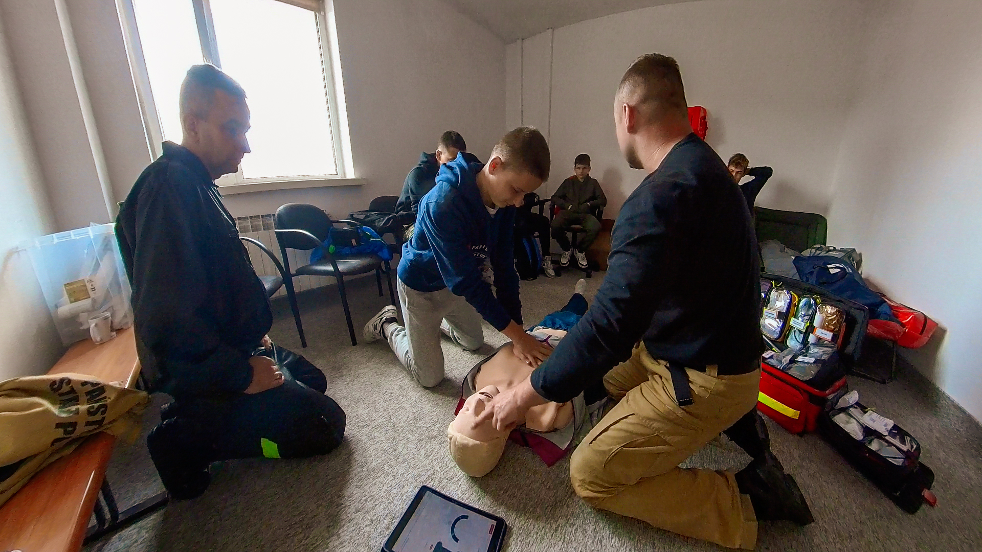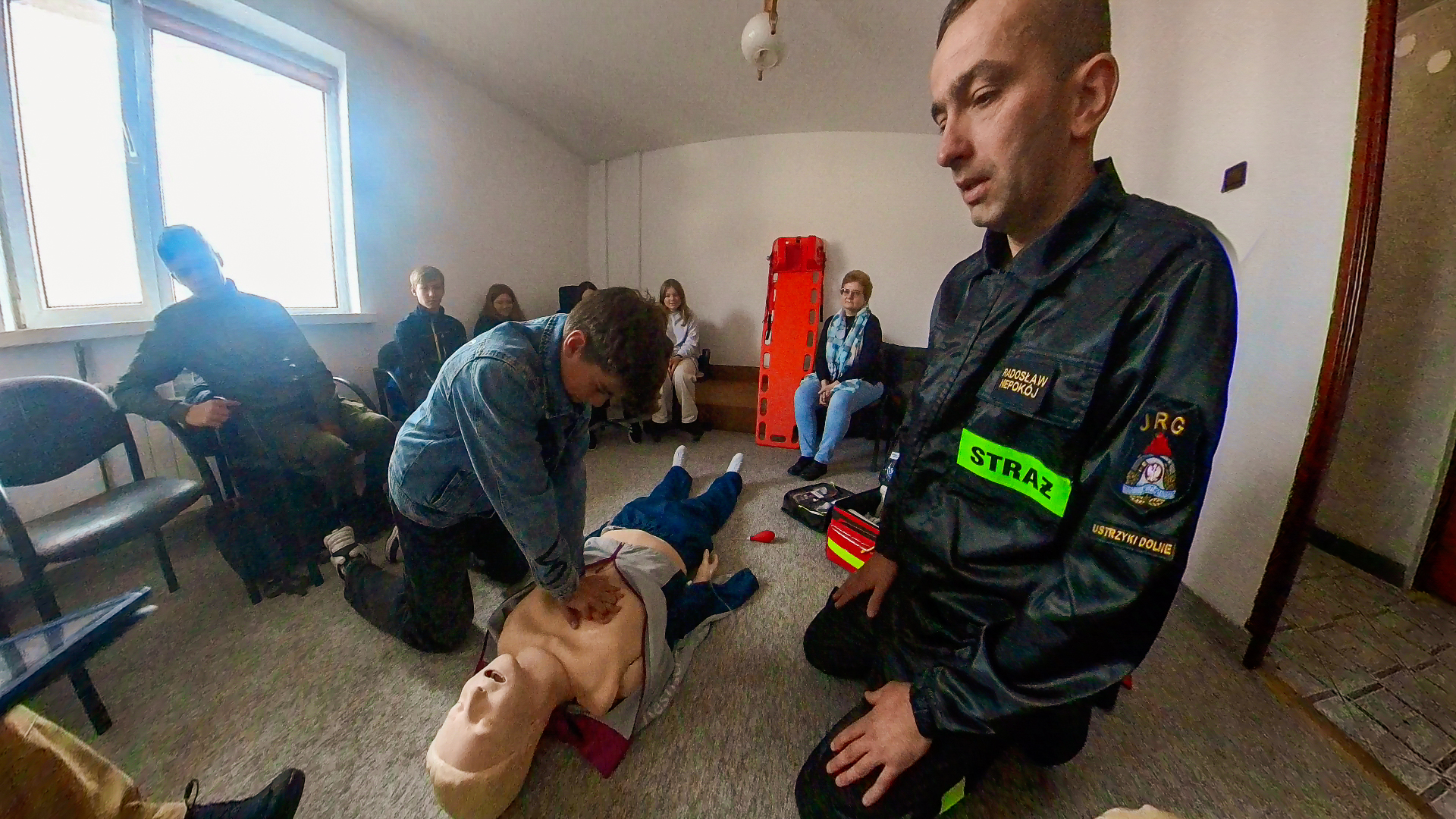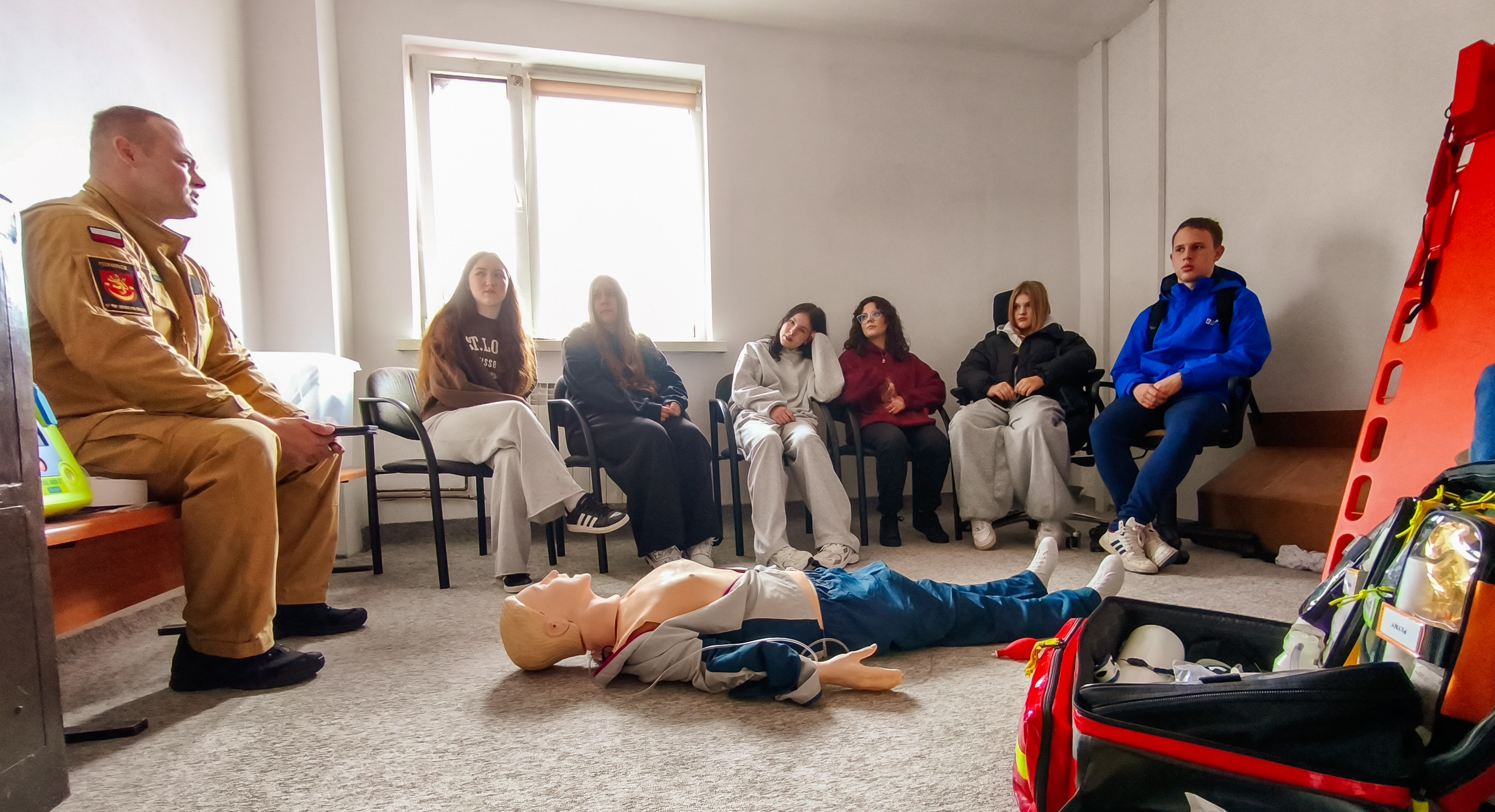 To właśnie nauka właściwego reagowania w sytuacjach zagrożenia zdrowia i życia była głównym celem spotkania. Uczniowie z dużym zaangażowaniem uczestniczyli w zajęciach, ucząc się m.in. resuscytacji krążeniowo-oddechowej oraz zasad wzywania pomocy.