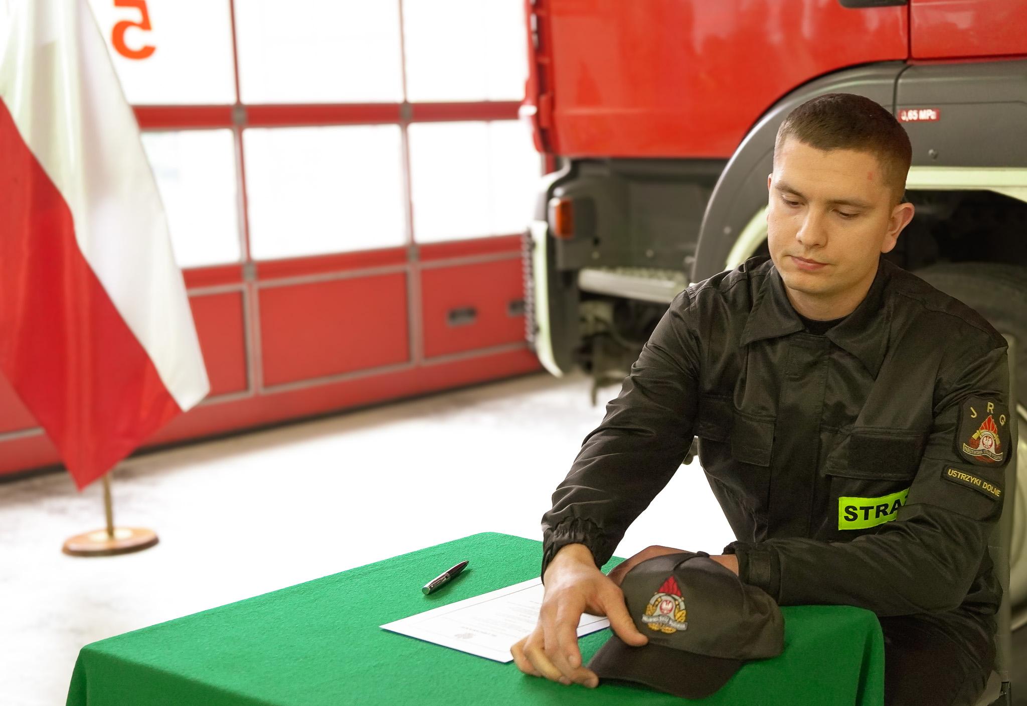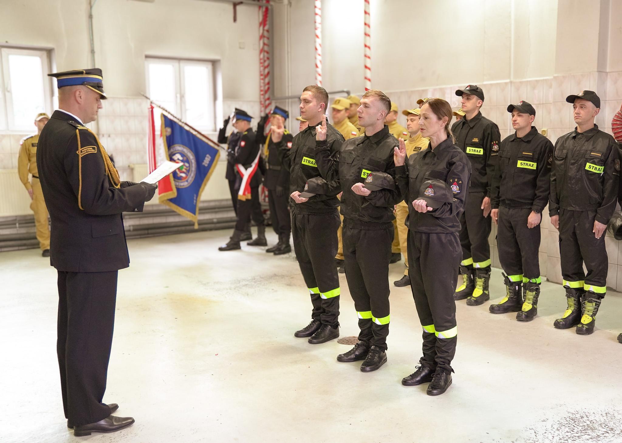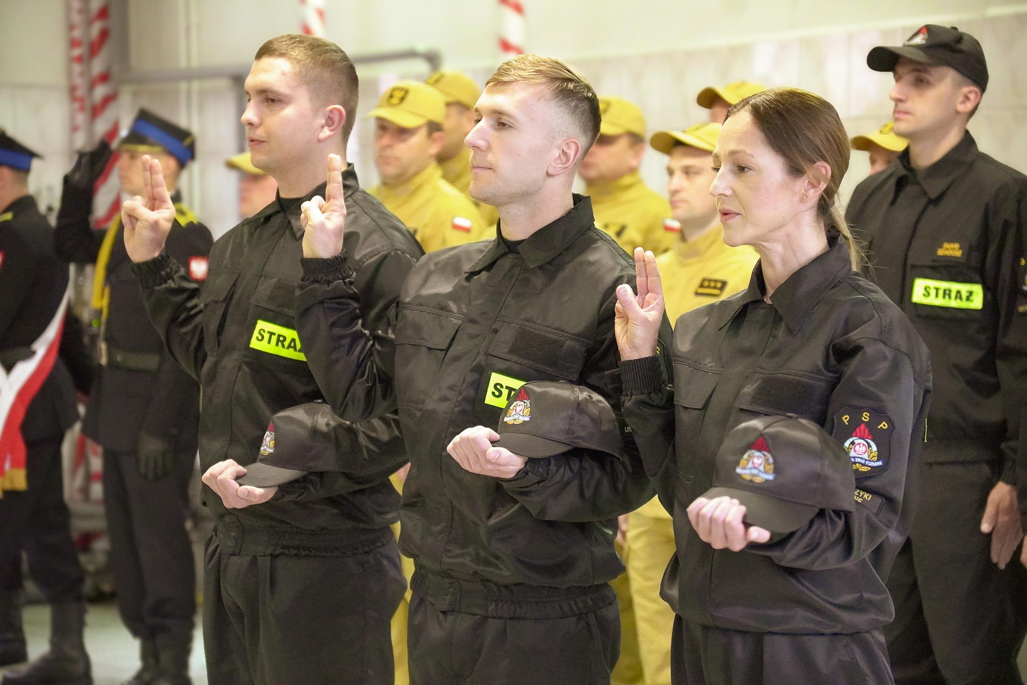 "Ja, obywatel Rzeczypospolitej Polskiej, świadom podejmowanych obowiązków strażaka, uroczyście ślubuję być ofiarnym i mężnym w ratowaniu zagrożonego życia ludzkiego i wszelkiego mienia - nawet z narażeniem życia"