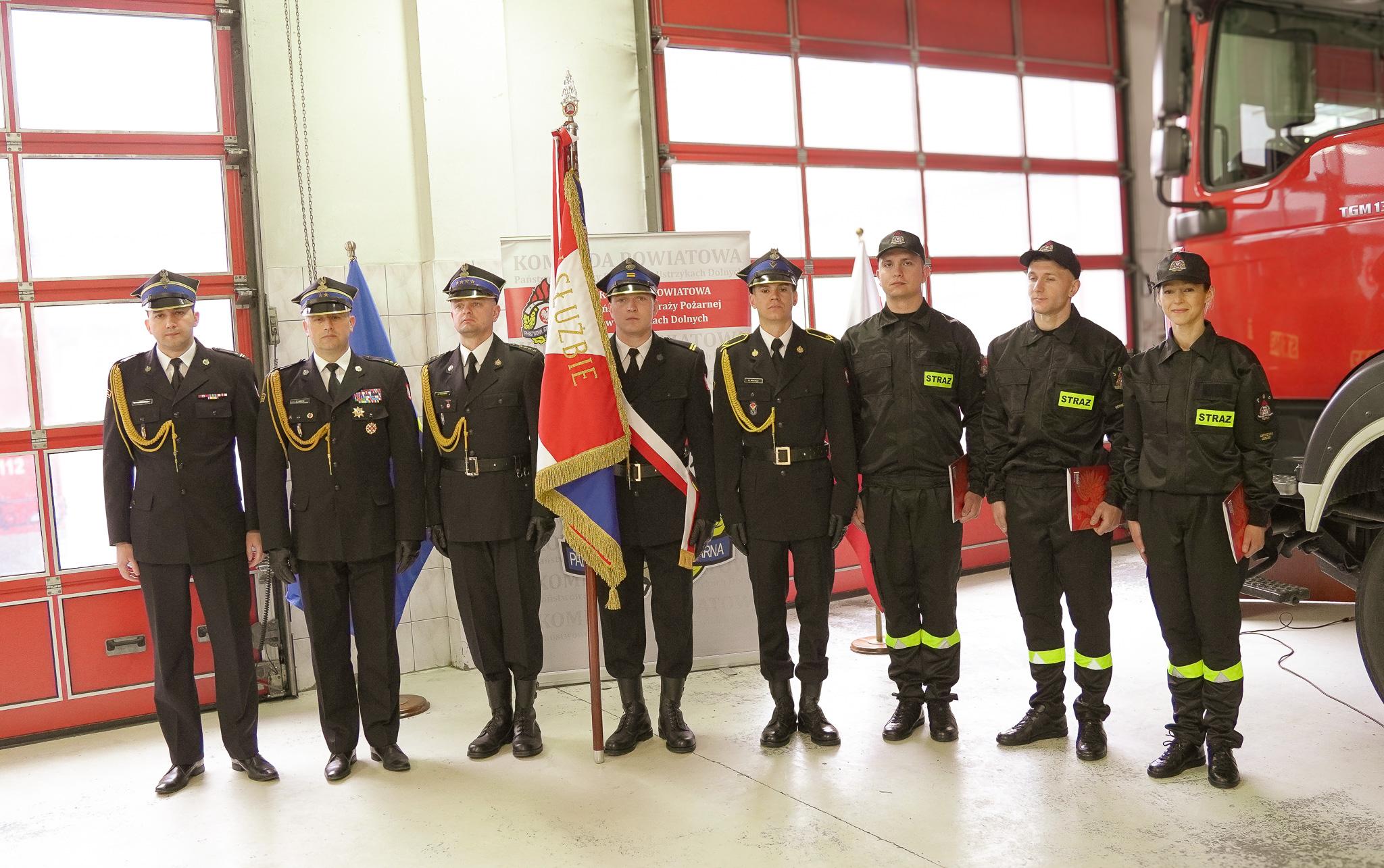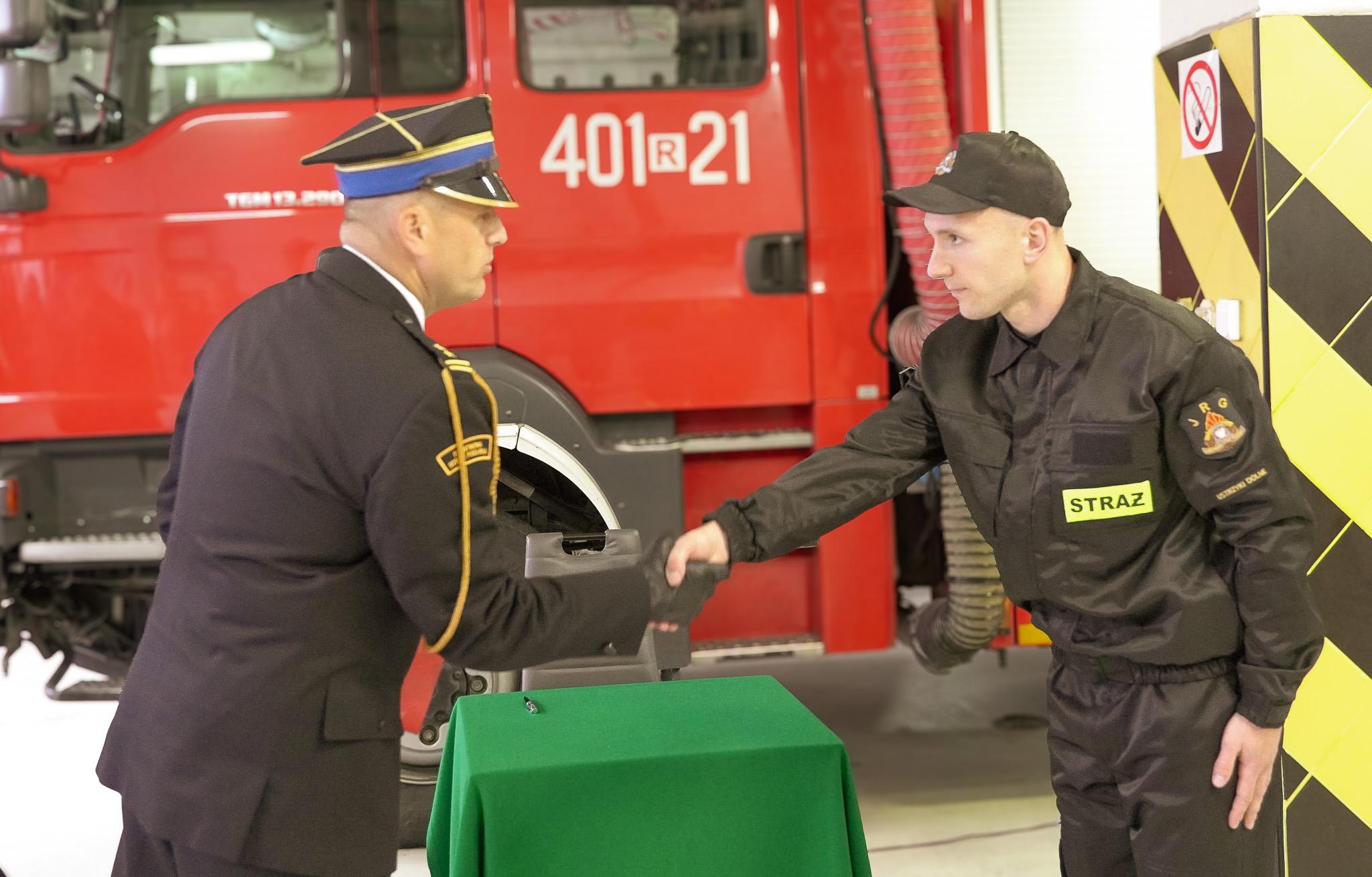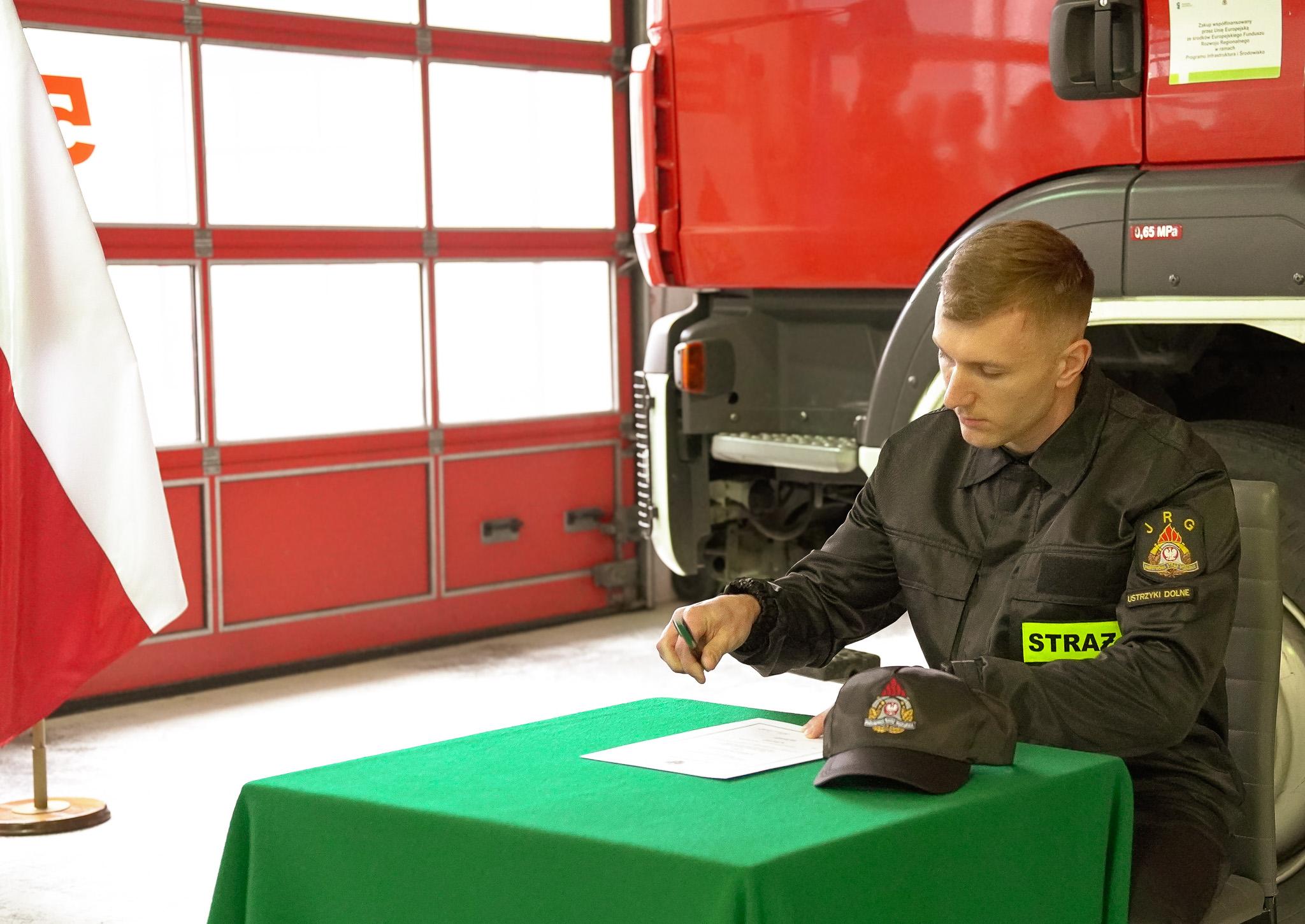 "Ja, obywatel Rzeczypospolitej Polskiej, świadom podejmowanych obowiązków strażaka, uroczyście ślubuję być ofiarnym i mężnym w ratowaniu zagrożonego życia ludzkiego i wszelkiego mienia - nawet z narażeniem życia"