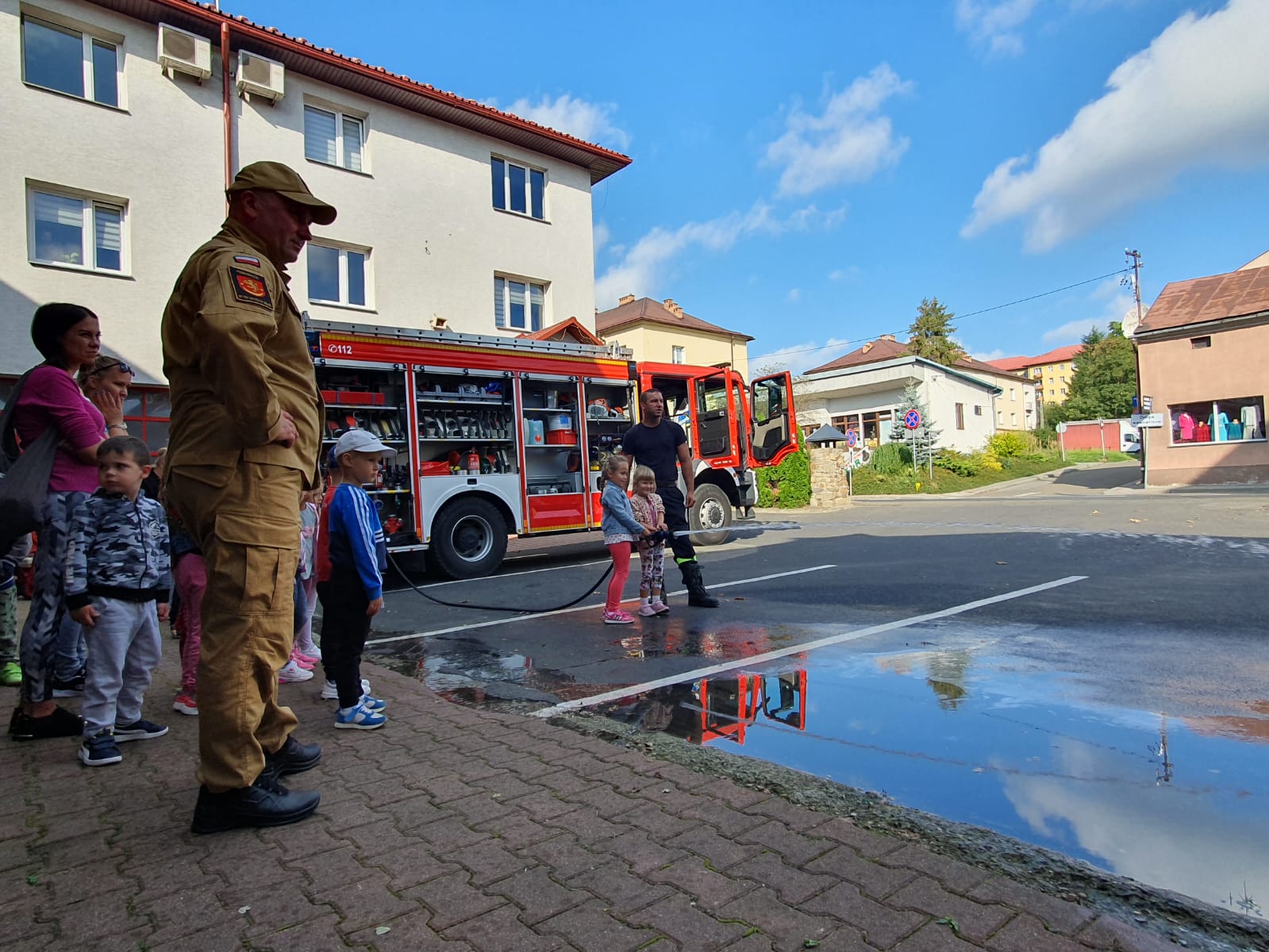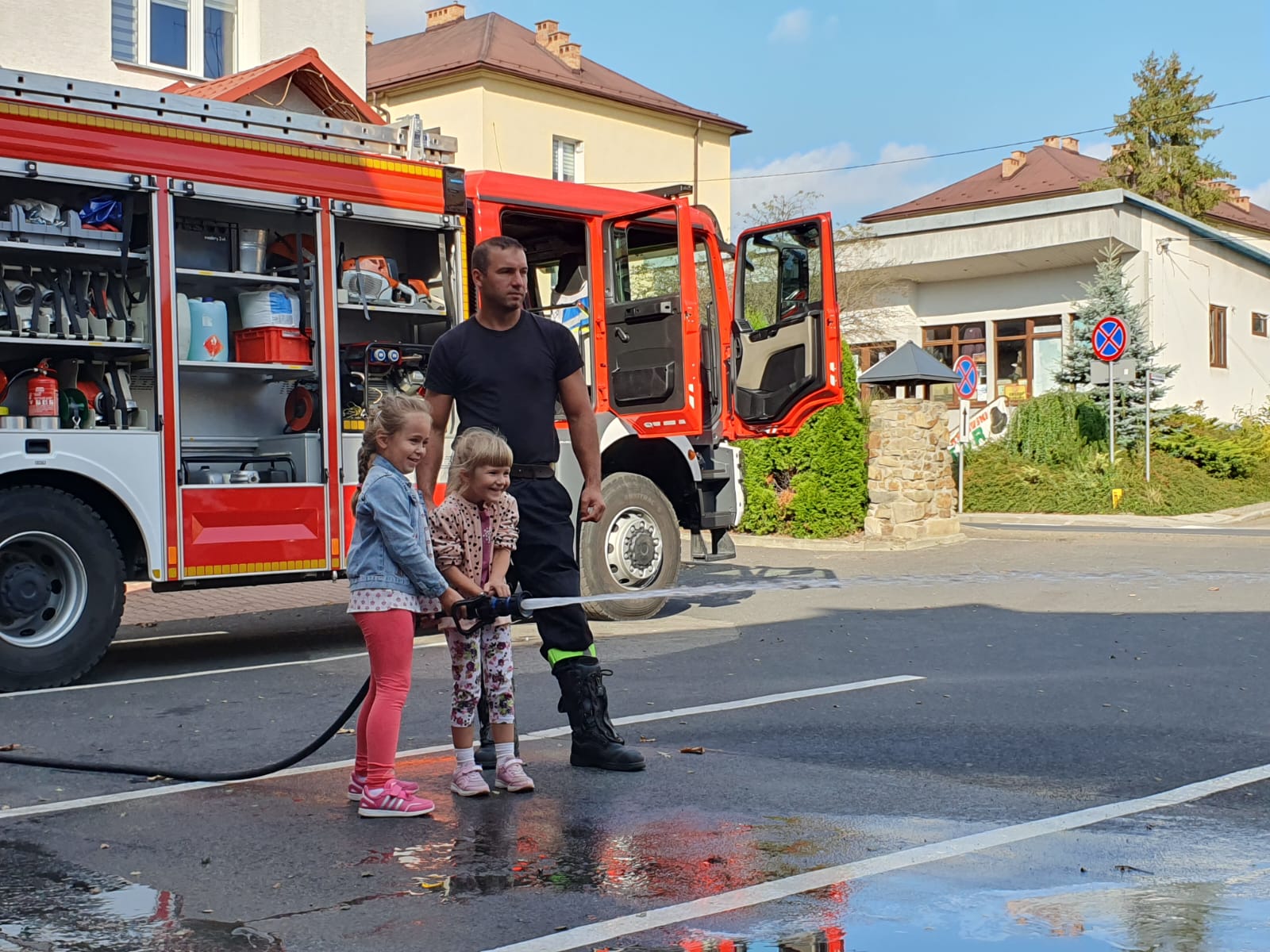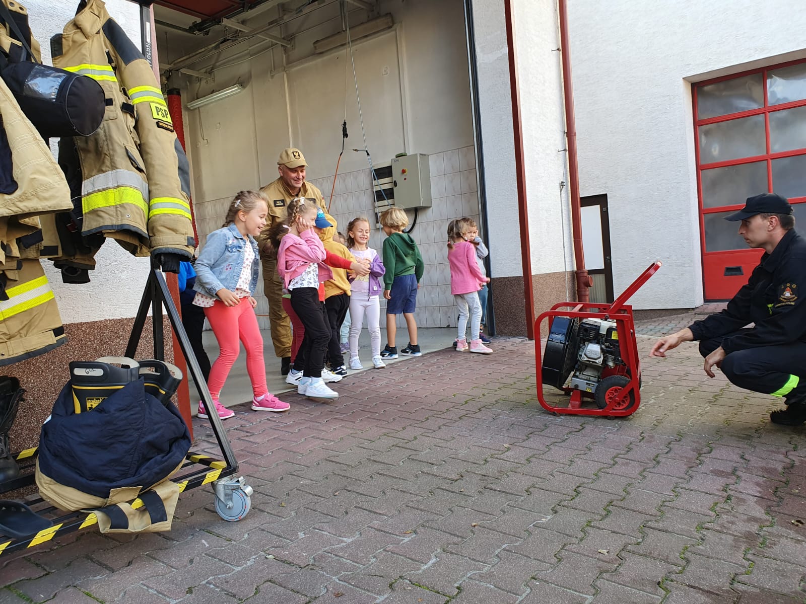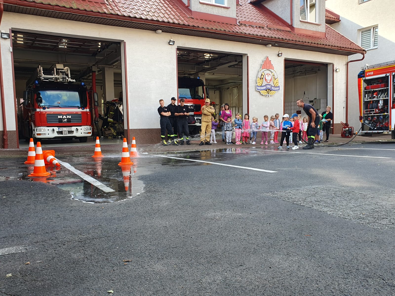 Dzieci zapoznały się ze sprzętem który używają strażacy, zobaczyły jak wygląda przygotowanie do wyjazdu a także zorganizowano dla nich zawody w strącaniu pachołków przy użyciu szybkiego natarcia.