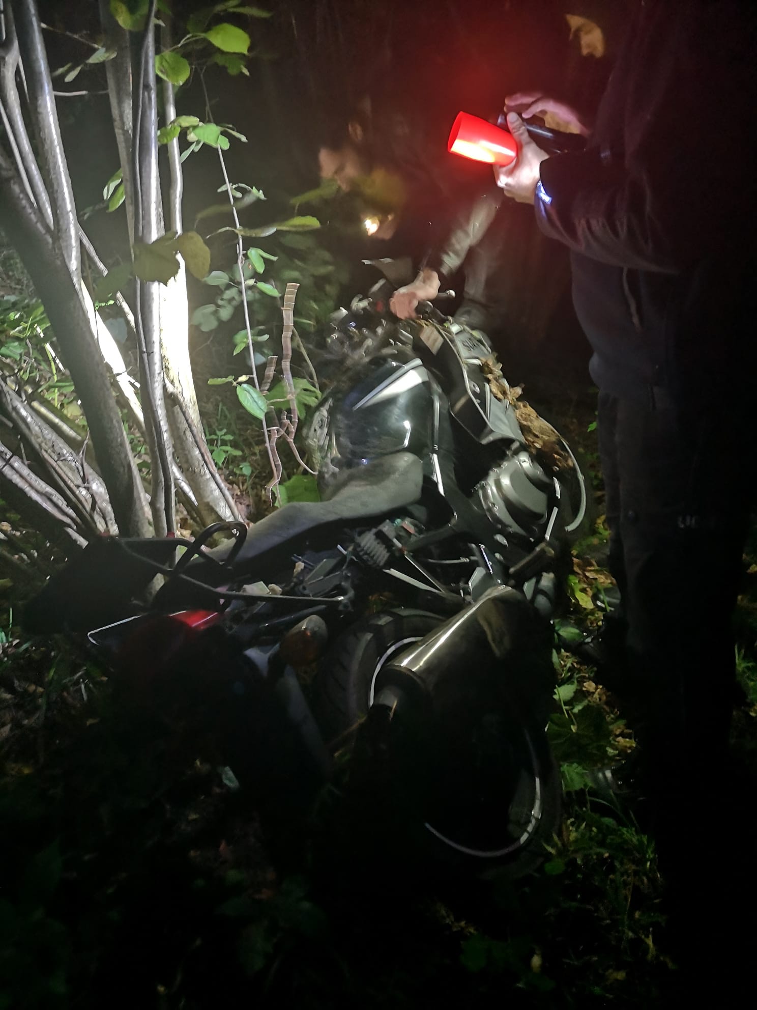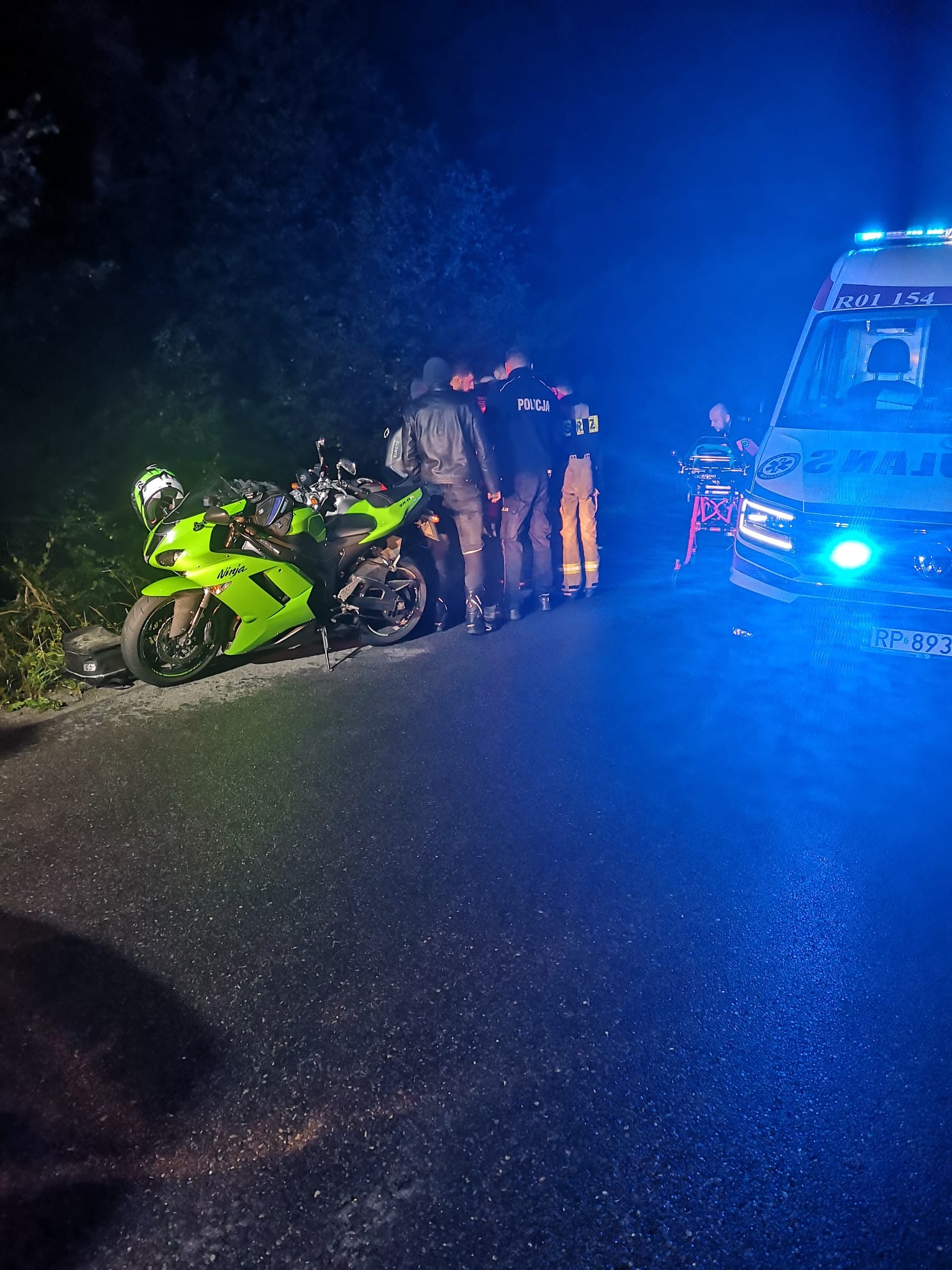 Po przyjeździe na miejsce zdarzenia okazało się że, motocykl znajduje się poza jezdnią. Motocykliście została udzielona pomoc medyczna na miejscu po czym przetransportowano go do szpitala. Pojazdy jak i miejsce zdarzenia zostały zabezpieczone.