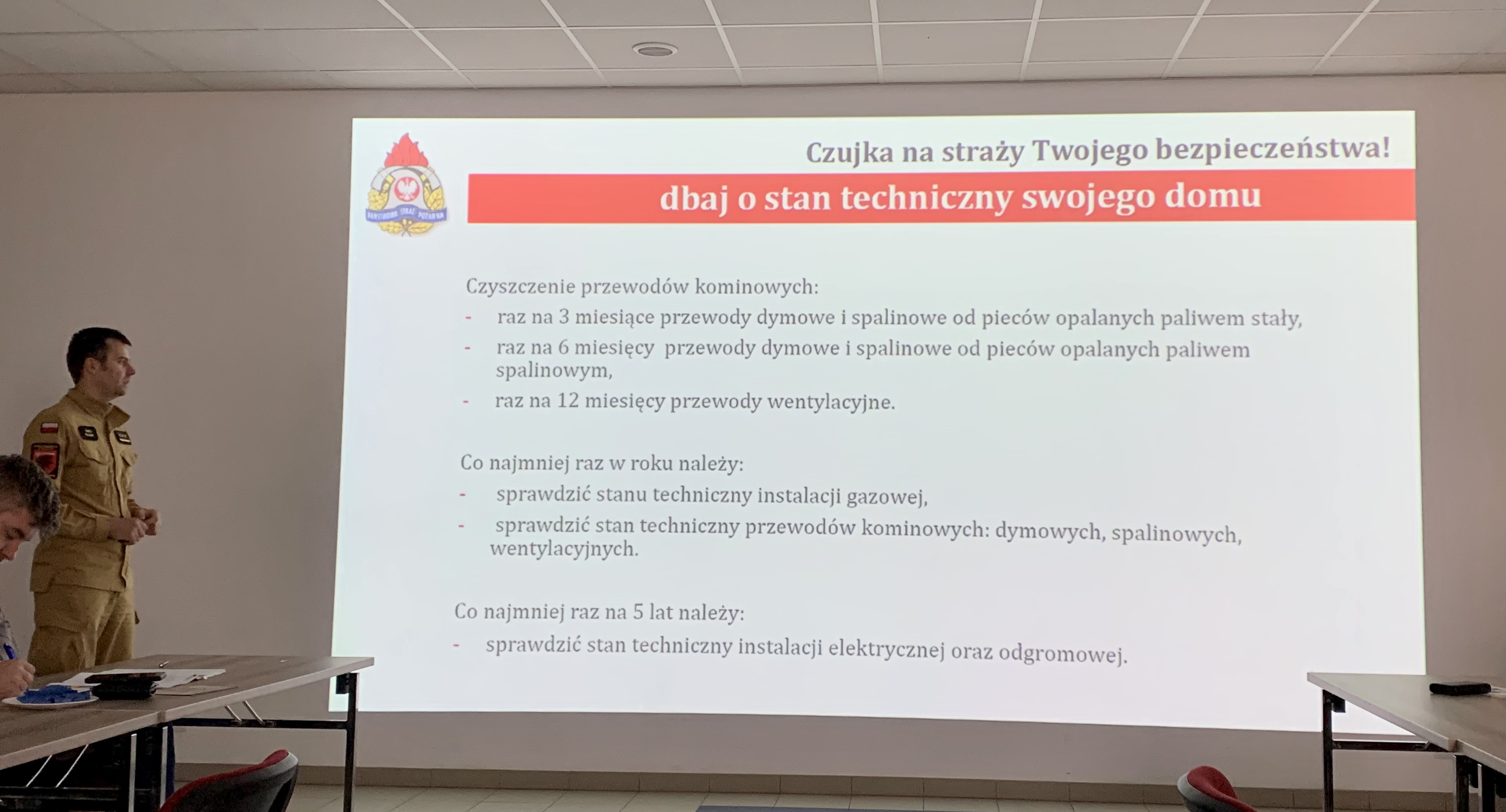Poruszona została tematyka związania z obowiązkowymi przeglądami, warunkami bezpieczeństwa pożarowego, wymaganym stanem technicznym budynków oraz zagrożeń związanych z tlenkiem węgla. Prelegentami byli: Pan Jakub Maleszewski – Powiatowy Inspektor Nadzoru Budowlanego w Wąbrzeźnie, Pan Ryszard Janowski – Mistrz Kominiarski Spółdzielni Pracy Kominiarzy w Wąbrzeźnie oraz kpt. Dawid Krajnik – Naczelnik Wydziału Operacyjno-Kontrolno-Rozpoznawczego KP PSP w Wąbrzeźnie.