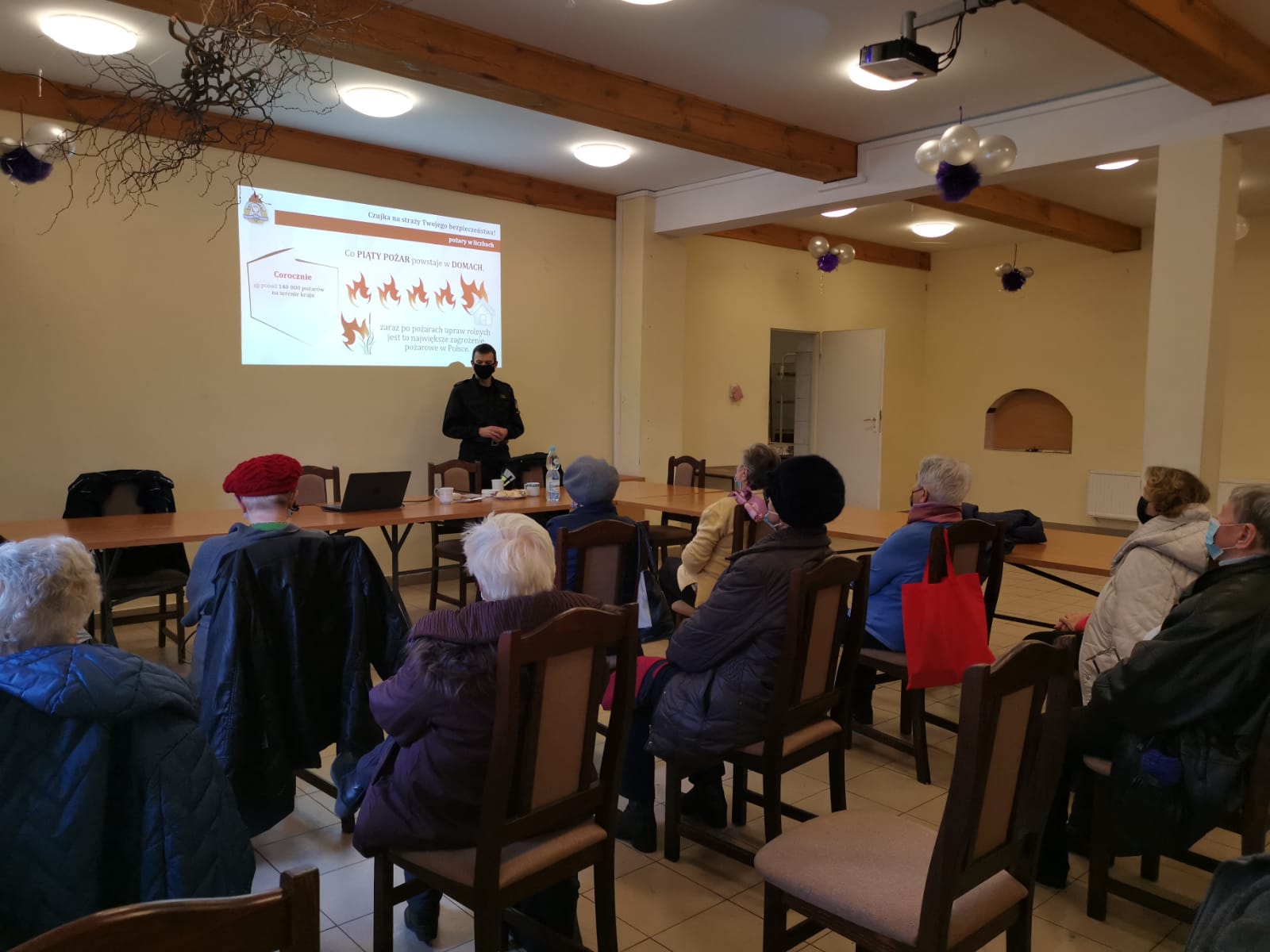 Strażak, kpt. Dawid Krajnik omówił zagadnienia związane z zagrożeniami sezonu grzewczego. Przedstawiono główne przyczyny powstawania pożarów w budynkach mieszkalnych, poinformowano co należy zrobić, aby im zapobiegać, a także zaprezentowano wpływ czujki dymu na bezpieczeństwo mieszkańców. Seniorzy zostali zapoznani również z prezentacją dotyczącą tlenku węgla. Dowiedzieli się jak powstaje ten gaz oraz jaki ma wpływ na organizm ludzki. Podczas prelekcji udzielono informacji gdzie należy montować czujnik tlenku węgla, co zrobić gdy zostanie wykryty czad oraz jak należycie dbać o urządzenia grzewcze i instalacje w budynkach.