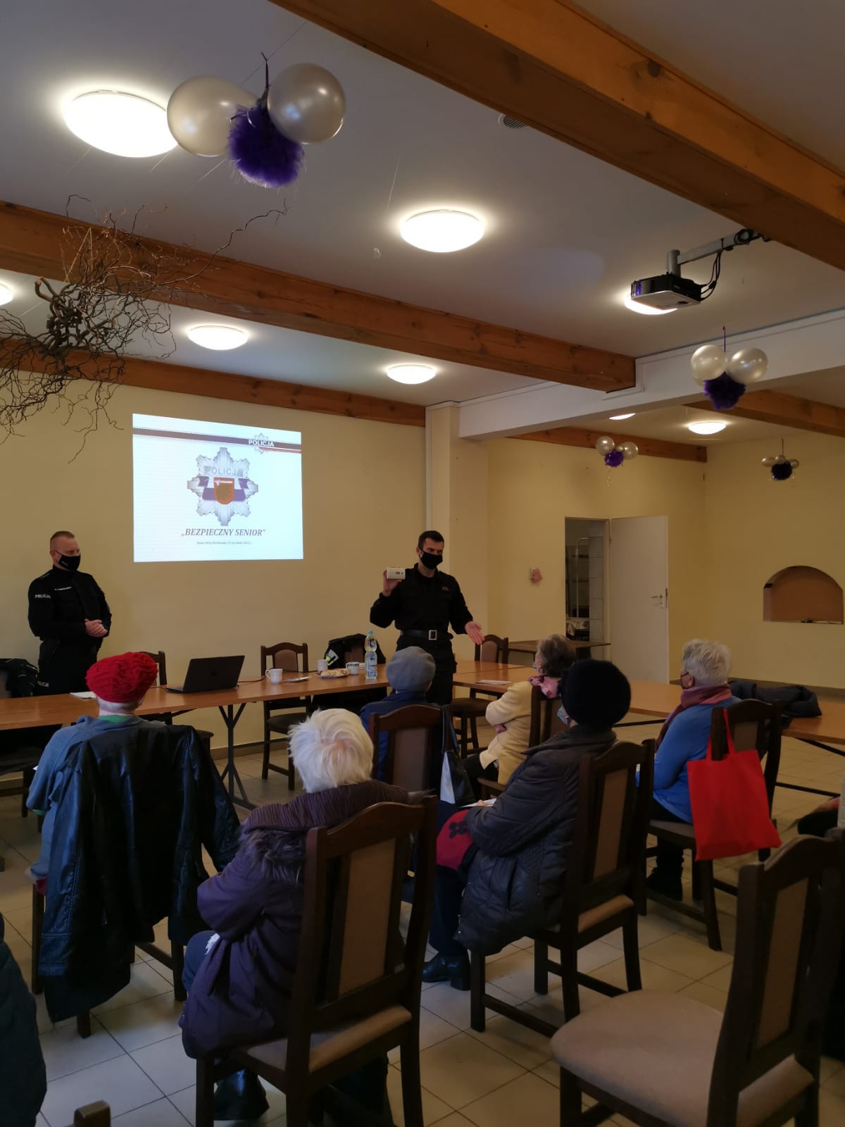 Funkcjonariusz policji, mł. asp. Krzysztof Świerczyński podczas spotkania przedstawił prezentację pt. „Bezpieczny senior”, przekazał informację na temat „Kopert Życia”, Krajowej Mapy Zagrożeń Bezpieczeństwa oraz aplikacji „Moja Komenda”.