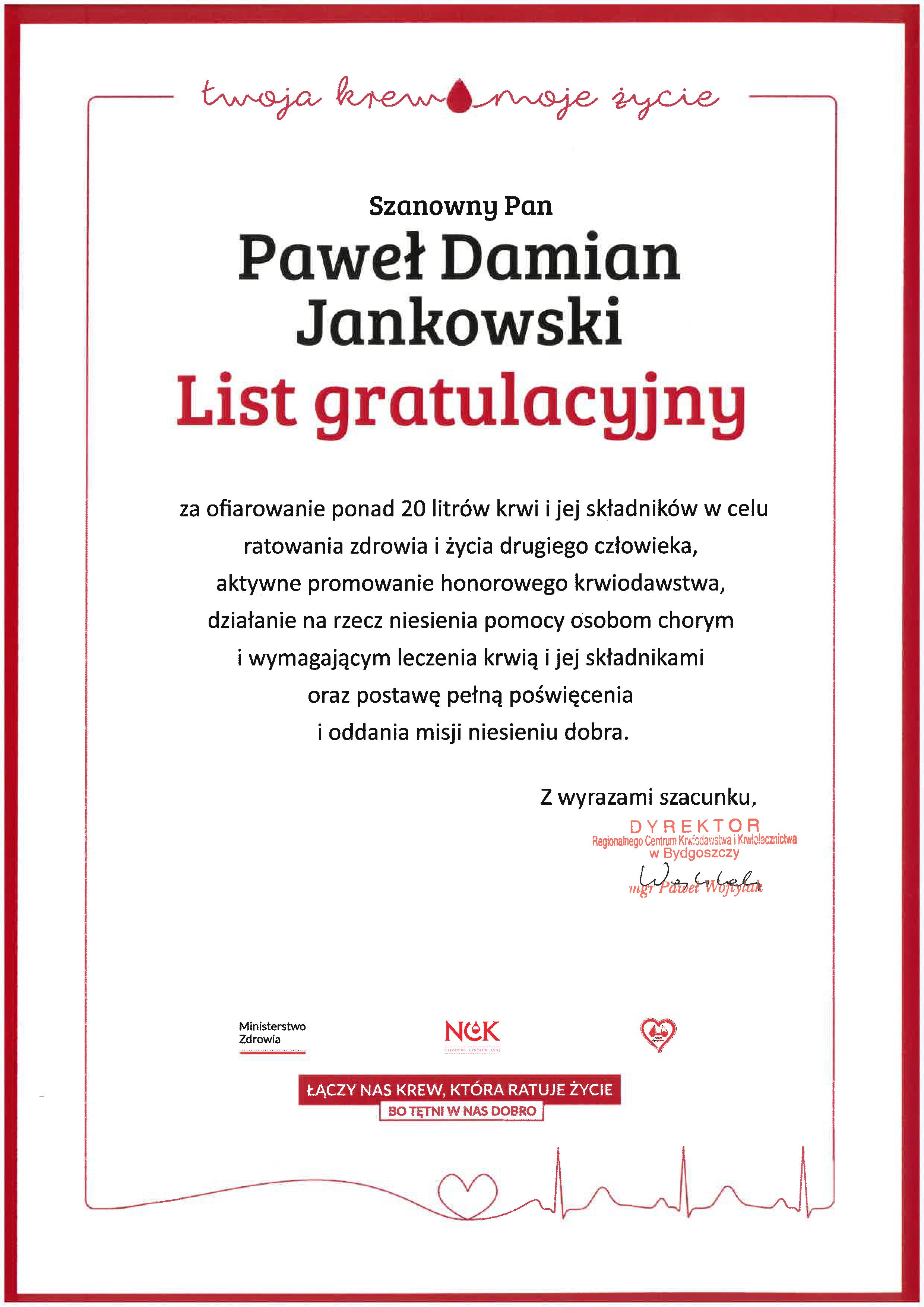 St.ogn. Paweł Jankowski - Honorowego Dawcy Krwi - Zasłużony dla Zdrowia Narodu