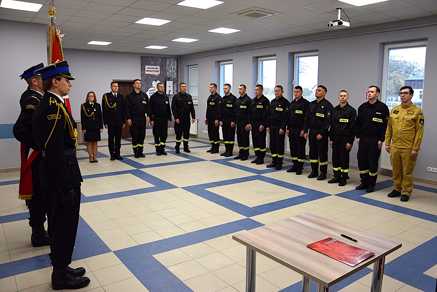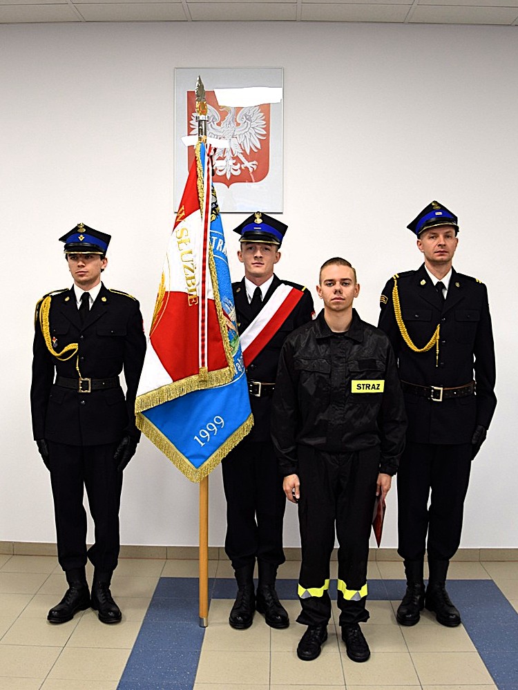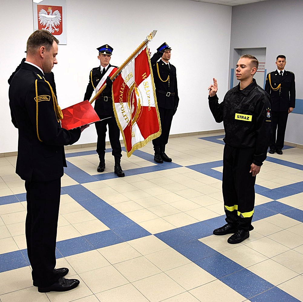 "Ja, obywatel Rzeczypospolitej Polskiej, świadom podejmowanych obowiązków strażaka, uroczyście ślubuję być ofiarnym i mężnym w ratowaniu zagrożonego życia ludzkiego i wszelkiego mienia - nawet z narażeniem życia. Wykonując powierzone mi zadania, ślubuję przestrzegać prawa, dyscypliny służbowej oraz wykonywać polecenia przełożonych. Ślubuję strzec tajemnic związanych ze służbą, a także honoru, godności i dobrego imienia służby oraz przestrzegać zasad etyki zawodowej."
