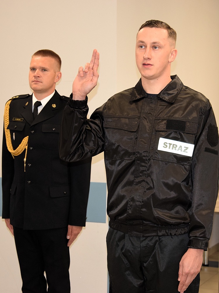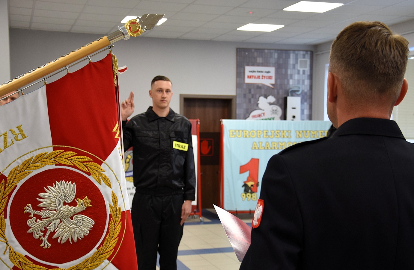 "Ja, obywatel Rzeczypospolitej Polskiej, świadom podejmowanych obowiązków strażaka, uroczyście ślubuję być ofiarnym i mężnym w ratowaniu zagrożonego życia ludzkiego i wszelkiego mienia - nawet z narażeniem życia. Wykonując powierzone mi zadania, ślubuję przestrzegać prawa, dyscypliny służbowej oraz wykonywać polecenia przełożonych. Ślubuję strzec tajemnic związanych ze służbą, a także honoru, godności i dobrego imienia służby oraz przestrzegać zasad etyki zawodowej."