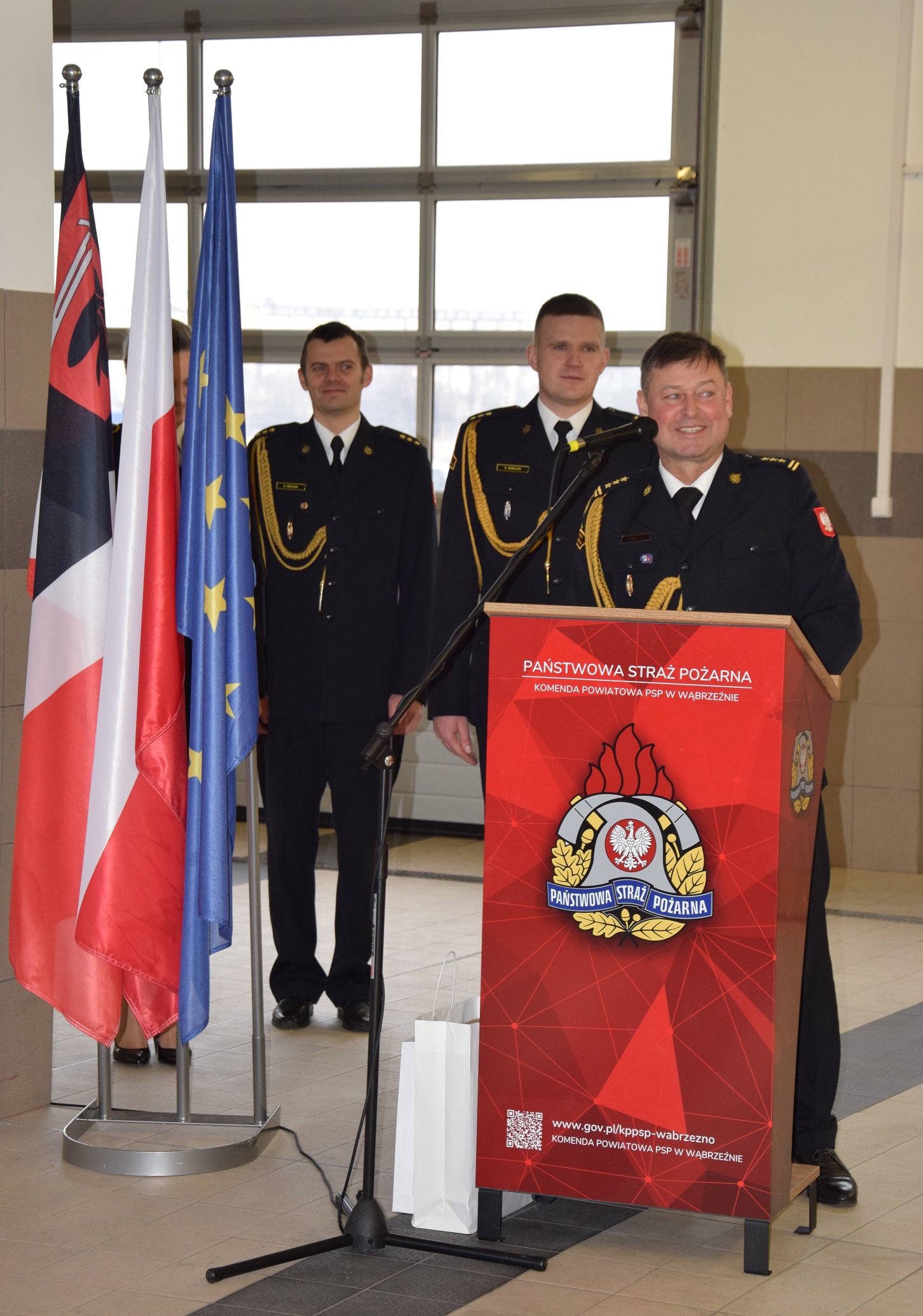 Po odczytaniu decyzji oraz pożegnaniu się st. bryg. Cezarego Maćczaka ze Sztandarem Komendy Powiatowej PSP w Wąbrzeźnie słowa podziękowania za długoletnią i nienaganną służbę przekazał Zastępca Kujawsko-Pomorskiego Komendant Wojewódzki PSP st. bryg. Marek Rusoń. Wiele ciepłych słów oraz życzeń popłynęło również z ust zaproszonych gości.