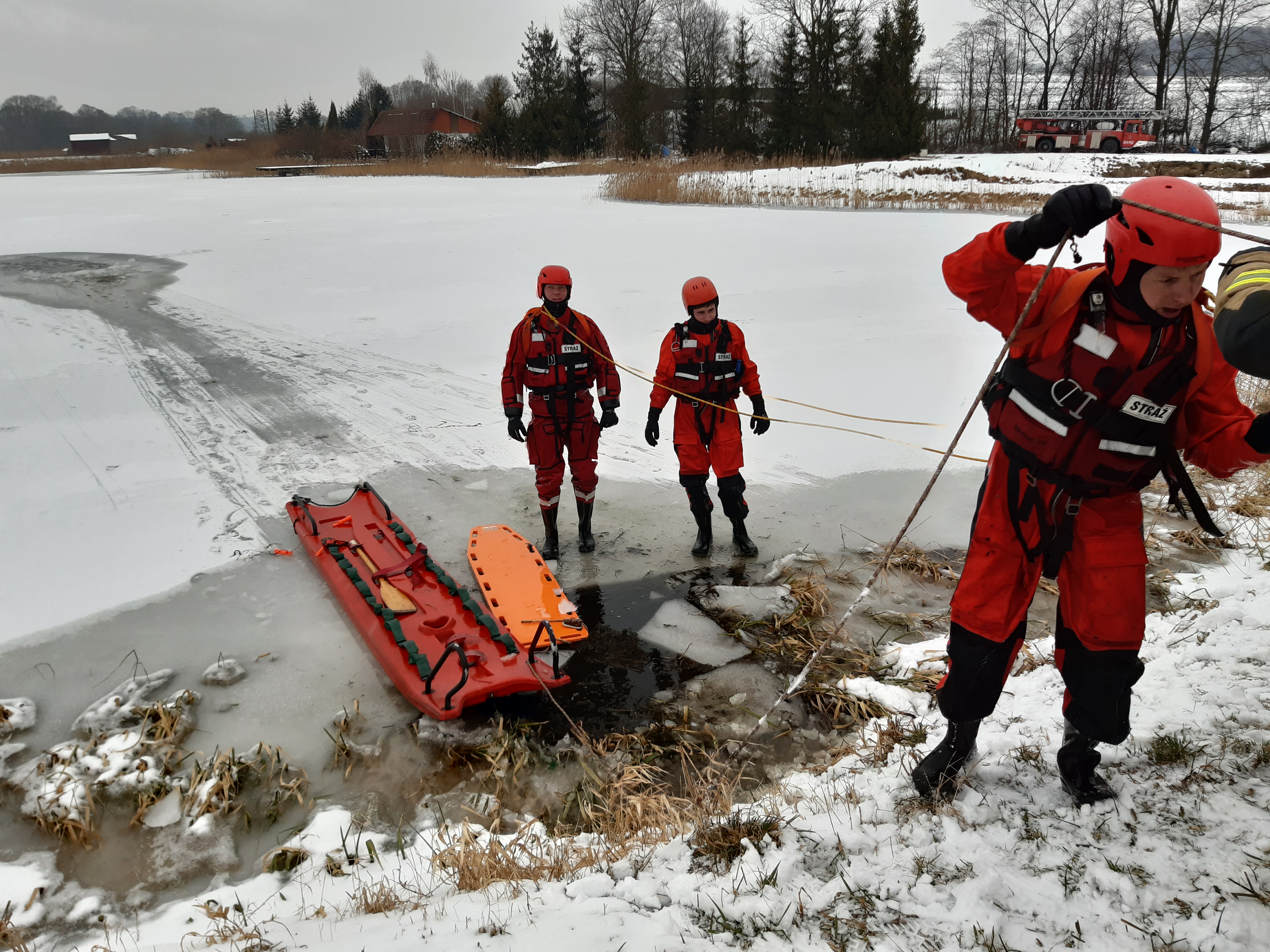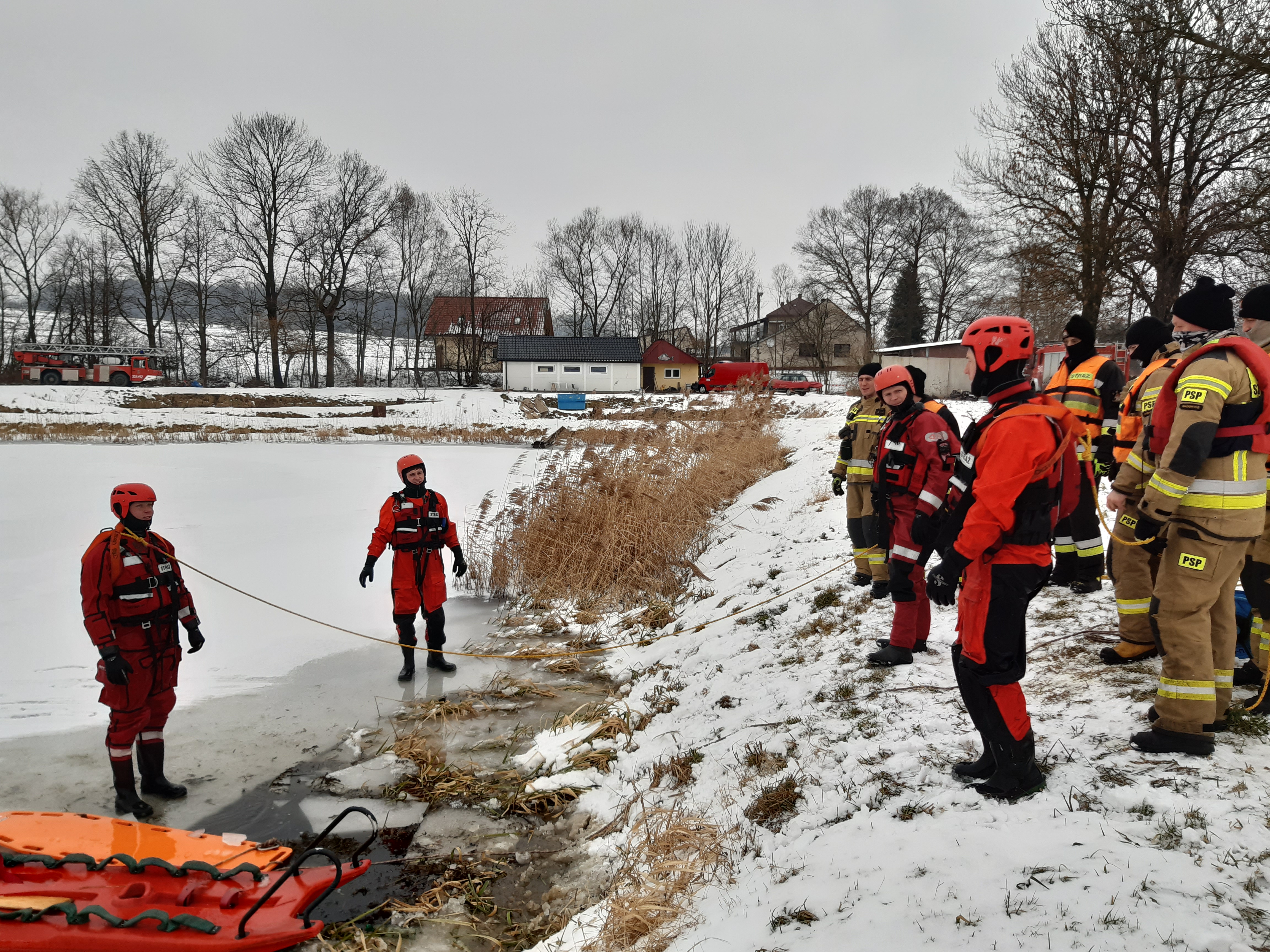 W ramach ćwiczeń podejmowano z wody osobę, pod którą załamał się lód, wykorzystując między innymi sanie lodowe, nosze typu deska, jak również ubrania do pracy w wodzie.