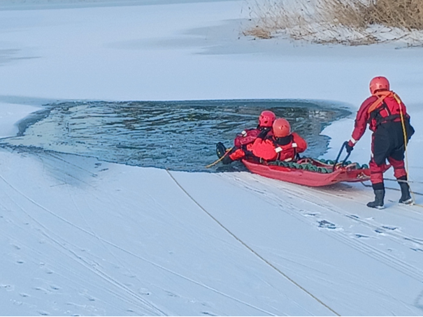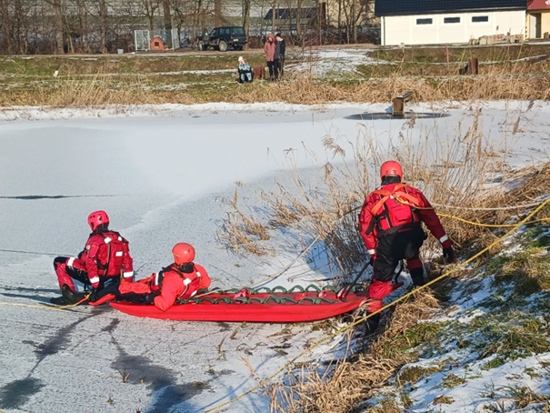 W ramach ćwiczeń podejmowano z wody osobę, pod którą załamał się lód, wykorzystując między innymi sanie lodowe, nosze typu deska, jak również ubrania do pracy w wodzie.