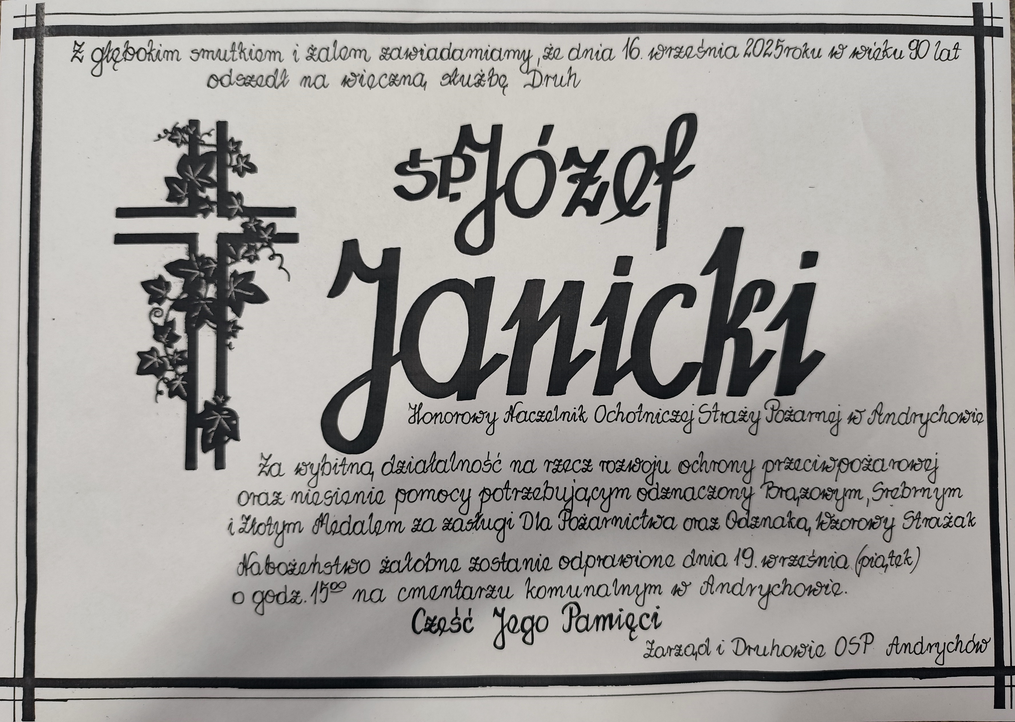 Wszyscy strażacy i pracownicy Komendy Powiatowej Państwowej Straży Pożarnej w Wadowicach z wielkim smutkiem przyjęli wiadomość, że w dniu 16.09.2025 roku, w wieku 90 lat, zmarł Śp. Druh Józef Janicki.