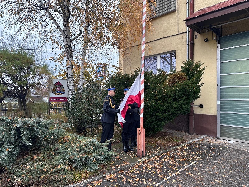 Z okazji Święta Niepodległości w dniu 11 listopada, strażacy pełniący służbę w jednostkach ratowniczo-gaśniczych Komendy Powiatowej Państwowej Straży Pożarnej w Wadowicach, przeprowadzili uroczyste zmiany służby, w trakcie których podniesiono flagę państwową na maszt.