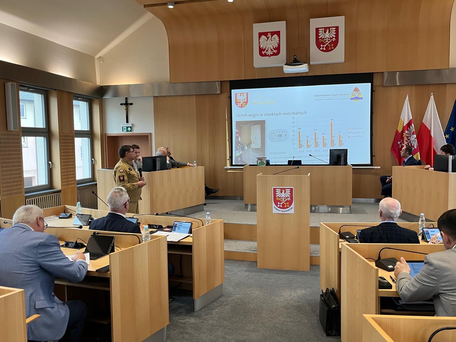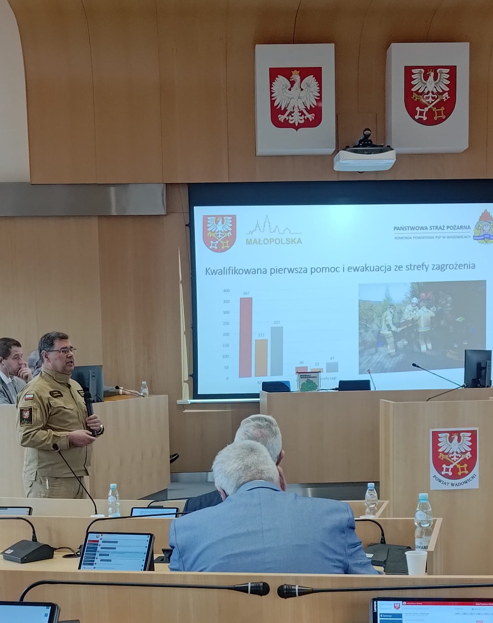 W posiedzeniu wziął również udział st. bryg. Paweł Kwarciak - komendant powiatowy Państwowej Straży Pożarnej w Wadowicach, który w swoim wystąpieniu przedstawił zgromadzonym informację o stanie bezpieczeństwa w zakresie ochrony przeciwpożarowej na terenie powiatu wadowickiego w 2024 roku zawierającą w szczególności dane o zabezpieczeniu operacyjnym powiatu, organizacji i funkcjonowania krajowego systemu ratowniczo-gaśniczego na terenie powiatu, statystykę interwencji, które miały miejsce w minionym roku oraz informację powiatowych ćwiczeniach ratowniczych, które odbyły się w dniu 17.10.2024 r. na terenie kompleksu hotelowego Kocierz Resort w Targanicach.