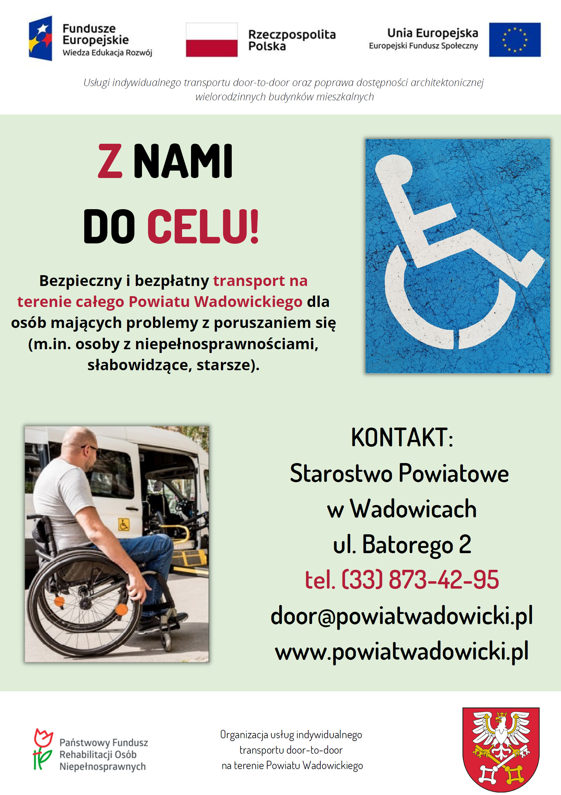 rząd pomoże w dojeździe do pracy, do lekarza, na rehabilitację, czy na zajęcia edukacyjne lub kulturalne. Chętni do skorzystania z takiej usługi mogą zgłaszać się do biura projektu telefonicznie pod numerem: 33-873-42-95 lub za pomocą poczty elektronicznej: door@powiatwadowicki.pl