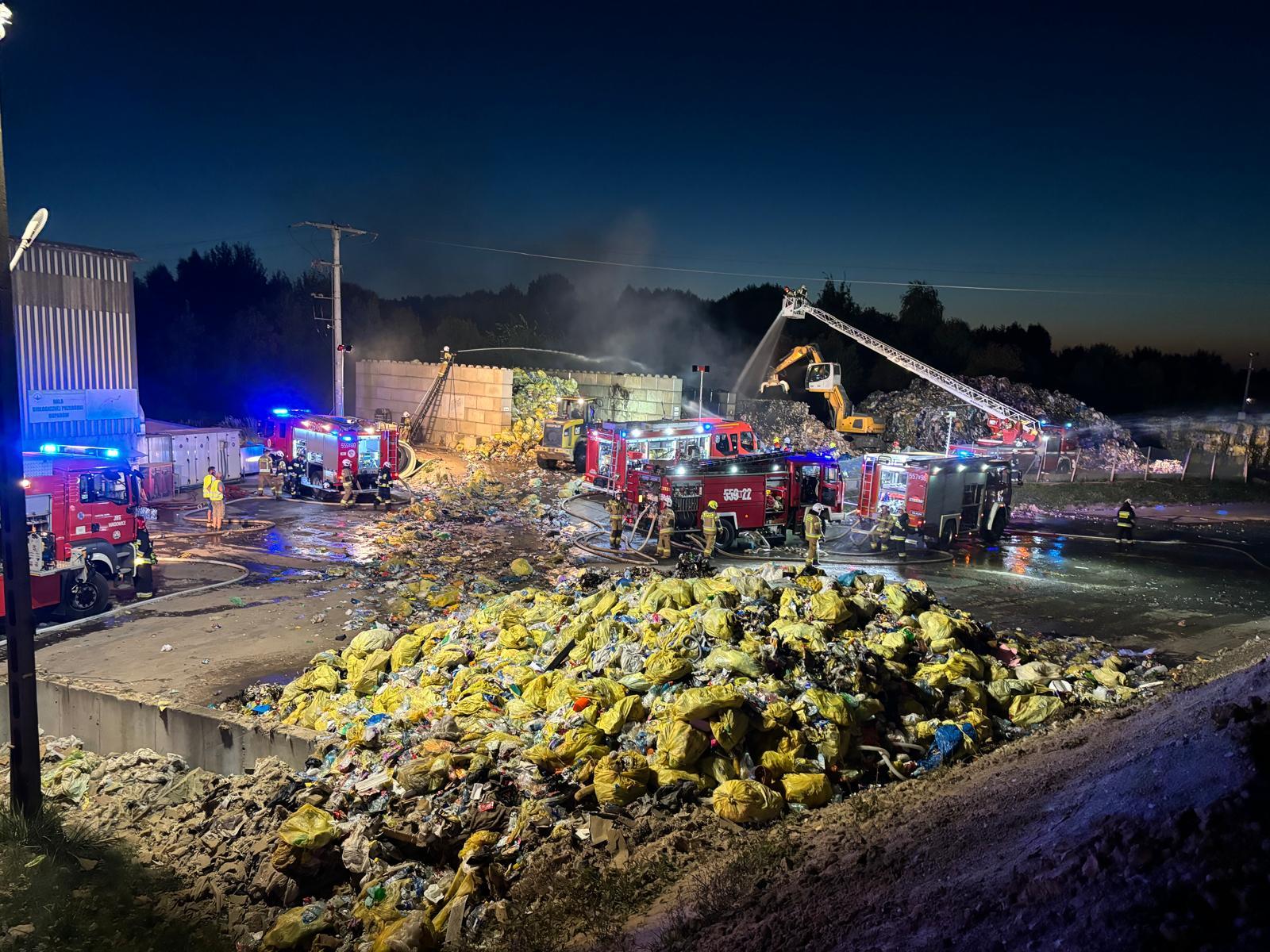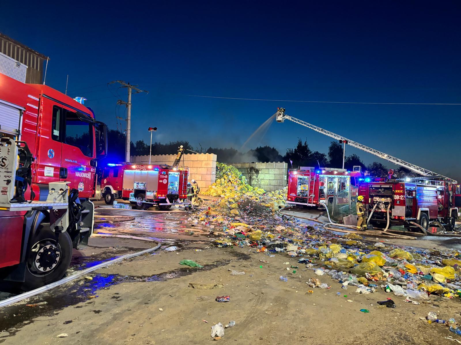 w obronie zagrożonego pobliskiego budynku sortowni oraz innych miejsc magazynowania. Miejsce prowadzenia akcji gaśniczej monitorowano przy użyciu bezzałogowego statku powietrznego będącego na wyposażeniu JRG Wadowice. Na miejsce zadysponowano także Specjalistyczną Grupę Ratownictwa Chemiczno – Ekologicznego z Krakowa. Wydano ostrzeżenia dla mieszkańców w pobliżu miejsca akcji w tym sąsiednich gmin o zaleceniu zamknięcia okien w domach i mieszkaniach.
