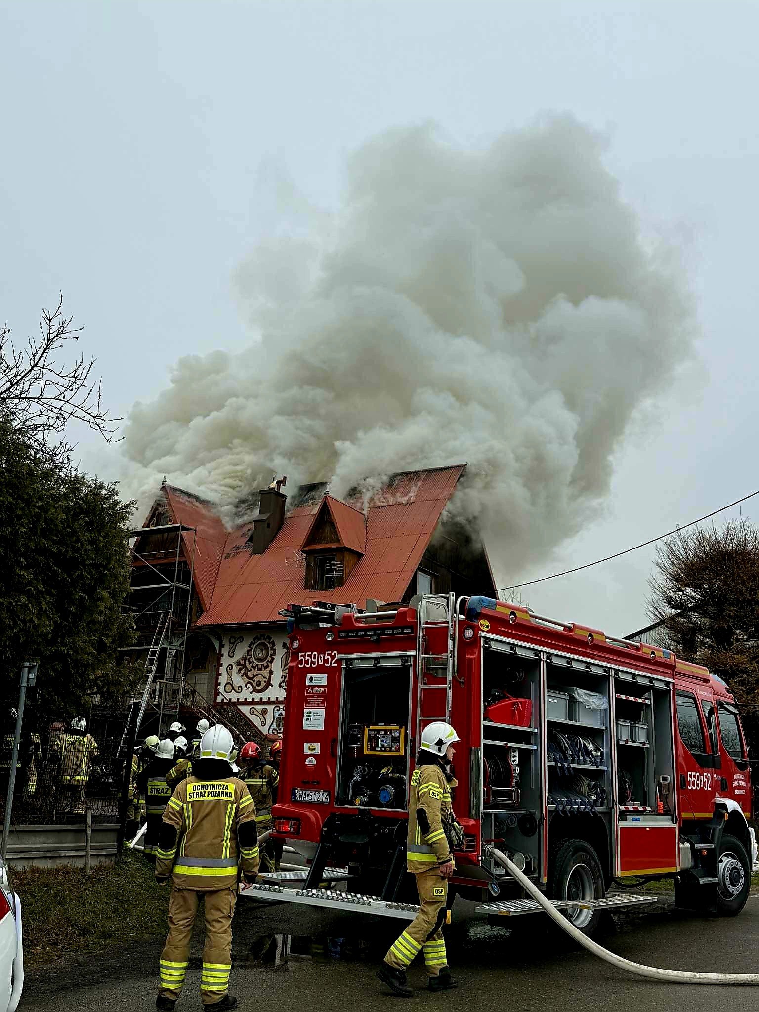 W niedziele 16 listopada 2025 r. o godzinie 10:45 do dyżurnego Stanowiska Kierowania Komendanta Powiatowego w Wadowicach wpłynęło zgłoszenie dotyczące wybuchu pożaru w budynku domu jednorodzinnym w miejscowości Bachowice - gmina Spytkowice. Dyżurny operacyjny Stanowiska Kierowania Komendanta Powiatowego Państwowej Straży Pożarnej natychmiast wysłał na miejsce zdarzenia strażaków z Jednostki Ratowniczo Gaśniczej w Wadowicach, Jednostki Ratowniczo Gaśniczej Andrychów oraz liczne pojazdy Ochotniczych Straży Pożarnych z terenu gminy Spytkowice. Po przyjeździe na miejsce zdarzenia i przeprowadzeniu rozpoznania Kierujący Działaniami Ratowniczymi stwierdził, że pożarem objęty jest poddasze domu jednorodzinnego- właściciel opuścił budynek przed przybyciem służb. Mężczyzna nie doznał obrażeń, jednak źle się poczuł pod wpływem stresu i została zabrany przez zespół ratownictwa medycznego na badania. Strażacy zabezpieczyli teren i podali gaśnicze prądy wody na palące się poddasze. Następnie sprawdzili wnętrze budynku, oddymili pomieszczenia i przeprowadzili dogaszenie nadpalonych elementów konstrukcji. Działania zastępów trwały prawie sześć godzin.