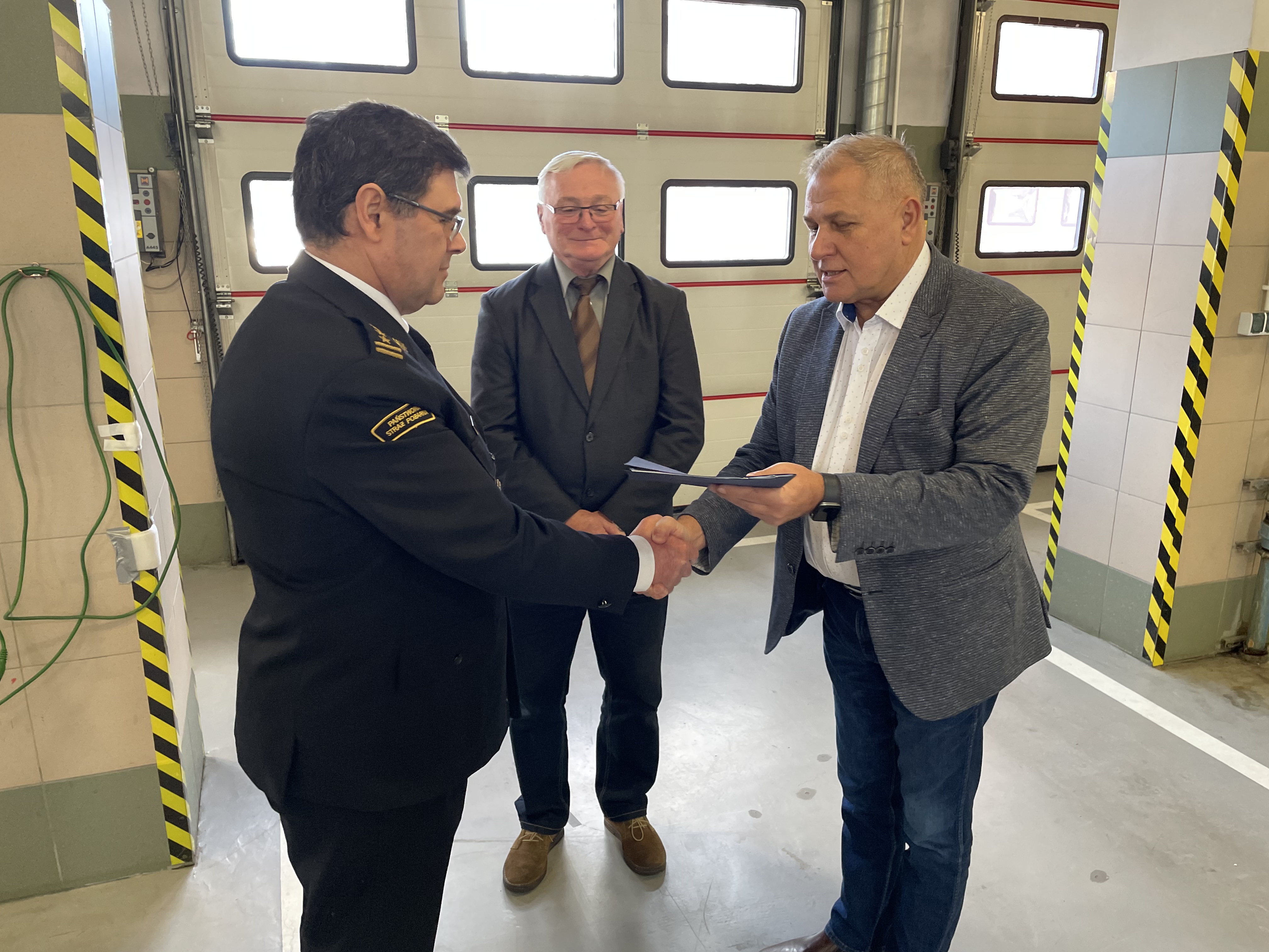 Burmistrz Andrychowa Tomasz Żak oraz wiceprzewodniczący Rady Miejskiej Tadeusz Sarlej przekazali symbolicznie na ręce komendanta powiatowego PSP st. bryg. Pawła Kwarciaka dokumentację oraz kluczyki do pojazdu.