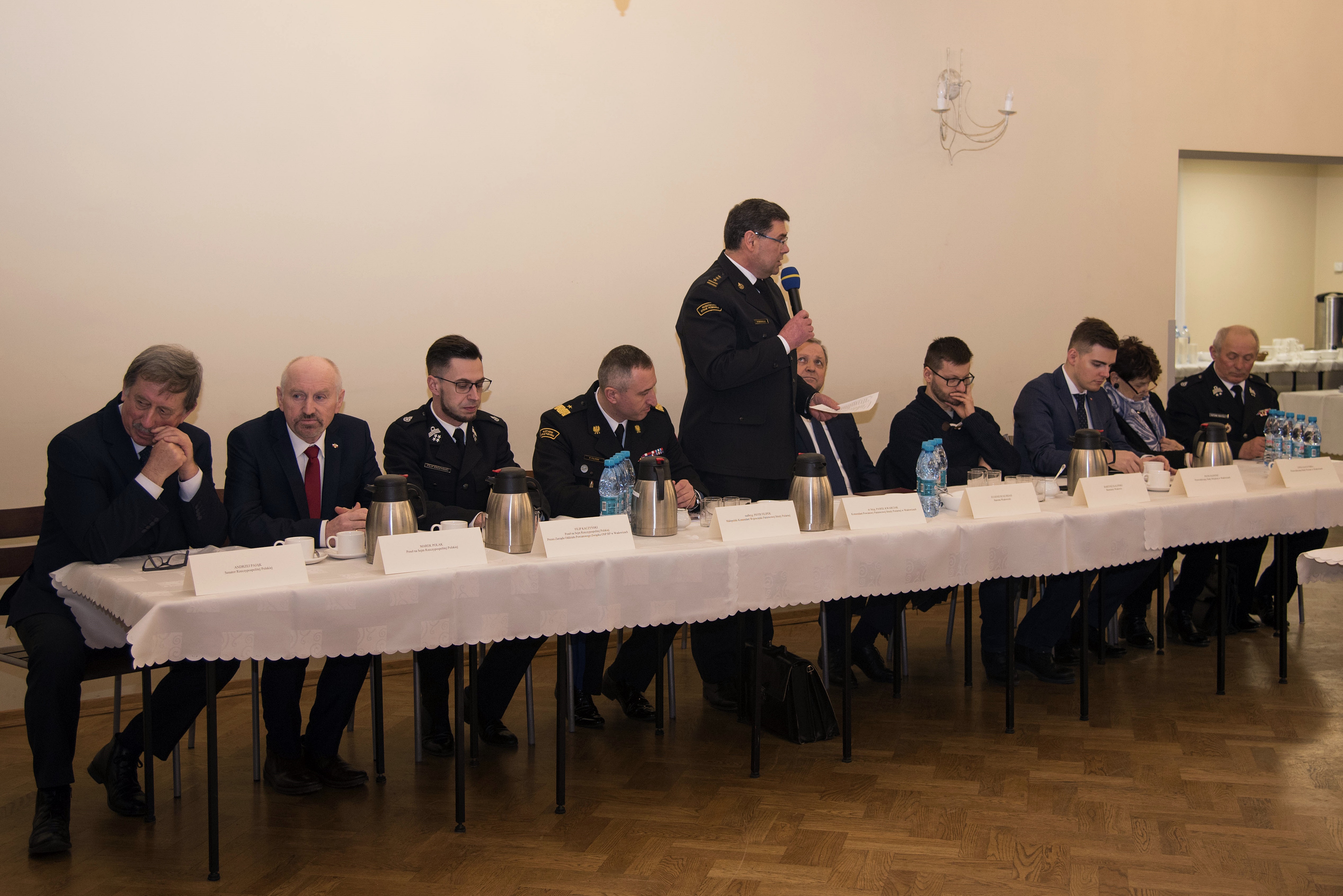 W spotkaniu z Małopolskim Komendantem Wojewódzkim PSP nadbryg. Piotrem Filipkiem wzięli udział funkcjonariusze i pracownicy PSP, prezesi oraz naczelnicy OSP z terenu powiatu wadowickiego oraz zaproszeni goście. Wśród nich byli m.in.: prezes Zarządu Oddziału Powiatowego Związku OSP RP i jednocześnie poseł na Sejm RP Filip Kaczyński, poseł na Sejm RP Marek Polak, senator RP Andrzej Pająk, starosta wadowicki Eugeniusz Kurdas, przewodnicząca Rady Powiatu Zofia Kaczyńska, członek prezydium Zarządu Oddziału Wojewódzkiego Związku OSP RP w Krakowie druh Antoni Kwarciak oraz Przewodniczący Rady Miejskiej w Wadowicach. W odprawie brali też udział burmistrzowie i wójtowie z terenu powiatu wadowickiego. Uczestnicy zapoznali się ze szczegółowym sprawozdaniem z działalności KP PSP w Wadowicach zaprezentowanym w wersji multimedialnej przez komendanta powiatowego PSP w Wadowicach st. bryg. Pawła Kwarciaka ze szczególnym uwzględnieniem współpracy z OSP oraz planowanej inwestycji pn. „Budowa strażnicy Komendy Powiatowej PSP wraz z Jednostką Ratowniczo – Gaśniczą”.
