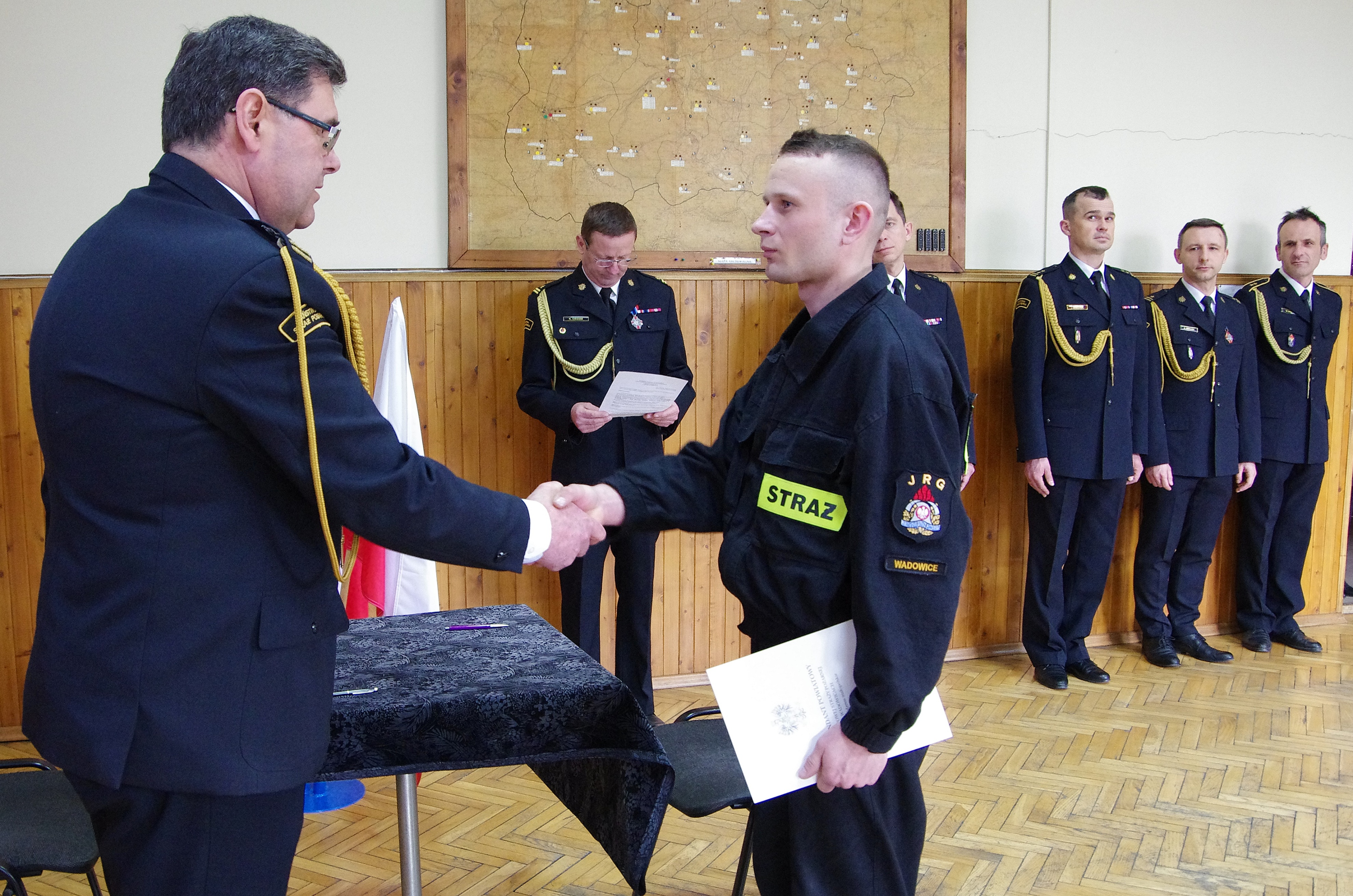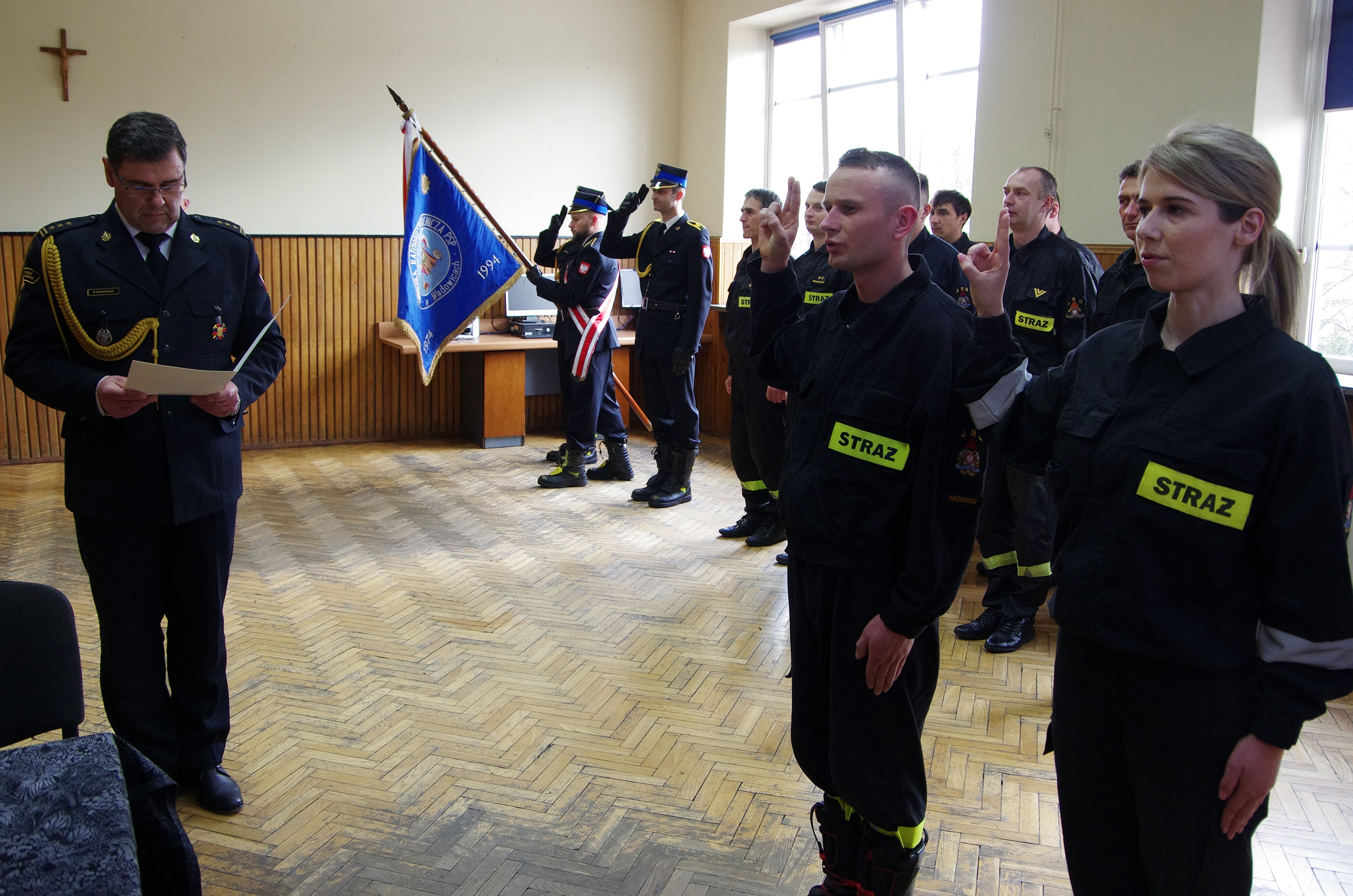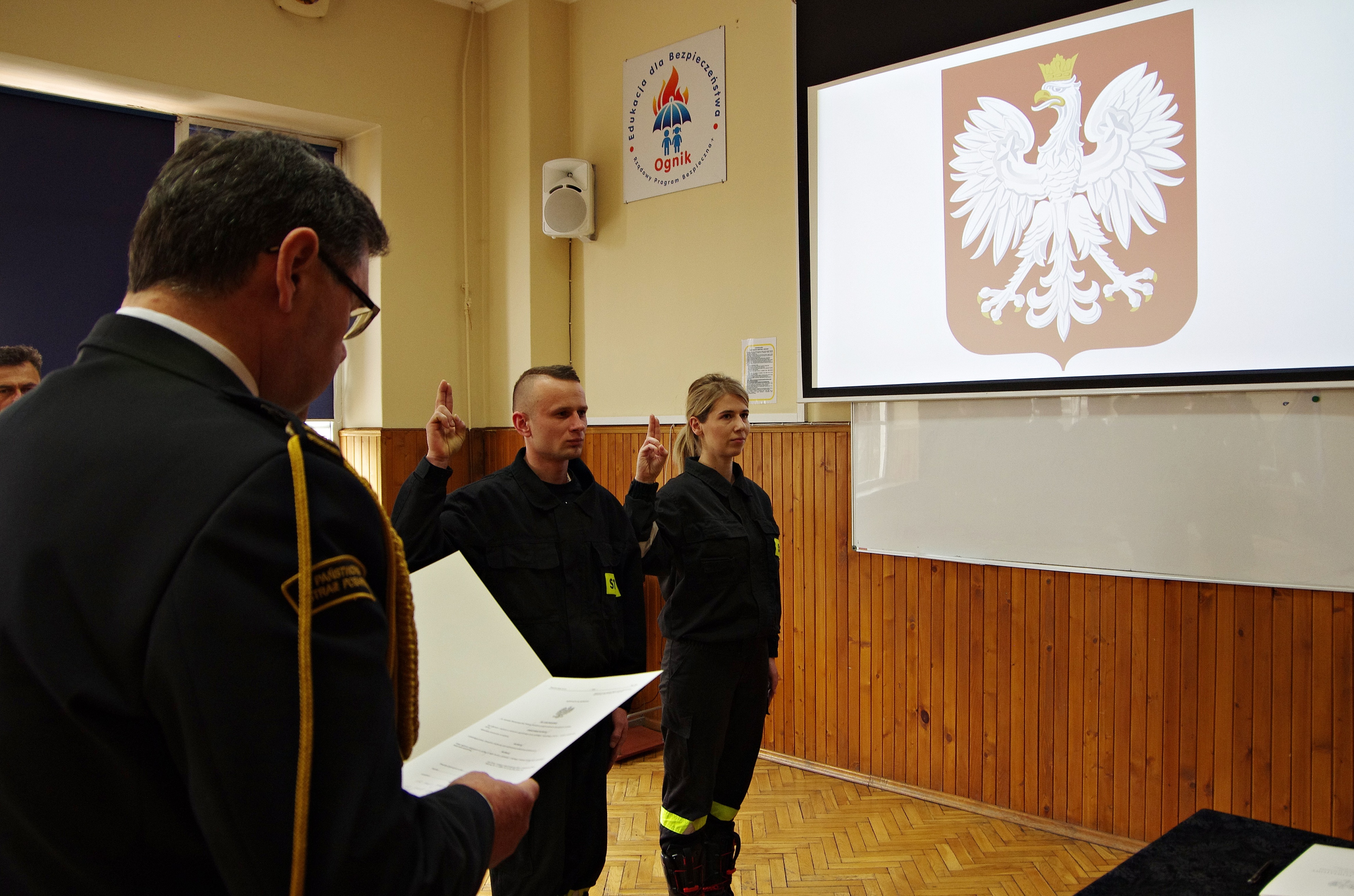 Słowa strażackiego ślubowania od str. Anny Janeczko i str. Jakuba Opyrchała, którzy z przejęciem wypowiadali słowa "...być ofiarnym i mężnym w ratowaniu zagrożonego życia ludzkiego i wszelkiego mienia - nawet z narażeniem życia..." przyjął Komendant Powiatowy PSP w Wadowicach st. bryg. Paweł Kwarciak w asyście swojego zastępcy bryg. Wojciecha Grzybczyka. W ceremonii, która odbywała się w obecności sztandaru wadowickiej Jednostki Ratowniczo-Gaśniczej, uczestniczyło też liczne grono funkcjonariuszy KP PSP w Wadowicach i JRG w Wadowicach.