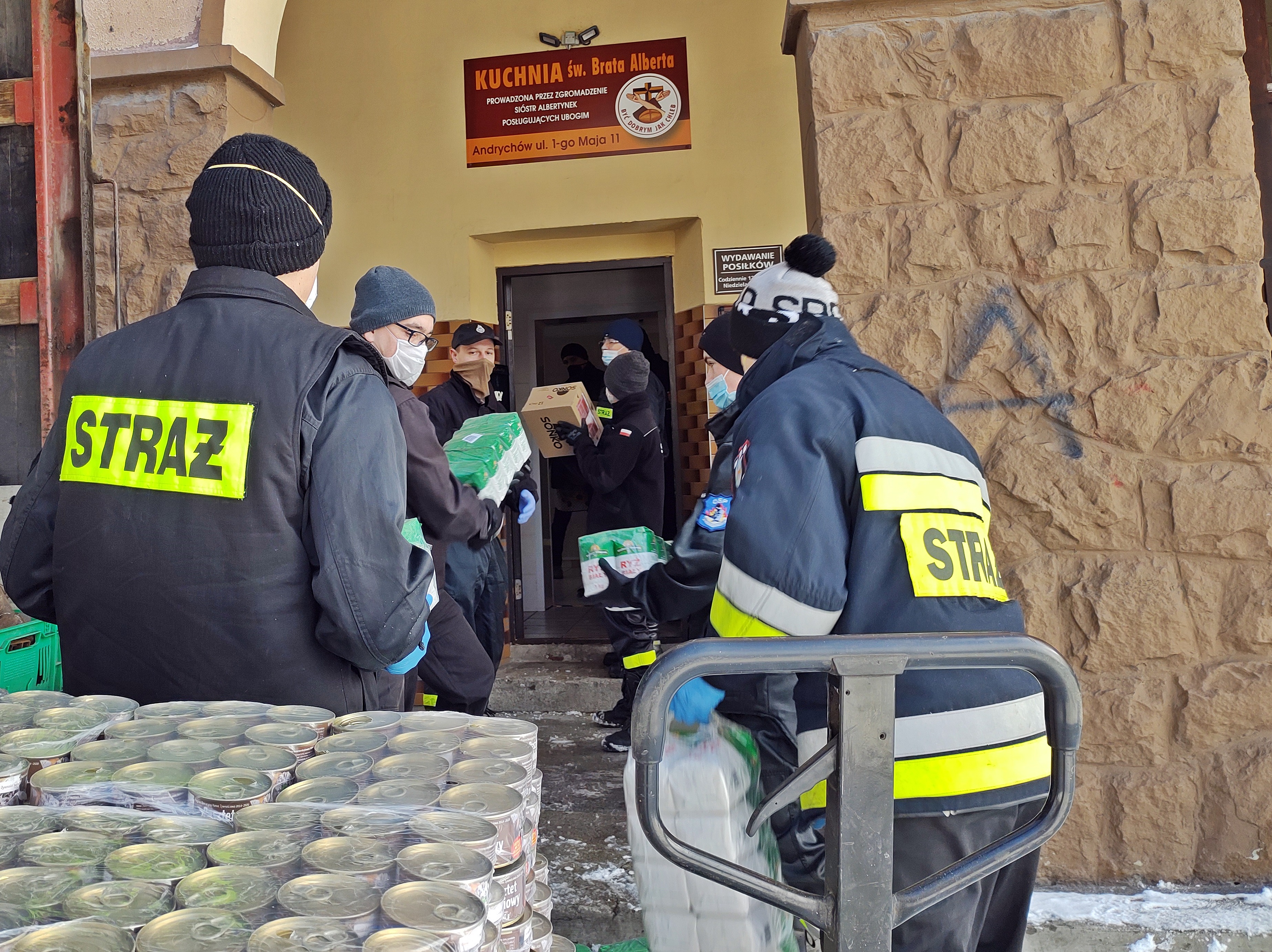 Pomoc licznej grupy strażaków z OSP Andrychów, OSP Sułkowice-Łęg, OSP Targanice Dolne oraz OSP Inwałd polegała na rozładunku kilku ton produktów żywnościowych dostarczonych do andrychowskiej Kuchni św. Brata Alberta, w której przygotowywane są posiłki dla mieszkańców gminy potrzebujących wsparcia w okresie epidemii koronawirusa.