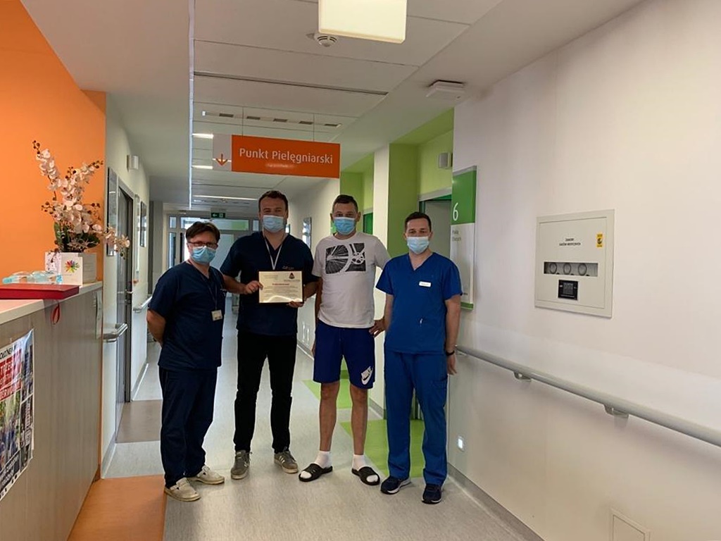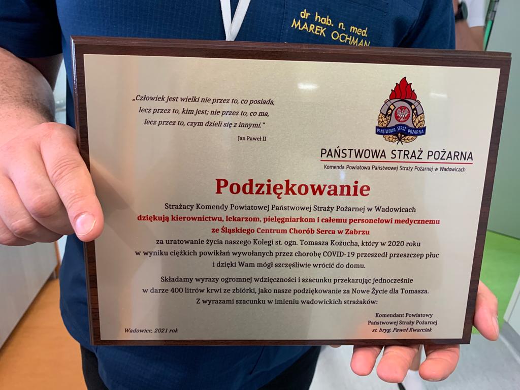 Strażacy i pracownicy cywilni Państwowej Straży Pożarnej w Wadowicach podziękowali kierownictwu, lekarzom, pielęgniarkom i całemu personelowi medycznemu ze Śląskiego Centrum Chorób Serca w Zabrzu za uratowanie życia koledze st. ogn. Tomaszowi Kożuchowi, który we wrześniu 2020 roku uległ zakażeniu wirusem SARS-CoV-2, a w wyniku ciężkich powikłań wywołanych przez chorobę Covid-19 przeszedł przeszczep płuc.