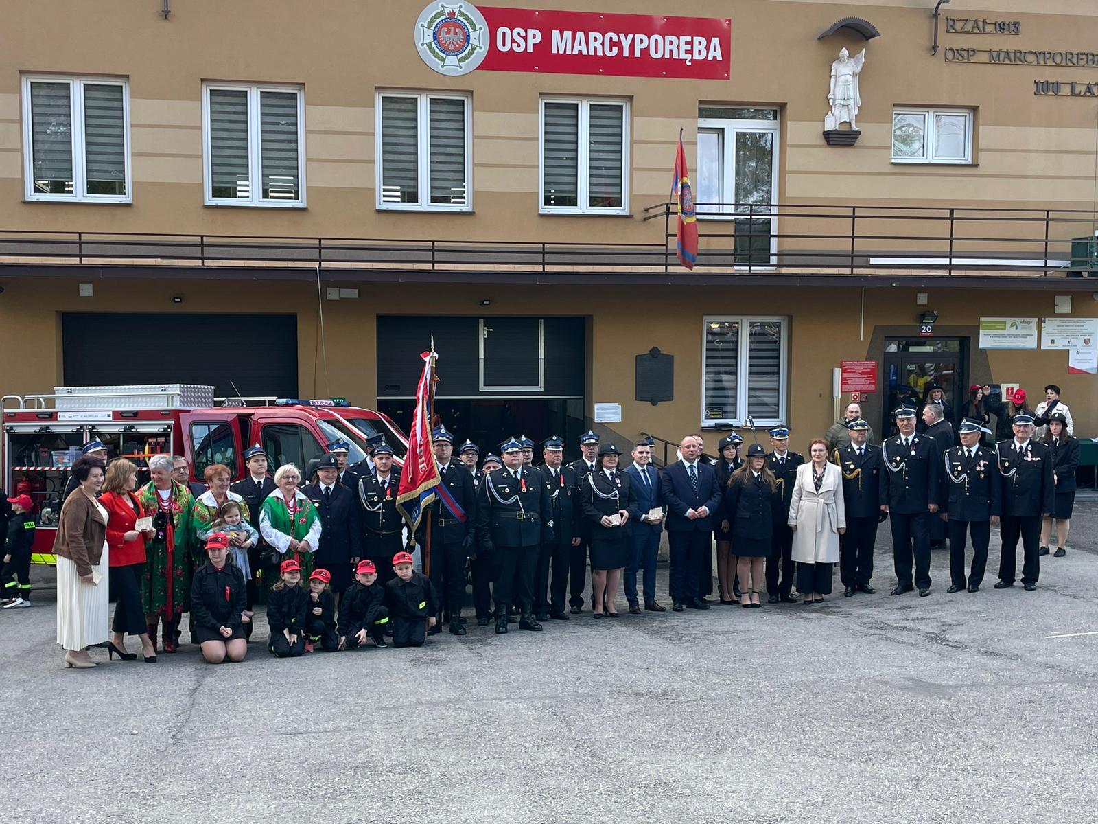 W uroczystości udział wzięli: Wojewoda Małopolski Krzysztof Jan Klęczar, Małopolski Komendant Wojewódzki PSP bryg. Przemysław Przęczek, Wójt Gminy Brzeźnica, a jednocześnie prezes Zarządu Oddziału Gminnego Związku OSP RP w Brzeźnicy druh Bogusław Antos, duchowieństwo, sołtysi sołectw gminy Brzeźnica, prezesi i dyrektorzy instytucji, firm i zakładów wspierających jednostkę OSP w Marcyporębie.