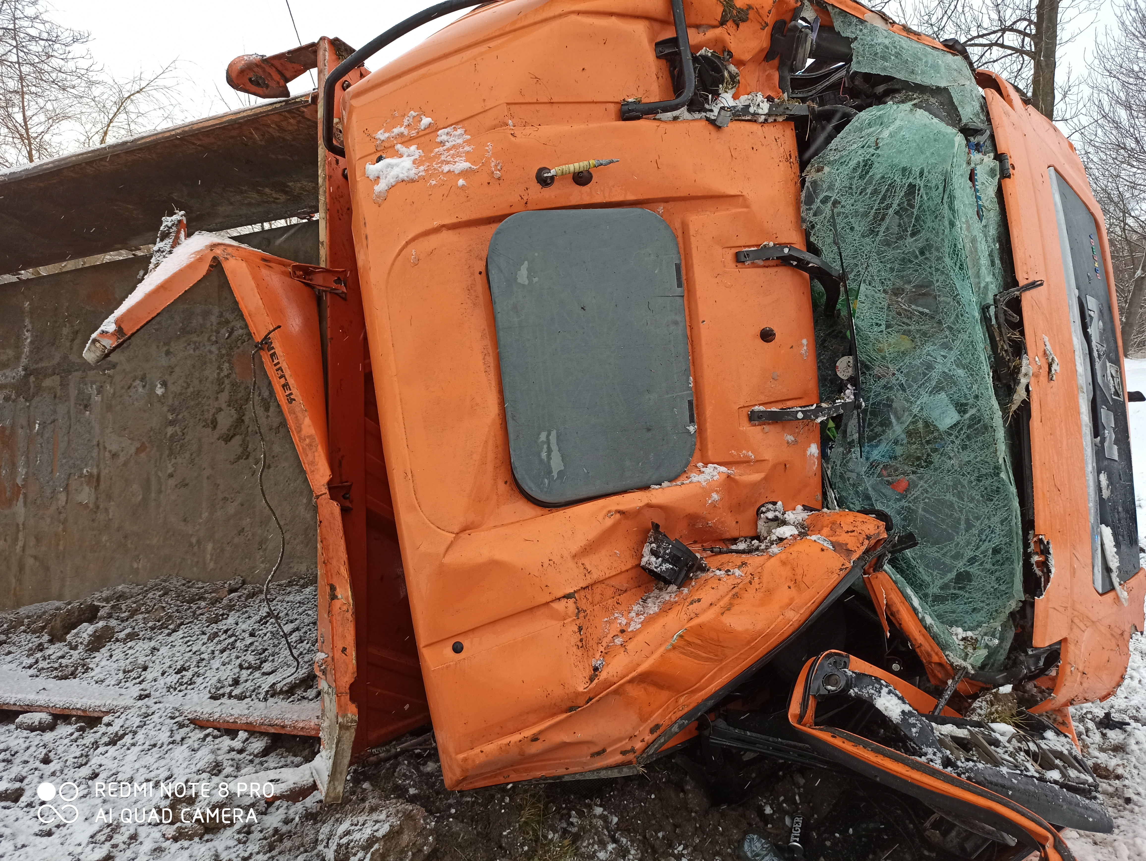 Po przybyciu na miejsce zdarzenia i przeprowadzeniu rozpoznania przez dowódcę pierwszego zastępu okazało się, że samochód ciężarowy przewożący ładunek na śliskiej nawierzchni wypadł z drogi, przetoczył się i zatrzymał na pobliskim polu, leżąc na boku. Kierujący samochodem ciężarowym o własnych siłach częściowo wydostał się na zewnątrz zmiażdżonej kabiny.