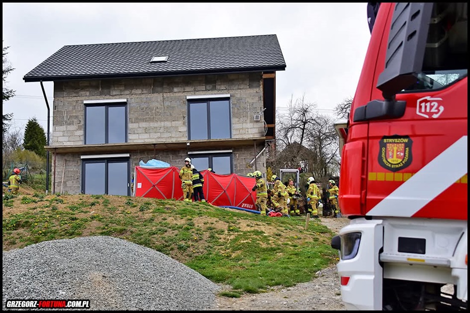 Dnia 11.04.2026 roku o godz. 12:05 do Stanowiska Kierowania Komendanta Powiatowego Państwowej Straży Pożarnej w Wadowicach wpłynęło zgłoszenie o mężczyźnie, który został zasypany w głębokim wykopie ziemnym w miejscowości Stryszów. Do zdarzenia zadysponowano 4 zastępy z Jednostki Ratowniczo-Gaśniczej w Wadowicach oraz 4 zastępy Ochotniczych Straży Pożarnych z terenu gminy Stryszów. Po przyjeździe na miejsce zdarzenia i przeprowadzeniu rozpoznania kierujący działaniem ratowniczym stwierdził, że podczas prac ziemnych w głębokim wykopie, przysypany został mężczyzna przez dużą ilość ziemi. Działania jednostek ochrony przeciwpożarowej polegały na zabezpieczeniu obszaru wykopu przed dalszym osuwaniem się ziemi, odkopaniu osoby poszkodowanej znajdującej się w głębokim wykopie przy użyciu łopat oraz ewakuowaniu mężczyzny z zagrożonego obszaru i przekazaniu zespołowi ratownictwa medycznego. Następnie działania straży pożarnej oraz zespołu ratownictwa medycznego skupiały się na prowadzeniu resuscytacji krążeniowo – oddechowej. Po udzieleniu pomocy, poszkodowany mężczyzna został przetransportowany lotniczym pogotowiem ratunkowym do szpitala. W trwającej ponad 2 godziny akcji wzięło udział 9 zastępów i 37 strażaków PSP i OSP.