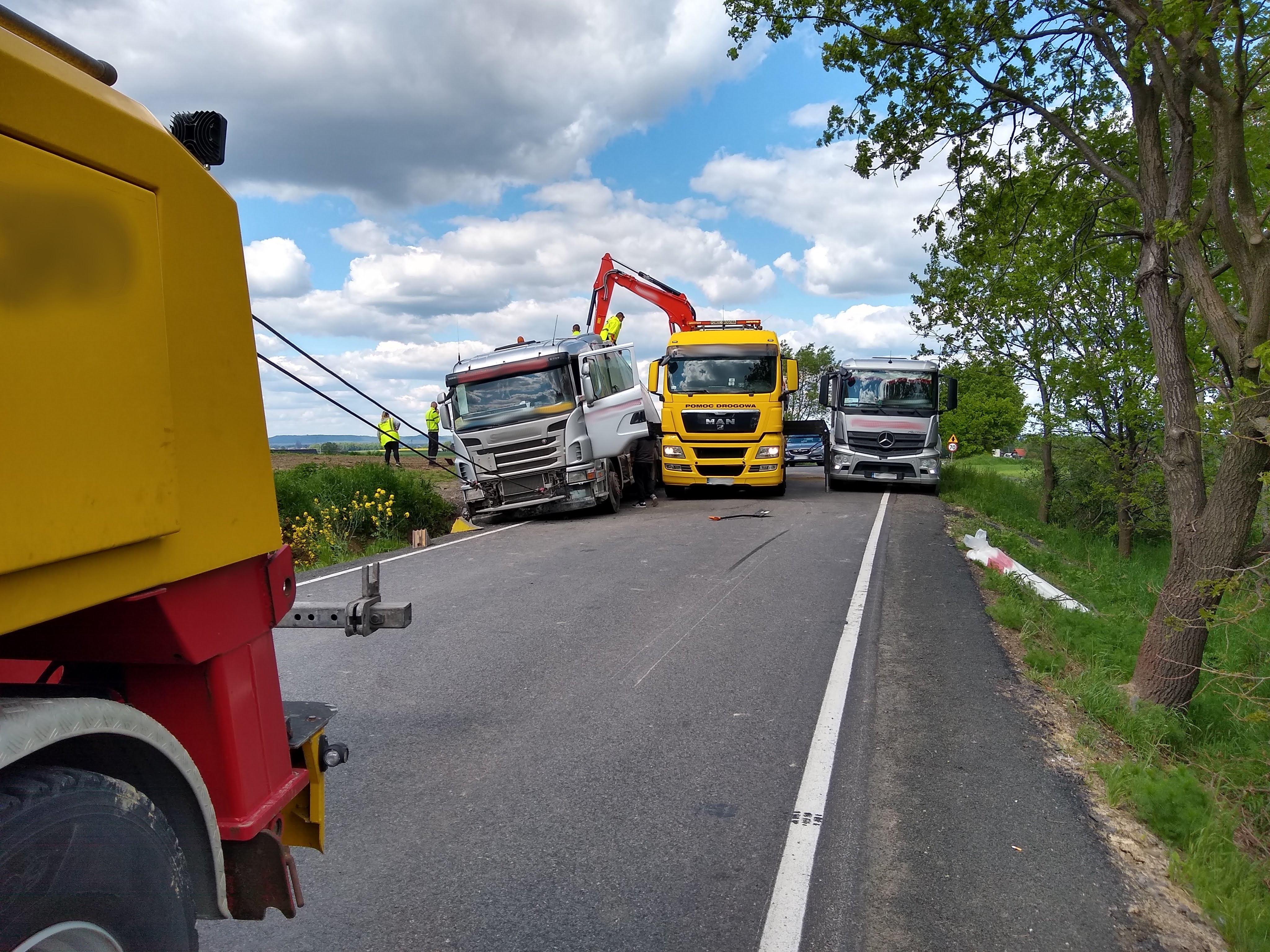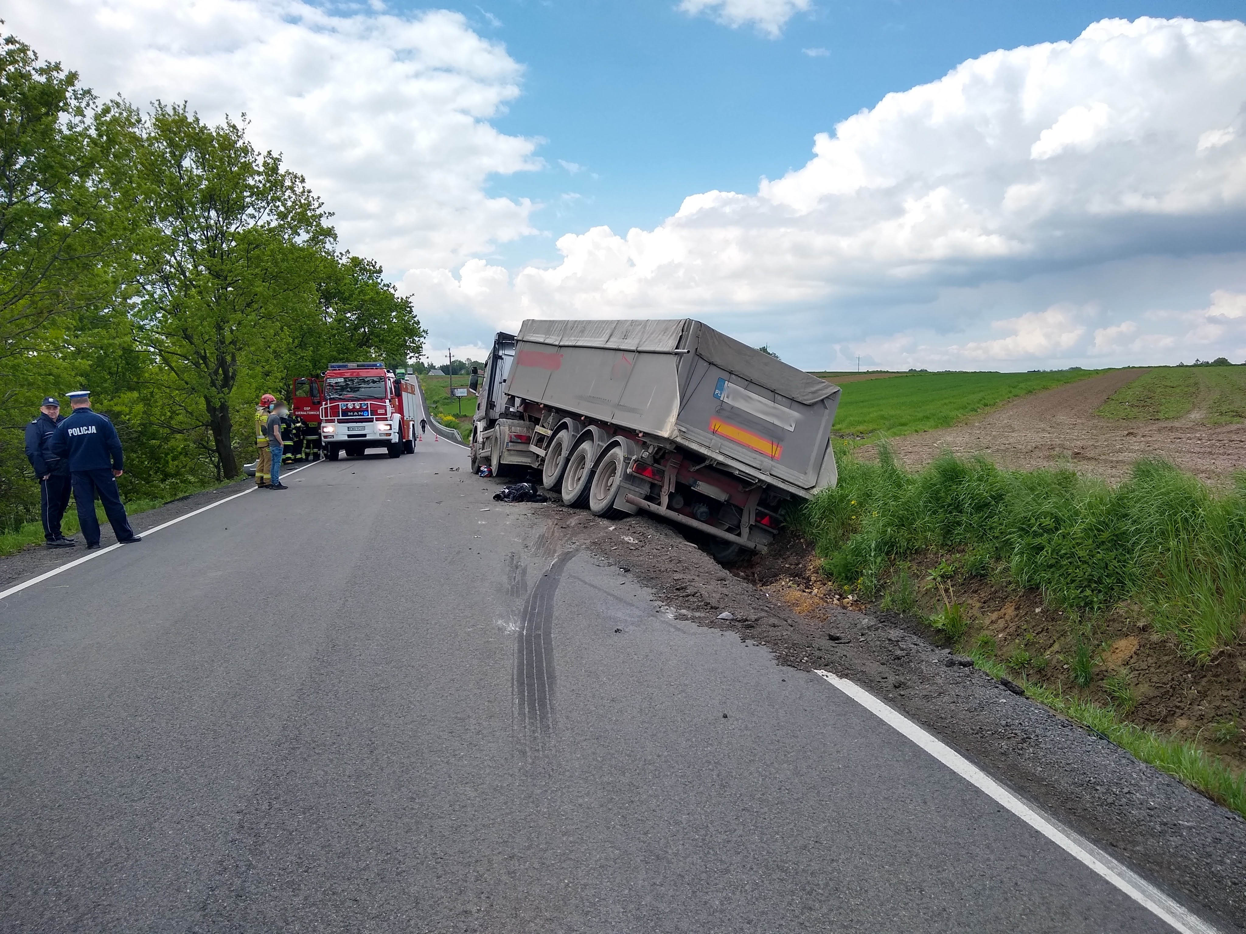 Samochód ciężarowy w czasie zdarzenia wpadł do przydrożnego rowu. Usunięciem pojazdu zajęła się specjalistyczna firma.