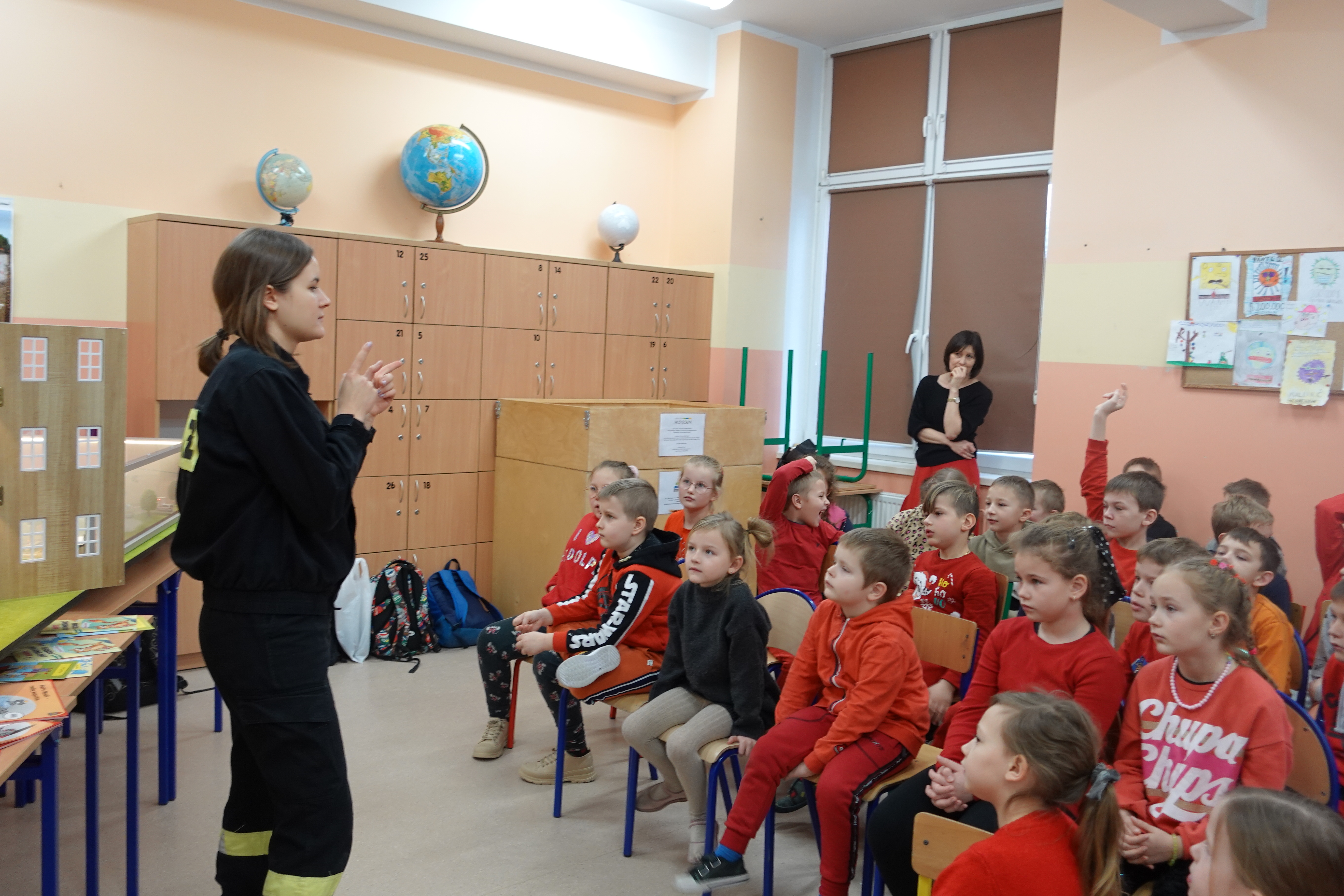Każdy uczeń usłyszał o specyfice zawodu strażaka, miejscu pracy i czasu służby oraz miał możliwość ubioru w pełne umundurowanie w jakim pracują strażacy podczas działań ratowniczo-gaśniczych.