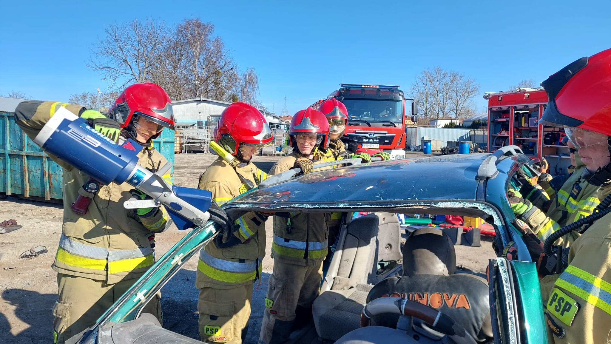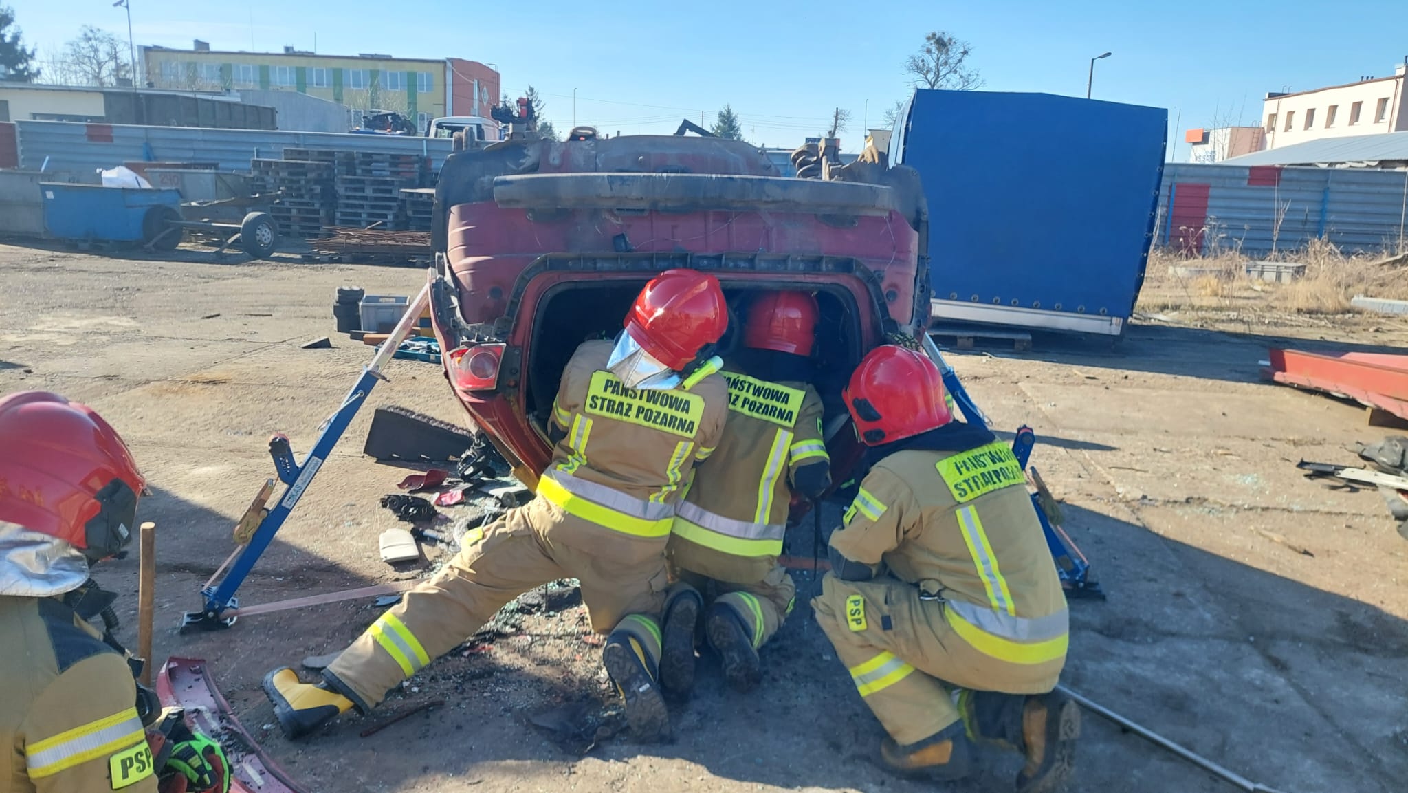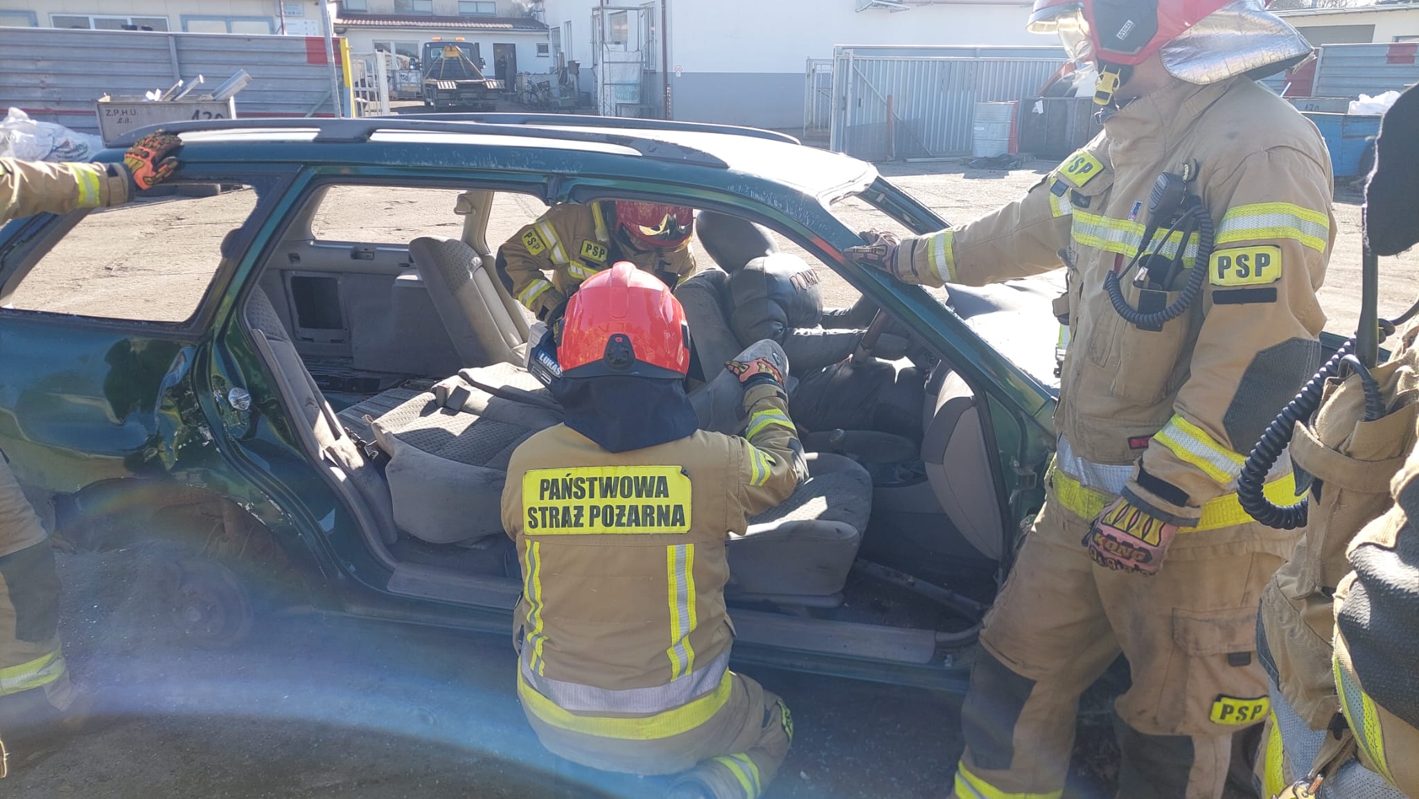 Zajęcia zostały przeprowadzone na terenie złomowiska, co pozwoliło na realistyczne odwzorowanie sytuacji, z jakimi strażacy mogą spotkać się podczas działań przy wypadkach drogowych.