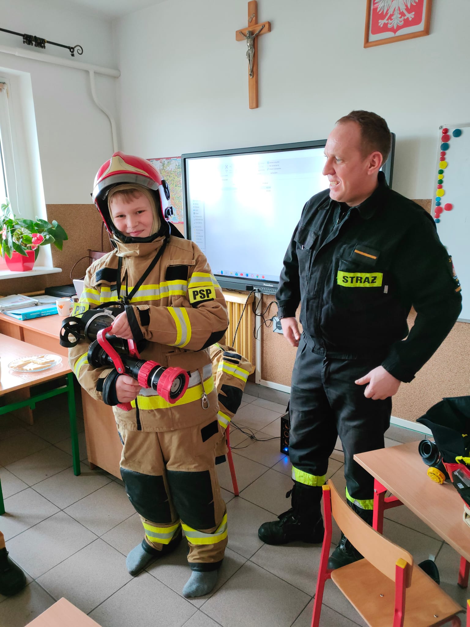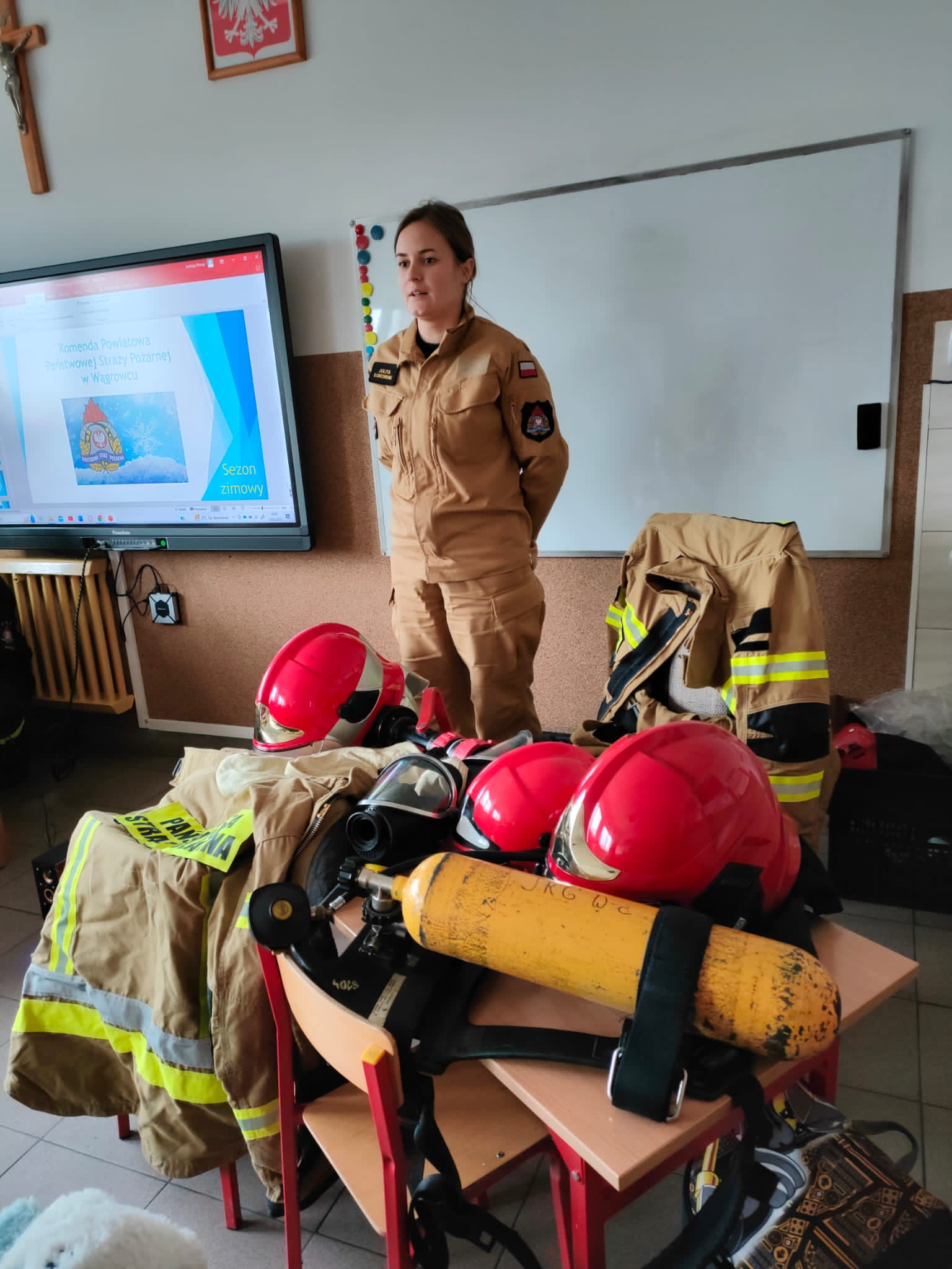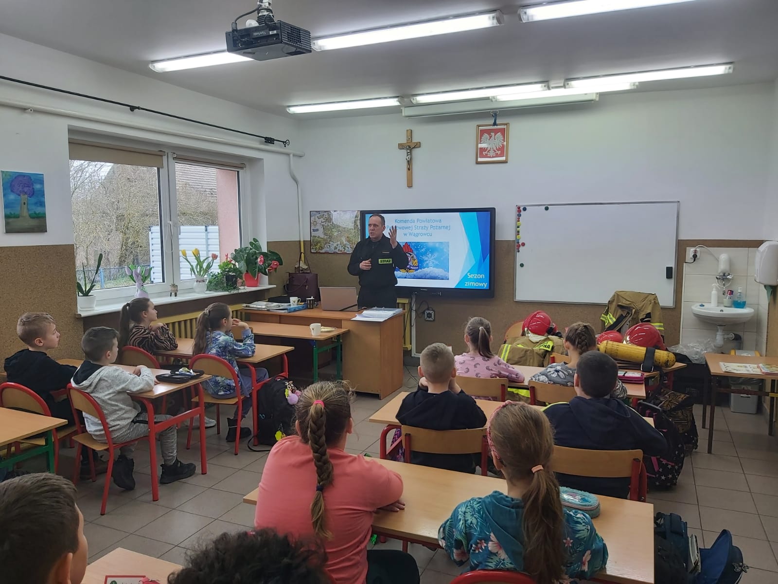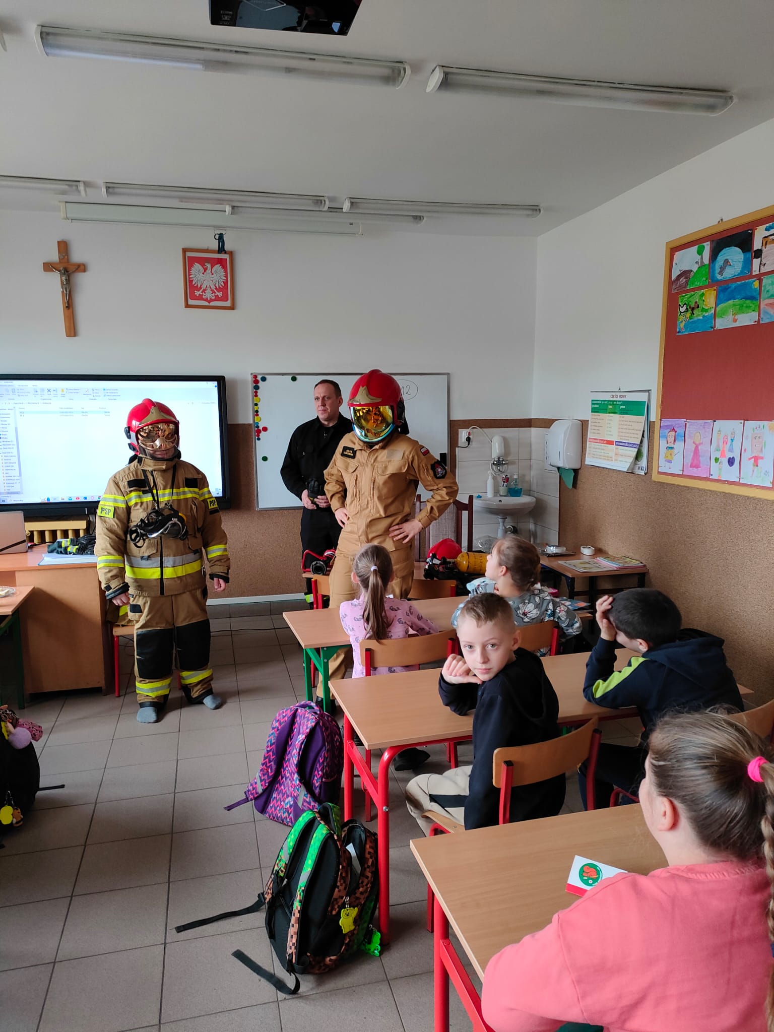 Każdy uczeń usłyszał o specyfice zawodu strażaka, miejscu pracy i czasu służby oraz miał możliwość ubioru w pełne umundurowanie w jakim pracują strażacy podczas działań ratowniczo-gaśniczych. Przypomniano również numery alarmowe oraz zasady prawidłowego zgłoszenia zdarzenia.