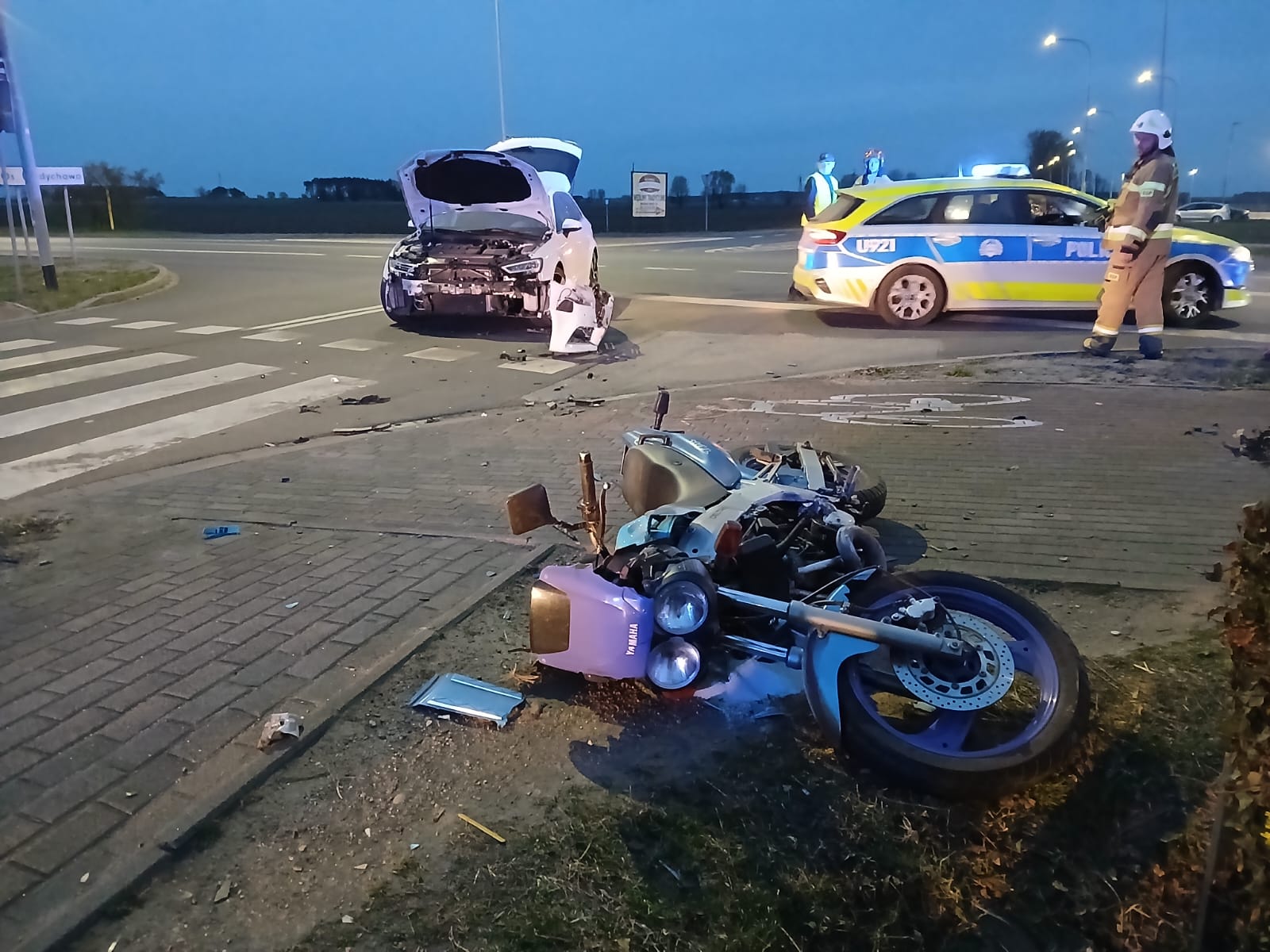 Do pierwszego zdarzenia doszło w wyniku zderzenia motocykla z samochodem osobowym. Po przybyciu na miejsce ustalono, że motocykl znajdował się na jezdni, natomiast pojazd osobowy poza drogą – na terenie posesji. Poszkodowany motocyklista był przytomny i doznał urazu obu nadgarstków. Strażacy zabezpieczyli miejsce zdarzenia oraz udzielili kwalifikowanej pierwszej pomocy. Następnie poszkodowany został przekazany zespołowi ratownictwa medycznego i przetransportowany do szpitala. Na miejscu usunięto również płyny eksploatacyjne.
