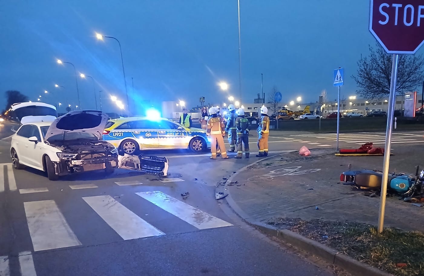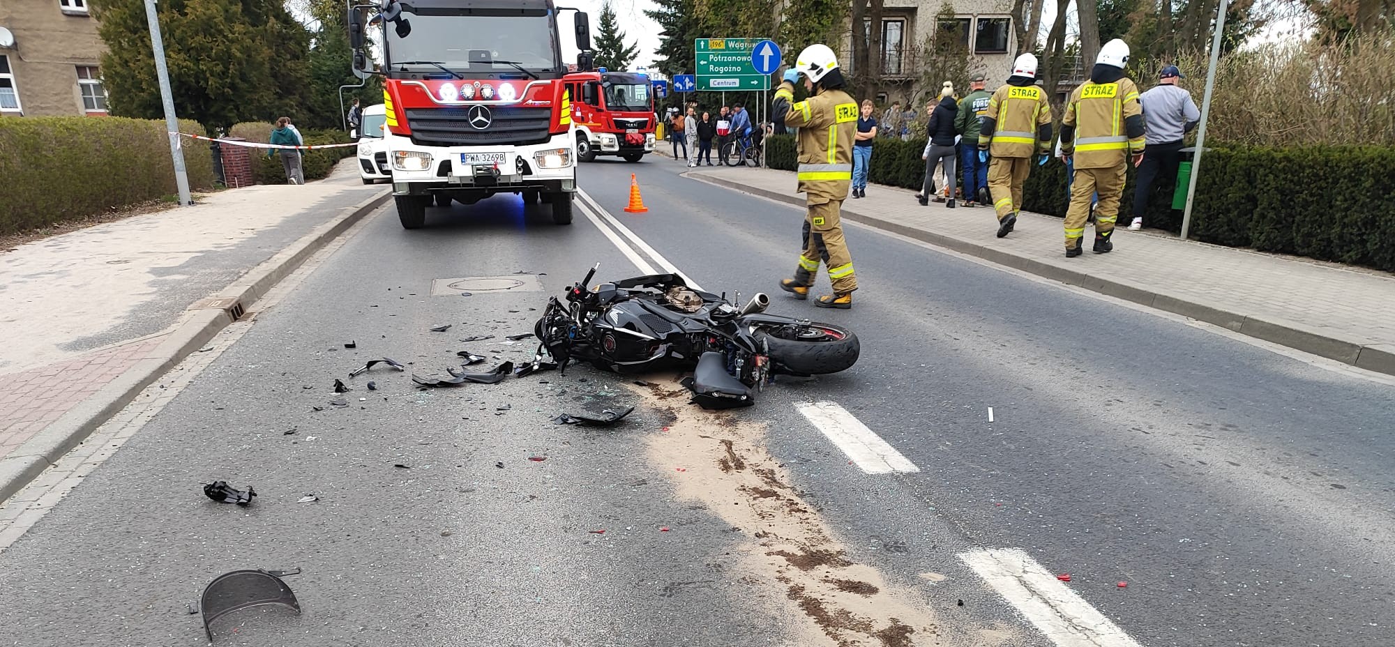 Do trzeciego zdarzenia doszło w Wągrowcu na skrzyżowaniu ulic Wierzbowej i 11 Listopada, gdzie ponownie doszło do zderzenia motocykla z samochodem osobowym. Poszkodowany motocyklista był przytomny i doznał poważnych obrażeń, w tym otwartego złamania lewej nogi oraz urazu barku. Strażacy zabezpieczyli miejsce zdarzenia i udzielili kwalifikowanej pierwszej pomocy. Po przekazaniu poszkodowanego zespołowi ratownictwa medycznego podjęto decyzję o jego transporcie do szpitala w Poznaniu przy użyciu Lotniczego Pogotowia Ratunkowego. Na miejscu zdarzenia usunięto także płyny eksploatacyjne.