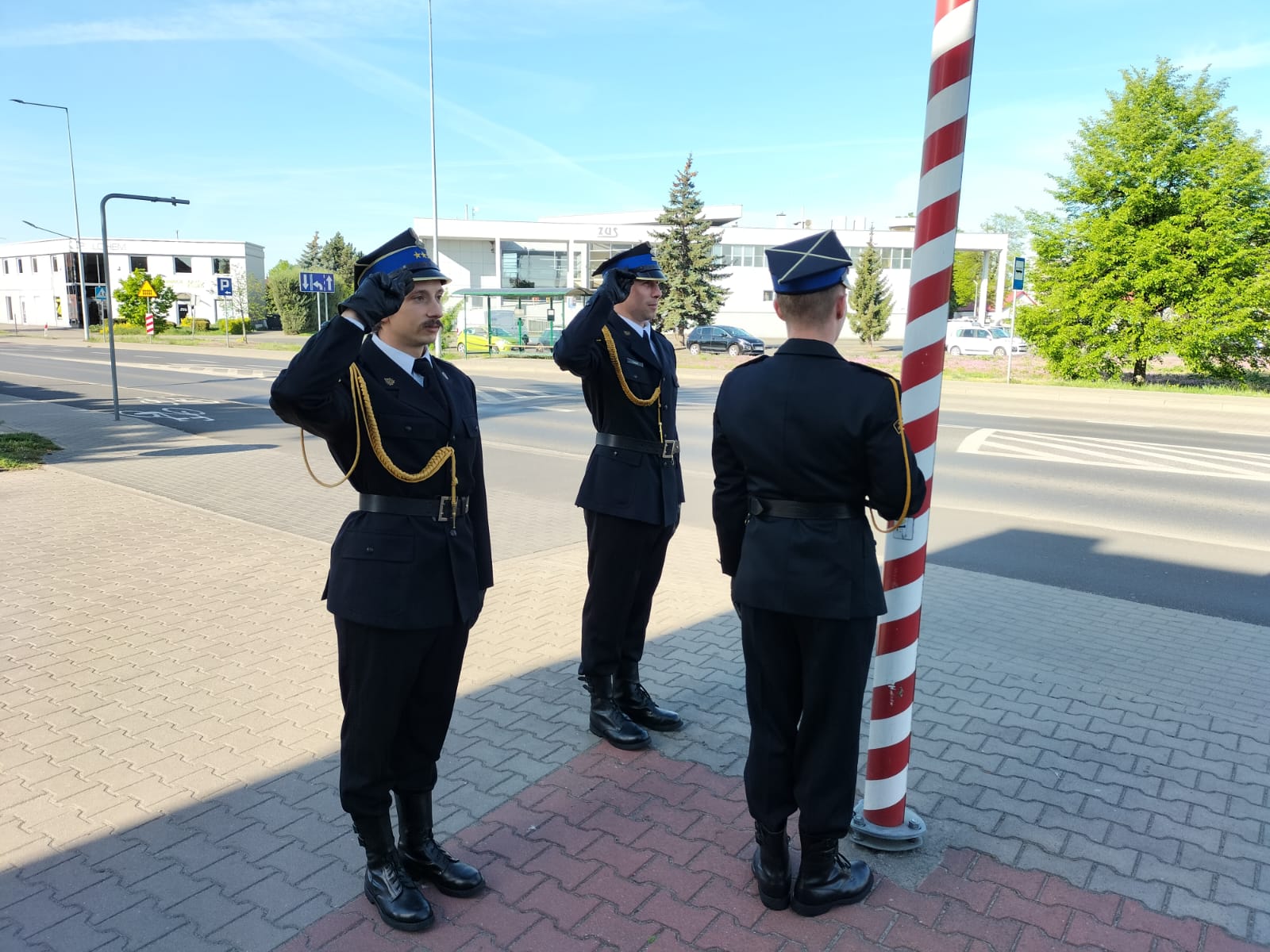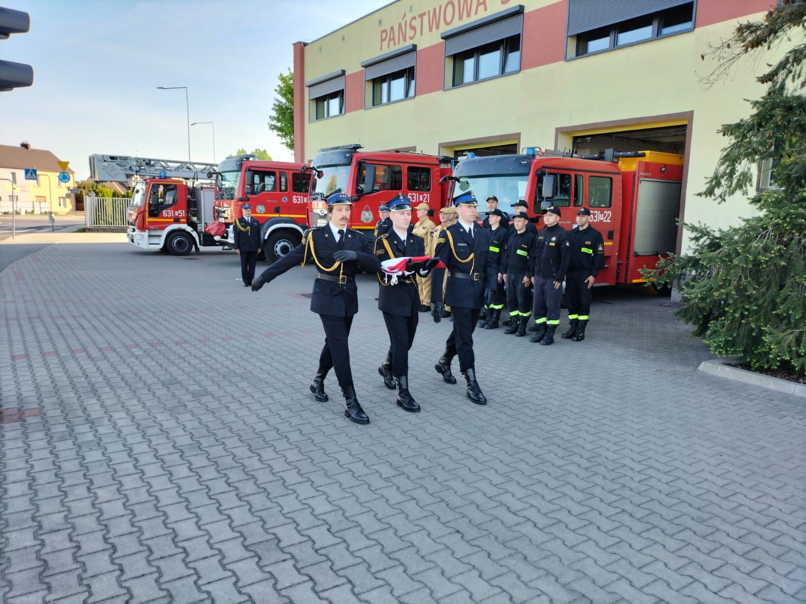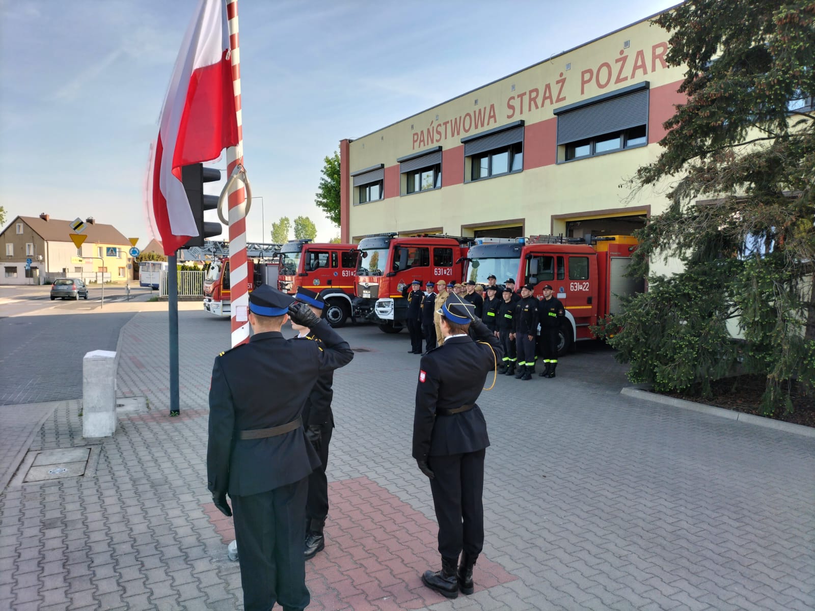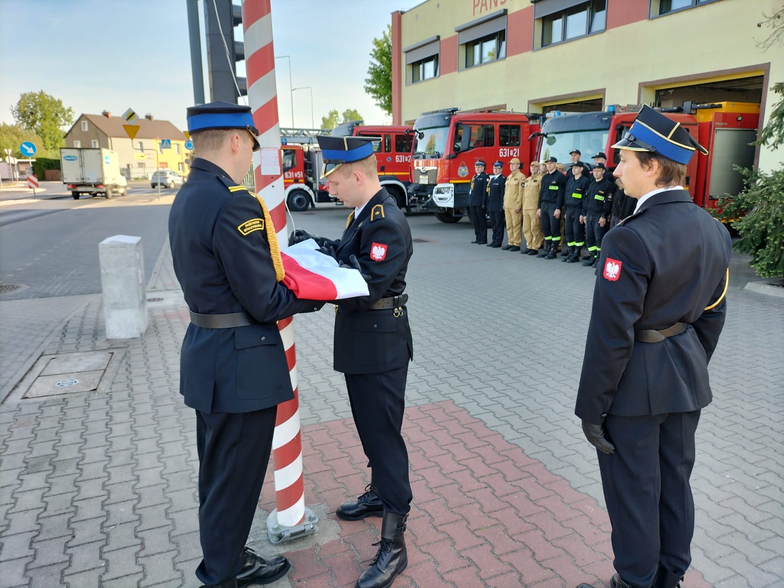 Strażacy, jak co roku w drugi dzień maja, podczas uroczystej zmiany służbowej wywiesili na maszcie znajdującym się przed budynkiem Komendy białą czerwoną flagę.